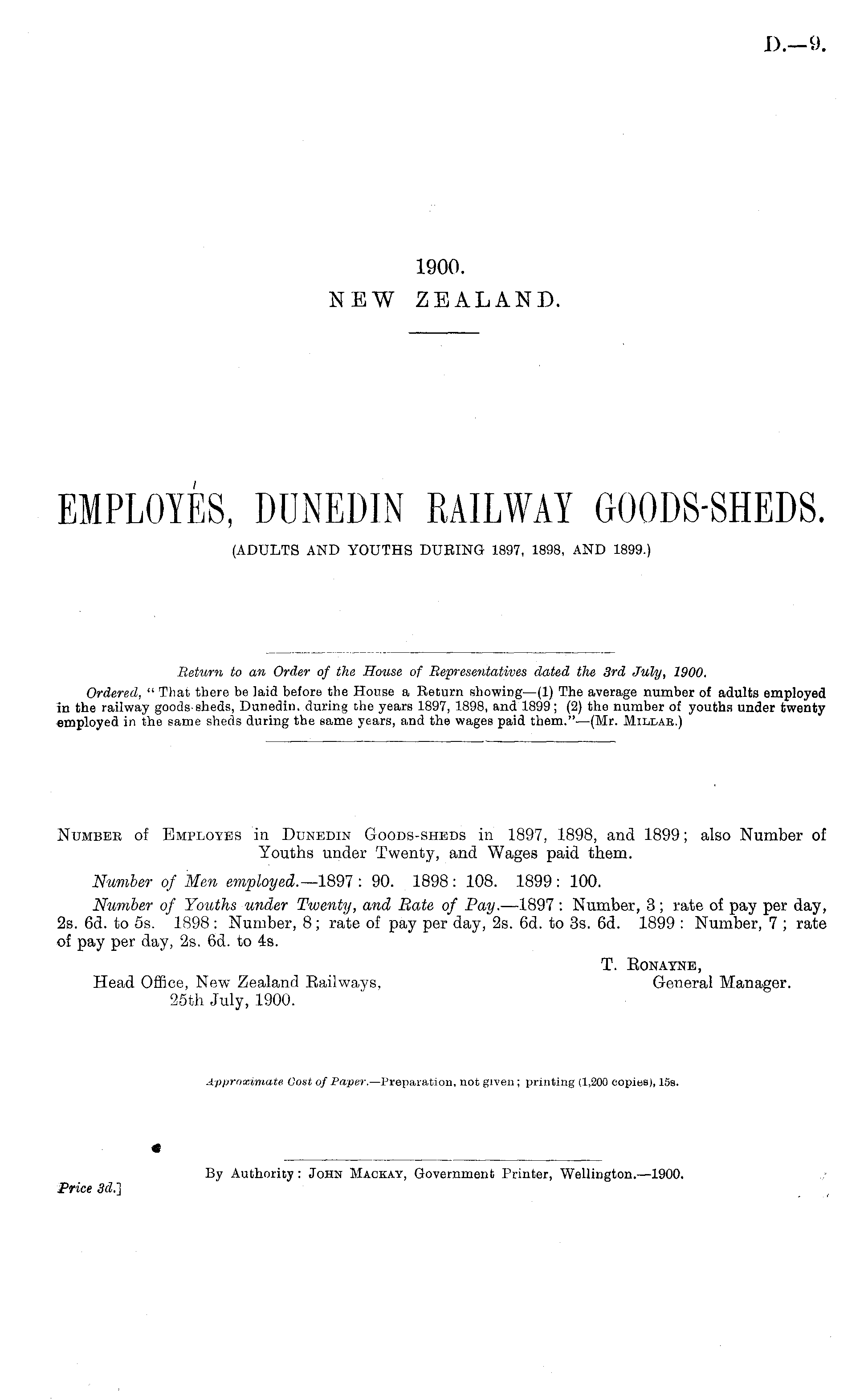 Numbbe of Employes in Dunedin Goods-sheds in 1897, 1898, and 1899; also Number of Youths under Twenty, and Wages paid them. Number of Men employed.— lB97 : 90. 1898 : 108. 1899 : 100. timber of Youths under Tiventy, and Rate of Pay. —lB97 : Number, 3; rate of pay per day, 2s. 6d. to ss. 1898 : Number, 8; rate of pay per day, 2s. 6d. to 3s. 6d. 1899 : Number, 7 ; rate of pay per day, 2s. 6d. to 4s. T. Ronayne, Head Office, New Zealand Railways, General Manager. 25th July, 1900. Approximate Cost of Paper. —Preparation, not given ; printing (1,200 copies), 15s.