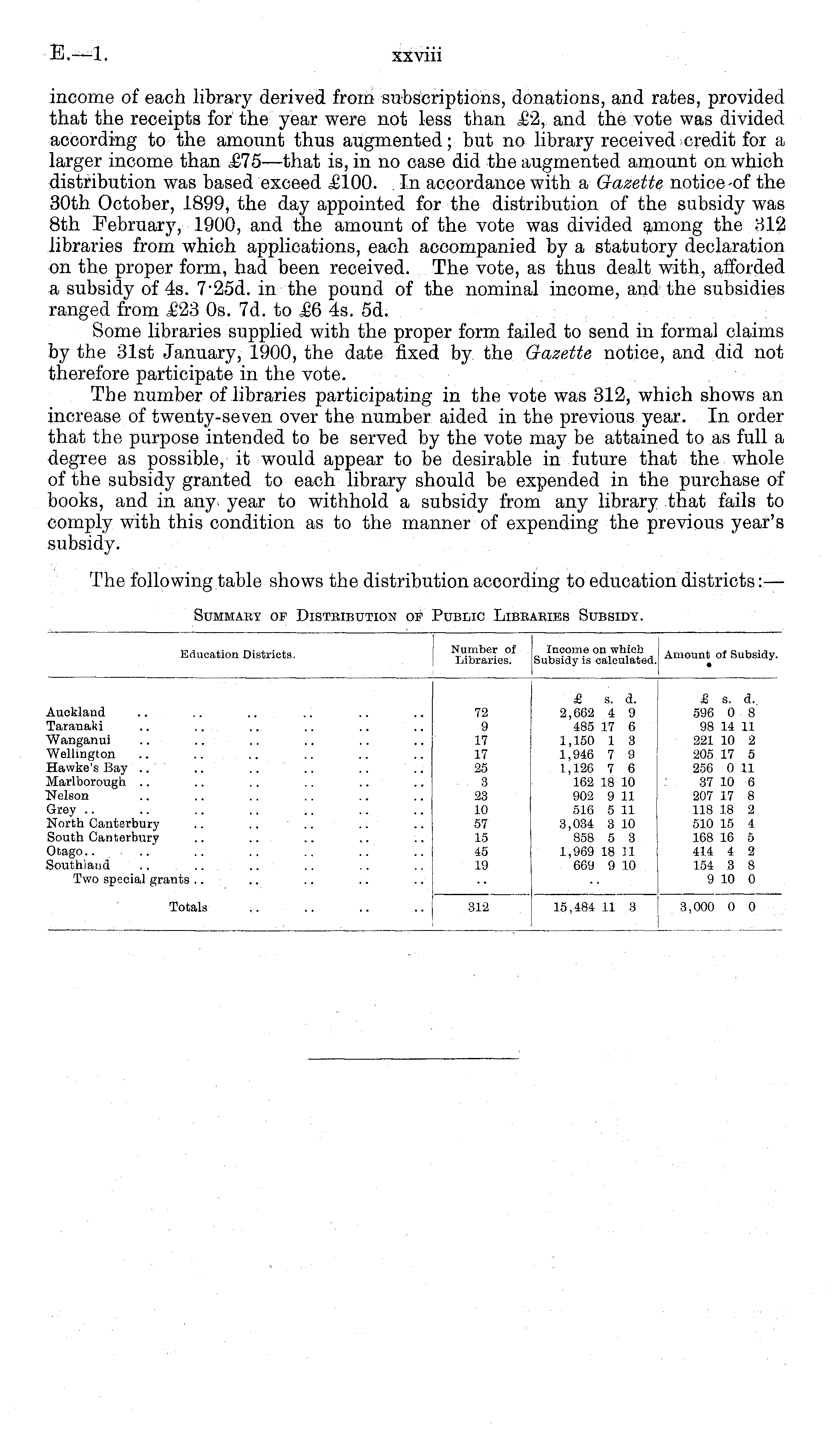 income of each library derived from subscriptions, donations, and rates, provided that the receipts for the year were not less than £2, and the vote was divided according to the amount thus augmented; but no library received credit for a larger income than £75 —that is, in no case did the augmented amount on which distribution was based exceed £100. In accordance with a Gazette notice of the 30th October, 1899, the day appointed for the distribution of the subsidy was Bth February, 1900, and the amount of the vote was divided among the 312 libraries from which applications, each accompanied by a statutory declaration on the proper form, had been received. The vote, as thus dealt with, afforded a subsidy of 4s. 7'25d. in the pound of the nominal income, and the subsidies ranged from £23 os. 7d. to £6 4s. sd. Some libraries supplied with the proper form failed to send in formal claims by the 31st January, 1900, the date fixed by the Gazette notice, and did not therefore participate in the vote. The number of libraries participating in the vote was 312, which shows an increase of twenty-seven over the number aided in the previous year. In order that the purpose intended to be served by the vote may be attained to as full a degree as possible, it would appear to be desirable in future that the whole of the subsidy granted to each library should be expended in the purchase of books, and in any year to withhold a subsidy from any library that fails to comply with this condition as to the manner of expending the previous year's subsidy. The following table shows the distribution according to education districts:—