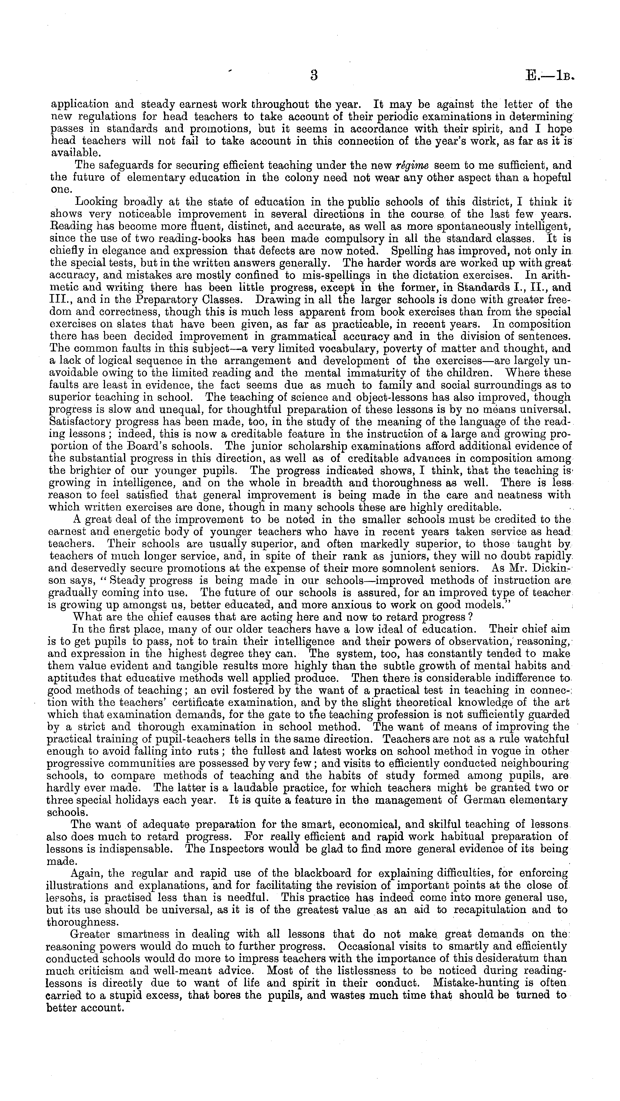 application and steady earnest work throughout the year. It may be against the letter of the new regulations for head teachers to take account of their periodic examinations in determining passes in standards and promotions, but it seems in accordance with their spirit, and I hope head teachers will not fail to take account in this connection of the year's work, as far as it is available. The safeguards for securing efficient teaching under the new regime seem to me sufficient, and the future of elementary education in the colony need not wear any other aspect than a hopeful one. Looking broadly at the state of education in the public schools of this district, I think it shows very noticeable improvement in several directions in the course of the last few years. Reading has become more fluent, distinct, and accurate, as well as more spontaneously intelligent, since the use of two reading-books has been made compulsory in all the standard classes. It is chiefly in elegance and expression that defects are now noted. Spelling has improved, not only in the special tests, but in the written answers generally. The harder words are worked up with great accuracy, and mistakes are mostly confined to mis-spellings in the dictation exercises. In arithmetic and writing there has been little progress, except in the former, in Standards 1., 11., and 111., and in the Preparatory Classes. Drawing in all the larger schools is done with greater freedom and correctness, though this is much less apparent from book exercises than from the special exercises on slates that have been given, as far as practicable, in recent years. In composition there has been decided improvement in grammatical accuracy and in the division of sentences. The common faults in this subject—a very limited vocabulary, poverty of matter and thought, and a lack of logical sequence in the arrangement and development of the exercises—are largely unavoidable owing to the limited reading and the mental immaturity of the children. Where these faults are least in evidence, the fact seems due as much to family and social surroundings as to superior teaching in school. The teaching of science and object-lessons has also improved, though progress is slow and unequal, for thoughtful preparation of these lessons is by no means universal. Satisfactory progress has been made, too, in the study of the meaning of the language of the reading lessons ; indeed, this is now a creditable feature in the instruction of a large and growing proportion of the Board's schools. The junior scholarship examinations afford additional evidence of the substantial progress in this direction, as well as of creditable advances in composition among the brighter of our younger pupils. The progress indicated shows, I think, that the teaching is' growing in intelligence, and on the whole in breadth and thoroughness as well. There is less reason to feel satisfied that general improvement is being made in the care and neatness with which written exercises are done, though in many schools these are highly creditable. A great deal of the improvement to be noted in the smaller schools must be credited to the earnest and energetic body of younger teachers who have in recent years taken service as head teachers. Their schools are usually superior, and often markedly superior, to those taught by teachers of much longer service, and, in spite of their rank as juniors, they will no doubt rapidly: and deservedly secure promotions at the expense of their more somnolent seniors. As Mr. Dickinson says, " Steady progress is being made in our schools—improved methods of instruction are gradually coming into use. The future of our schools is assured, for an improved type of teacher, is growing up amongst us, better educated, and more anxious to work on good models." What are the chief causes that are acting here and now to retard progress ? In the first place, many of our older teachers have a low ideal of education. Their chief aim is to get pupils to pass, not to train their intelligence and their powers of observation, reasoning, and expression in the highest degree they can. The system, too, has constantly tended to make them value evident and tangible results more highly than the subtle growth of mental habits and aptitudes that educative methods well applied produce. Then there is considerable indifference to good methods of teaching; an evil fostered by the want of a practical test in teaching in connee-; tion with the teachers' certificate examination, and by the slight theoretical knowledge of the art which that examination demands, for the gate to the teaching profession is not sufficiently guarded by a strict and thorough examination in school method. The want of means of improving the practical training of pupil-teachers tells in the same direction. Teachers are not as a rule watchful enough to avoid falling into ruts ; the fullest and latest works on school method in vogue in other progressive communities are possessed by very few; and visits to efficiently conducted neighbouring schools, to compare methods of teaching and the habits of study formed among pupils, are hardly ever made. The latter is a laudable practice, for which teachers might be granted two or three special holidays each year. It is quite a feature in the management of German elementary schools. The want of adequate preparation for the smart, economical, and skilful teaching of lessons also does much to retard progress. For really efficient and rapid work habitual preparation of lessons is indispensable. The Inspectors would be glad to find more general evidence of its being made. Again, the regular and rapid use of the blackboard for explaining difficulties, for enforcing illustrations and explanations, and for facilitating the revision of important points at the close of lessons, is practised less than is needful. This practice has indeed come into more general use, but its use should be universal, as 