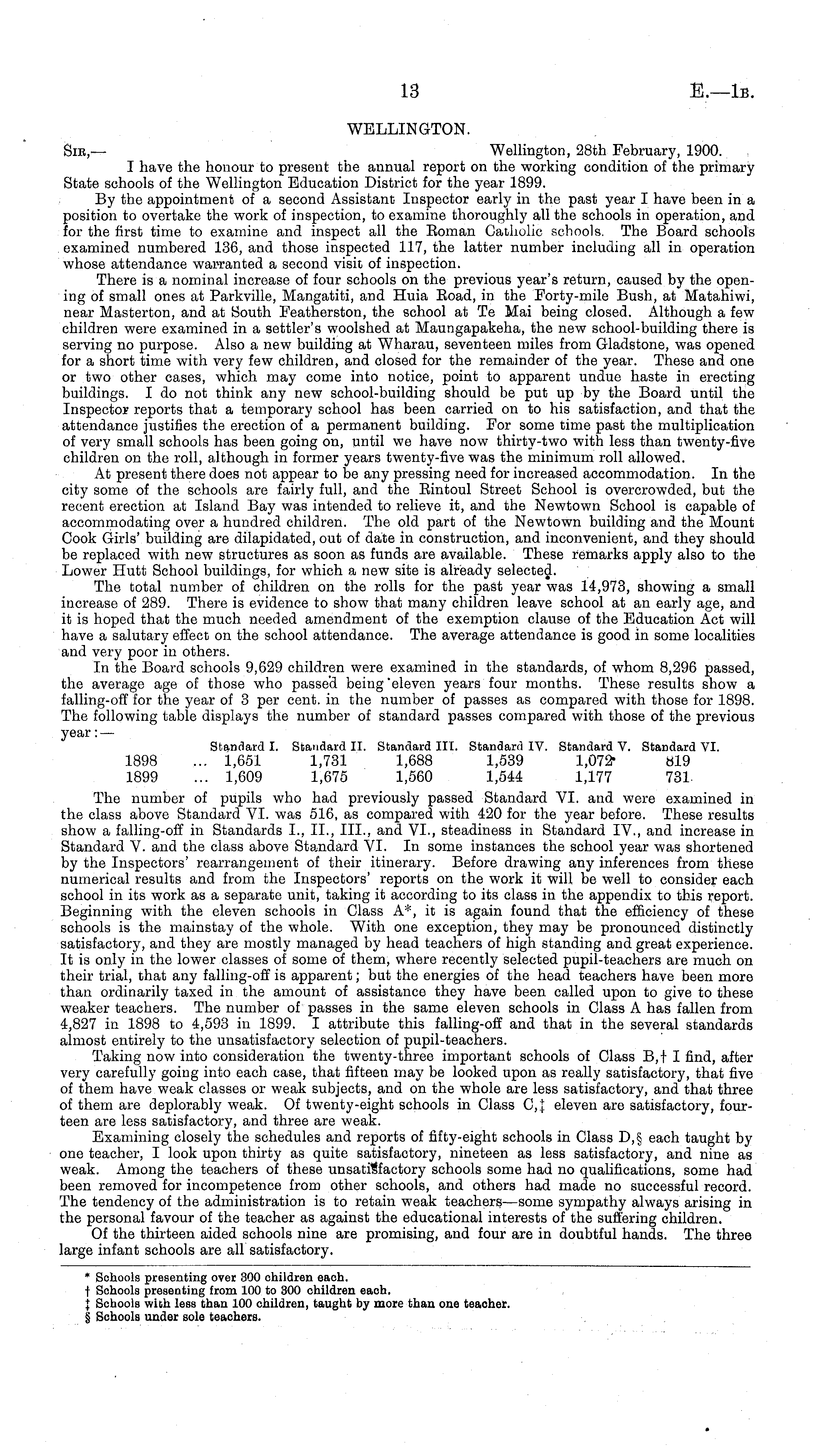 WELLINGTON. Sir,— Wellington, 28th February, 1900. I have the honour to present the annual report on the working condition of the primary State schools of the Wellington Education District for the year 1899. By the appointment of a second Assistant Inspector early in the past year I have been in a position to overtake the work of inspection, to examine thoroughly all the schools in operation, and for the first time to examine and inspect all the Roman Catholic schools. The Board schools examined numbered 136, and those inspected 117, the latter number including all in operation whose attendance warranted a second visit of inspection. There is a nominal increase of four schools on the previous year's return, caused by the opening of small ones at Parkville, Mangatiti, and Huia Road, in the Forty-mile Bush, at Matahiwi, near Masterton, and at South Featherston, the school at Te Mai being closed. Although a few children were examined in a settler's woolshed at Maungapakeha, the new school-building there is serving no purpose. Also a new building at Wharau, seventeen miles from Gladstone, was opened for a short time with very few children, and closed for the remainder of the year. These and one or two other cases, which may come into notice, point to apparent undue haste in erecting buildings. I do not think any new school-building should be put up by the Board until the Inspector reports that a temporary school has been carried on to his satisfaction, and that the attendance justifies the erection of a permanent building. For some time past the multiplication of very small schools has been going on, until we have now thirty-two with less than twenty-five children on the roll, although in former years twenty-five was the minimum roll allowed. At present there does not appear to be any pressing need for increased accommodation. In the city some of the schools are fairly full, and the Rintoul Street School is overcrowded, but the recent erection at Island Bay was intended to relieve it, and the Newtown School is capable of accommodating over a hundred children. The old part of the Newtown building and the Mount Cook Girls' building are dilapidated, out of date in construction, and inconvenient, and they should be replaced with new structures as soon as funds are available. These remarks apply also to the Lower Hutt School buildings, for which a new site is already selected. The total number of children on the rolls for the past year was 14,973, showing a small increase of 289. There is evidence to show that many children leave school at an early age, and it is hoped that the much needed amendment of the exemption clause of the Education Act will have a salutary effect on the school attendance. The average attendance is good in some localities and very poor in others. In the Board schools 9,629 children were examined in the standards, of whom 8,296 passed, the average age of those who passed being "eleven years four months. These results show a falling-off for the year of 3 per cent, in the number of passes as compared with those for 1898. The following table displays the number of standard passes compared with those of the previous year: — Standard I. Standard 11. Standard 111. Standard IV. Standard V. Standard VI. 1898 ... 1,651 1,731 1,688 1,539 1,072- 819 1899 ... 1,609 1,675 1,560 1,544 1,177 731. The number of pupils who had previously passed Standard VI. and were examined in the class above Standard VI. was 516, as compared with 420 for the year before. These results show a falling-off in Standards 1., 11., 111., and. VI., steadiness in Standard IV., and increase in Standard V. and the class above Standard VI. In some instances the school year was shortened by the Inspectors' rearrangement of their itinerary. Before drawing any inferences from these numerical results and from the Inspectors' reports on the work it will be well to consider each school in its work as a separate unit, taking it according to its class in the appendix to this report. Beginning with the eleven schools in Class A*, it is again found that the efficiency of these schools is the mainstay of the whole. With one exception, they may be pronounced distinctly satisfactory, and they are mostly managed by head teachers of high standing and great experience. It is only in the lower classes of some of them, where recently selected pupil-teachers are much on their trial, that any falling-off is apparent; but the energies of the head teachers have been more than ordinarily taxed in the amount of assistance they have been called upon to give to these weaker teachers. The number of passes in the same eleven schools in Class A has fallen from 4,827 in 1898 to 4,593 in 1899. I attribute this falling-off and that in the several standards almost entirely to the unsatisfactory selection of pupil-teachers. Taking now into consideration the twenty-three important schools of Class B,t I find, after very carefully going into each case, that fifteen may be looked upon as really satisfactory, that five of them have weak classes or weak subjects, and on the whole are less satisfactory, and that three of them are deplorably weak. Of twenty-eight schools in Class C,| eleven are satisfactory, fourteen are less satisfactory, and three are weak. Examining closely the schedules and reports of fifty-eight schools in Class D,§ each taught by one teacher, I look upon thirty as quite satisfactory, nineteen as less satisfactory, and nine as weak. Among the teachers of these unsatisfactory schools some had no qualifications, some had been removed for incompetence from other schools, and others had made no successful record. The tendency of the administration is to retain weak teachers—some sympathy always arising in the personal favour of the teacher as against the educational interests of the suffering children. Of the thirteen aided schools nine are promising, and four are in doubtful hands. The three large infant schools are all satisfactor