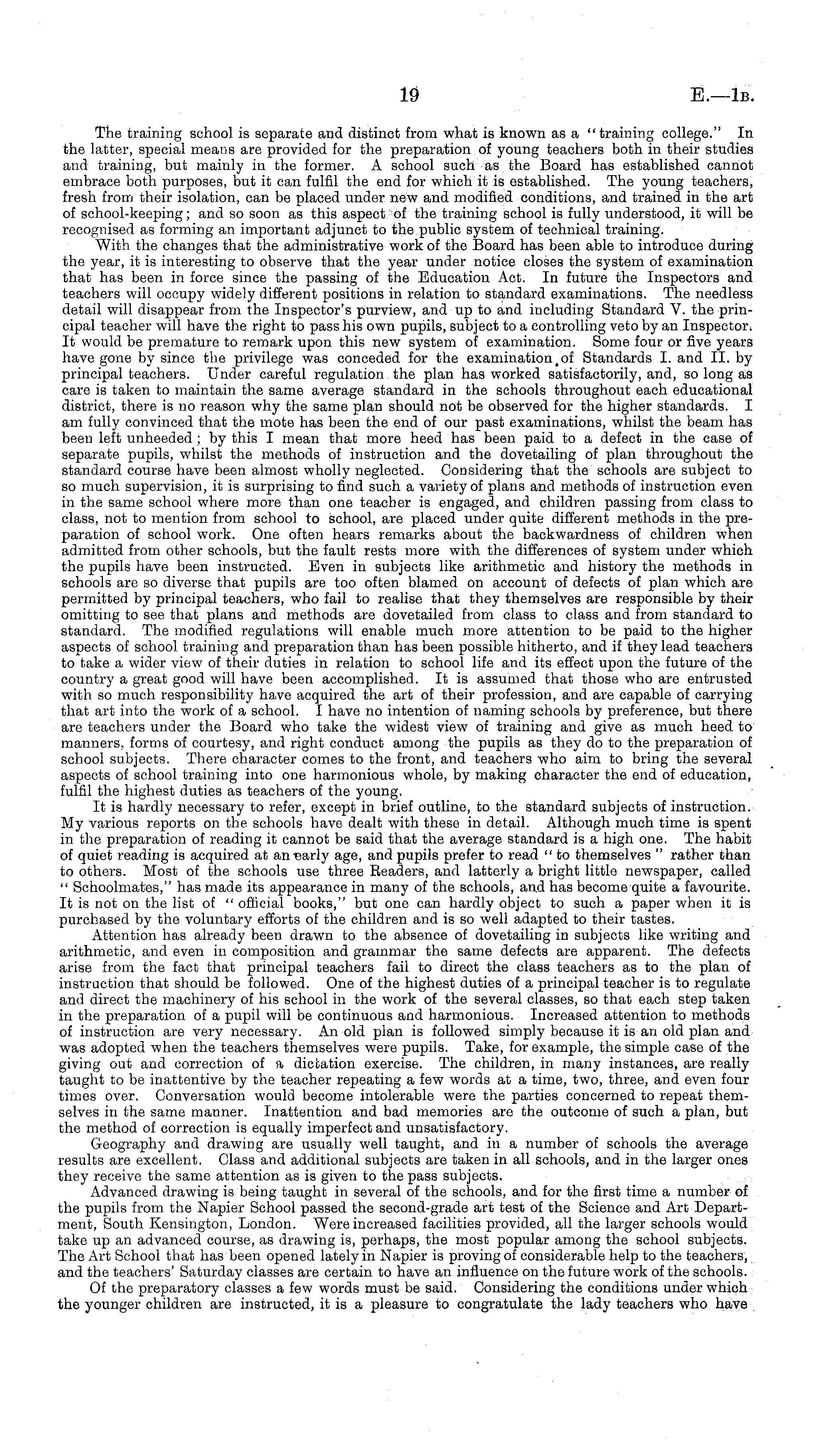 The training school is separate and distinct from what is known as a "training college." In the latter, special means are provided for the preparation of young teachers both in their studies and training, but mainly in the former. A school such as the Board has established cannot embrace both purposes, but it can fulfil the end for which it is established. The young teachers, fresh from their isolation, can be placed under new and modified conditions, and trained in the art of school-keeping; and so soon as this aspect of the training school is fully understood, it will be recognised as forming an important adjunct to the public system of technical training. With the changes that the administrative work of the Board has been able to introduce during the year, it is interesting to observe that the year under notice closes the system of examination that has been in force since the passing of the Education Act. In future the Inspectors and teachers will occupy widely different positions in relation to standard examinations. The needless detail will disappear from the Inspector's purview, and up to and including Standard V. the principal teacher will have the right to pass his own pupils, subject to a controlling veto by an Inspector; It would be premature to remark upon this new system of examination. Some four or five years have gone by since the privilege was conceded for the examination,of Standards I. and 11. by principal teachers. Under careful regulation the plan has worked satisfactorily, and, so long as care is taken to maintain the same average standard in the schools throughout each educational district, there is no reason why the same plan should not be observed for the higher standards. I am fully convinced that the mote has been the end of our past examinations, whilst the beam has been left unheeded ; by this I mean that more heed has been paid to a defect in the case of separate pupils, whilst the methods of instruction and the dovetailing of plan throughout the standard course have been almost wholly neglected. Considering that the schools are subject to so much supervision, it is surprising to find such a variety of plans and methods of instruction even in the same school where more than one teacher is engaged, and children passing from class to class, not to mention from school to school, are placed under quite different methods in the preparation of school work. One often hears remarks about the backwardness of children when admitted from other schools, but the fault rests more with the differences of system under which the pupils have been instructed. Even in subjects like arithmetic and history the methods in schools are so diverse that pupils are too often blamed on account of defects of plan which are permitted by principal teachers, who fail to realise that they themselves are responsible by their omitting to see that plans and methods are dovetailed from class to class and from standard to standard. The modified regulations will enable much more attention to be paid to the higher aspects of school training and preparation than has been possible hitherto, and if they lead teachers to take a wider view of their duties in relation to school life and its effect upon the future of the country a great good will have been accomplished. It is assumed that those who are entrusted with so much responsibility have acquired the art of their profession, and are capable of carrying that art into the work of a school. I have no intention of naming schools by preference, but there are teachers under the Board who take the widest view of training and give as much heed to manners, forms of courtesy, and right conduct among the pupils as they do to the preparation of school subjects. There character comes to the front, and teachers who aim to bring the several aspects of school training into one harmonious whole, by making character the end of education, fulfil the highest duties as teachers of the young. It is hardly necessary to refer, except in brief outline, to the standard subjects of instruction. My various reports on the schools have dealt with these in detail. Although much time is spent in the preparation of reading it cannot be said that the average standard is a high one. The habit of quiet reading is acquired at an early age, and pupils prefer to read " to themselves " rather than to others. Most of the schools use three Readers, and latterly a bright little newspaper, called " Schoolmates," has made its appearance in many of the schools, and has become quite a favourite. It is not on the list of " official books," but one can hardly object to such a paper when it is purchased by the voluntary efforts of the children and is so well adapted to their tastes. Attention has already been drawn to the absence of dovetailing in subjects like writing and arithmetic, and even in composition and grammar the same defects are apparent. The defects arise from the fact that principal teachers fail to direct the class teachers as to the plan of instruction that should be followed. One of the highest duties of a principal teacher is to regulate and direct the machinery of his school in the work of the several classes, so that each step taken in the preparation of a pupil will be continuous and harmonious. Increased attention to methods of instruction are very necessary. An old plan is followed simply because it is an old plan and was adopted when the teachers themselves were pupils. Take, for example, the simple case of the giving out and correction of a dictation exercise. The children, in many instances, are really taught to be inattentive by the teacher repeating a few words at a time, two, three, and even four times over. Conversation would become intolerable were the parties concerned to repeat themselves in the same manner. Inattention and bad memories are the outcome of such a plan, but the method of correction is equally imperfect and unsatisfactory. Geography and drawing are usua