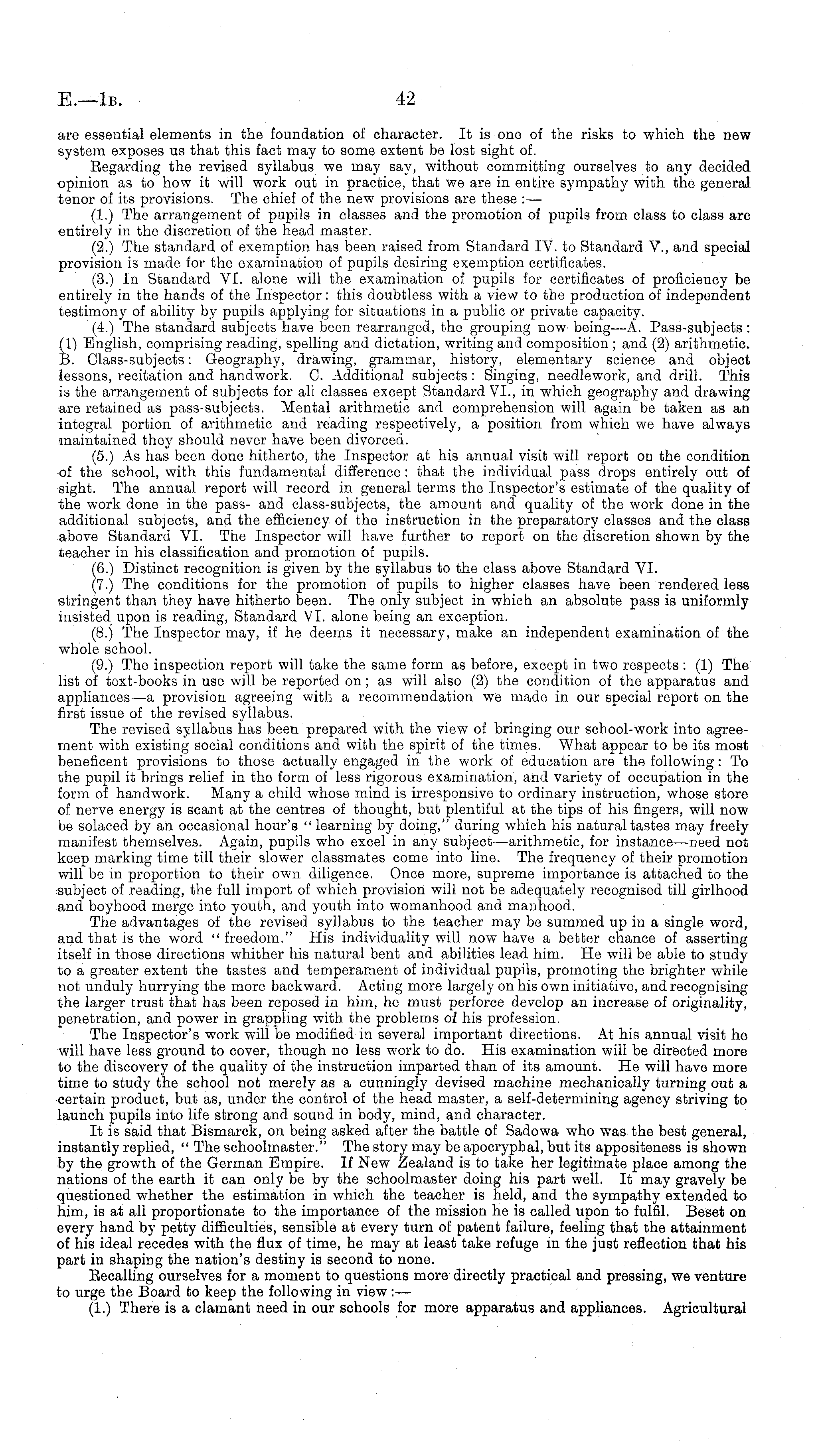 are essential elements in the foundation of character. It is one of the risks to which the new system exposes us that this fact may to some extent be lost sight of. Regarding the revised syllabus we may say, without committing ourselves to any decided opinion as to how it will work out in practice, that we are in entire sympathy with the general tenor of its provisions. The chief of the new provisions are these : — (1.) The arrangement of pupils in classes and the promotion of pupils from class to class are entirely in the discretion of the head master. (2.) The standard of exemption has been raised from Standard IV. to Standard V., and special provision is made for the examination of pupils desiring exemption certificates. (3.) In Standard VI. alone will the examination of pupils for certificates of proficiency be entirely in the hands of the Inspector: this doubtless with a view to the production of independent testimony of ability by pupils applying for situations in a public or private capacity. (4.) The standard subjects have been rearranged, the grouping now being—A. Pass-subjects : (1) English, comprising reading, spelling and dictation, writing and composition ; and (2) arithmetic. B. Class-subjects: Geography, drawing, grammar, history, elementary science and object lessons, recitation and handwork. C. Additional subjects : Singing, needlework, and drill. This is the arrangement of subjects for all classes except Standard VI., in which geography and drawing are retained as pass-subjects. Mental arithmetic and comprehension will again be taken as an integral portion of arithmetic and reading respectively, a position from which we have always maintained they should never have been divorced. (5.) As has been done hitherto, the Inspector at his annual visit will report on the condition •of the school, with this fundamental difference : that the individual pass drops entirely out of sight. The annual report will record in general terms the Inspector's estimate of the quality of the work done in the pass- and class-subjects, the amount and quality of the work done in the additional subjects, and the efficiency of the instruction in the preparatory classes and the class above Standard VI. The Inspector will have further to report on the discretion shown by the teacher in his classification and promotion of pupils. (6.) Distinct recognition is given by the syllabus to the class above Standard VI. (7.) The conditions for the promotion of pupils to higher classes have been rendered less stringent than they have hitherto been. The only subject in which an absolute pass is uniformly insisted upon is reading, Standard VI. alone being an exception. (8.) The Inspector may, if he deems it necessary, make an independent examination of the whole school. (9.) The inspection report will take the same form as before, except in two respects : (1) The list of text-books in use will be reported on; as will also (2) the condition of the apparatus and appliances —a provision agreeing with a recommendation we made in our special report on the first issue of the revised syllabus. The revised syllabus has been prepared with the view of bringing our school-work into agreement with existing social conditions and with the spirit of the times. What appear to be its most beneficent provisions to those actually engaged in the work of education are the following: To the pupil it brings relief in the form of less rigorous examination, and variety of occupation in the form of handwork. Many a child whose mind is irresponsive to ordinary instruction, whose store of nerve energy is scant at the centres of thought, but plentiful at the tips of his fingers, will now be solaced by an occasional hour's "learning by doing," during which his natural tastes may freely manifest themselves. Again, pupils who excel in any subject—arithmetic, for instance—need not keep marking time till their slower classmates come into line. The frequency of their promotion will be in proportion to their own diligence. Once more, supreme importance is attached to the subject of reading, the full import of which provision will not be adequately recognised till girlhood and boyhood merge into youth, and youth into womanhood and manhood. The advantages of the revised syllabus to the teacher may be summed up in a single word, and that is the word " freedom." His individuality will now have a better chance of asserting itself in those directions whither his natural bent and abilities lead him. He will be able to study to a greater extent the tastes and temperament of individual pupils, promoting the brighter while not unduly hurrying the more backward. Acting more largely on his own initiative, and recognising the larger trust that has been reposed in him, he must perforce develop an increase of originality, penetration, and power in grappling with the problems of his profession. The Inspector's work will be modified in several important directions. At his annual visit he will have less ground to cover, though no less work to do. His examination will be directed more to the discovery of the quality of the instruction imparted than of its amount. He will have more time to study the school not merely as a cunningly devised machine mechanically turning out a certain product, but as, under the control of the head master, a self-determining agency striving to launch pupils into life strong and sound in body, mind, and character. It is said that Bismarck, on being asked after the battle of Sadowa who was the best general, instantly replied, " The schoolmaster." The story may be apocryphal, but its appositeness is shown by the growth of the German Empire. If New Zealand is to take her legitimate place among the nations of the earth it can only be by the schoolmaster doing his part well. It may gravely be questioned whether the estimation in which the teacher is held, and the sympathy extended to him, is at all proportionate to the importance of