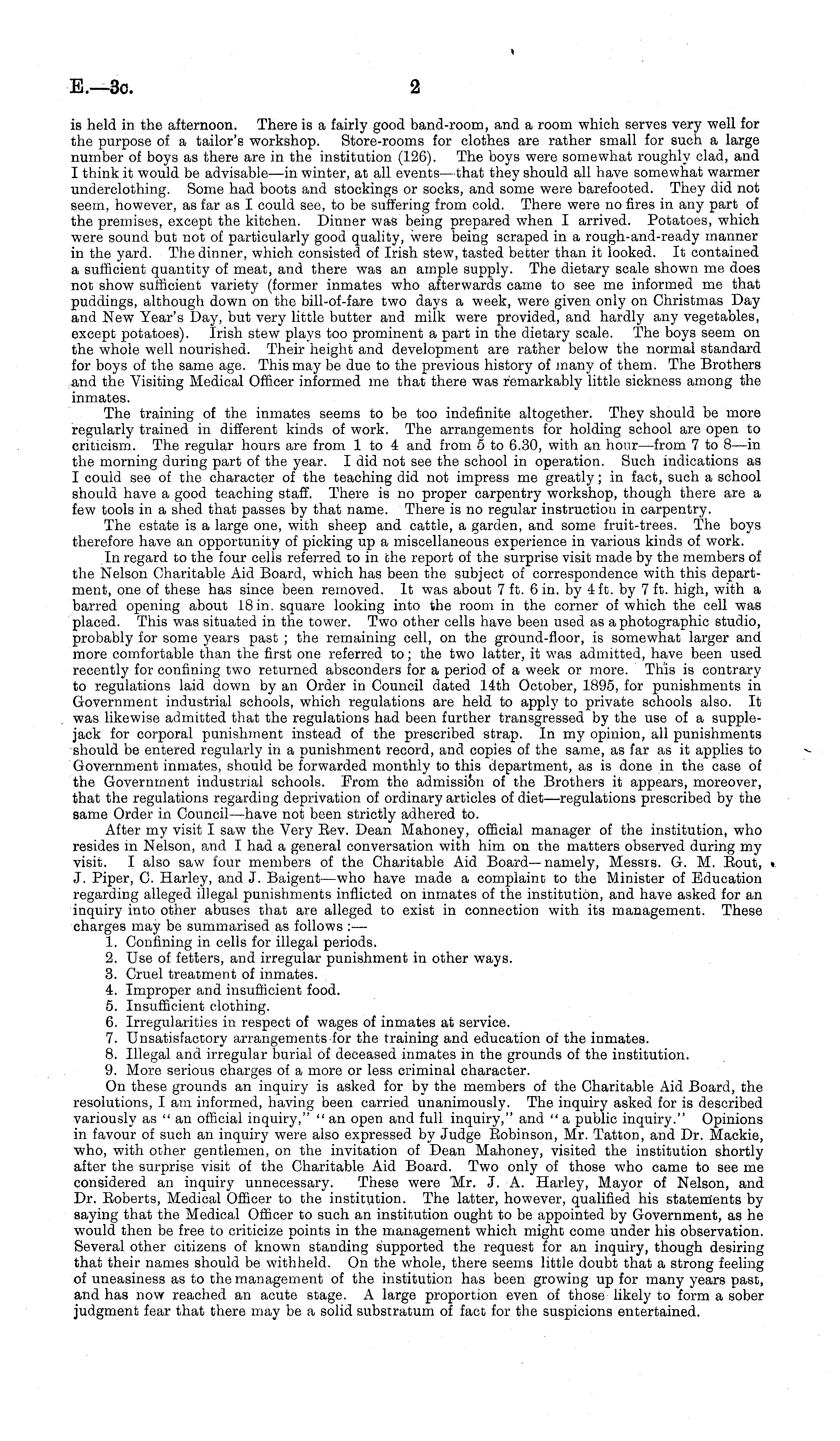 is held in the afternoon. There is a fairly good band-room, and a room which serves very well for the purpose of a tailor's workshop. Store-rooms for clothes are rather small for such a large number of boys as there are in the institution (126). The boys were somewhat roughly clad, and I think it would be advisable —in winter, at all events —that they should all have somewhat warmer underclothing. Some had boots and stockings or socks, and some were barefooted. They did not seem, however, as far as I could see, to be suffering from cold. There were no fires in any part of the premises, except the kitchen. Dinner was being prepared when I arrived. Potatoes, which were sound but not of particularly good quality, were being scraped in a rough-and-ready manner in the yard. The dinner, which consisted of Irish stew, tasted better than it looked. It contained a sufficient quantity of meat, and there was an ample supply. The dietary scale shown me does not show sufficient variety (former inmates who afterwards came to see me informed me that puddings, although down on the bill-of-fare two days a week, were given only on Christmas Day and New Year's Day, but very little butter and milk were provided, and hardly any vegetables, except potatoes). Irish stew plays too prominent a part in the dietary scale. The boys seem on the whole well nourished. Their height and development are rather below the normal standard for boys of the same age. This may be due to the previous history of many of them. The Brothers and the Visiting Medical Officer informed me that there was remarkably little sickness among the inmates. The training of the inmates seems to be too indefinite altogether. They should be more regularly trained in different kinds of work. The arrangements for holding school are open to criticism. The regular hours are from 1 to 4 and from sto 6.30, with an hour—from 7to B—in the morning during part of the year. I did not see the school in operation. Such indications as I could see of the character of the teaching did not impress me greatly; in fact, such a school should have a good teaching staff. There is no proper carpentry workshop, though there are a few tools in a shed that passes by that name. There is no regular instruction in carpentry. The estate is a large one, with sheep and cattle, a garden, and some fruit-trees. The boys therefore have an opportunity of picking up a miscellaneous experience in various kinds of work. In regard to the four cells referred to in the report of the surprise visit made by the members of the Nelson Charitable Aid Board, which has been the subject of correspondence with this department, one of these has since been removed. It was about 7 ft. 6 in. by 4 ft. by 7 ft. high, with a barred opening about 18 in. square looking into the room in the corner of which the cell was placed. This was situated in the tower. Two other cells have been used as a photographic studio, probably for some years past ; the remaining cell, on the ground-floor, is somewhat larger and more comfortable than the first one referred to; the two latter, it was admitted, have been used recently for confining two returned absconders for a period of a week or more. This is contrary to regulations laid down by an Order in Council dated 14th October, 1895, for punishments in Government industrial schools, which regulations are held to apply to private schools also. It was likewise admitted that the regulations had been further transgressed by the use of a supplejack for corporal punishment instead of the prescribed strap. In my opinion, all punishments should be entered regularly in a punishment record, and copies of the same, as far as it applies to Government inmates, should be forwarded monthly to this department, as is done in the case of the Government industrial schools. From the admission of the Brothers it appears, moreover, that the regulations regarding deprivation of ordinary articles of diet—regulations prescribed by the same Order in Council—have not been strictly adhered to. After my visit I saw the Very Eev. Dean Mahoney, official manager of the institution, who resides in Nelson, and I had a general conversation with him on the matters observed during my visit. I also saw four members of the Charitable Aid Board—namely, Messrs. G. M. Eout, «. J. Piper, C. Harley, and J. Baigent —who have made a complaint to the Minister of Education regarding alleged illegal punishments inflicted on inmates of the institution, and have asked for an inquiry into other abuses that are alleged to exist in connection with its management. These charges may be summarised as follows : — 1. Confining in cells for illegal periods. 2. Use of fetters, and irregular punishment in other ways. 3. Cruel treatment of inmates. 4. Improper and insufficient food. 5. Insufficient clothing. 6. Irregularities in respect of wages of inmates at service. 7. Unsatisfactory arrangements for the training and education of the inmates. 8. Illegal and irregular burial of deceased inmates in the grounds of the institution. 9. More serious charges of a more or less criminal character. On these grounds an inquiry is asked for by the members of the Charitable Aid Board, the resolutions, lam informed, having been carried unanimously. The inquiry asked for is described variously as "an official inquiry," "an open and full inquiry," and " a public inquiry." Opinions in favour of such an inquiry were also expressed by Judge Eobinson, Mr. Tatton, and Dr. Mackie, who, with other gentlemen, on the invitation of Dean Mahoney, visited the institution shortly after the surprise visit of the Charitable Aid Board. Two only of those who came to see me considered an inquiry unnecessary. These were Mr. J. A. Harley, Mayor of Nelson, and Dr. Eoberts, Medical Officer to the institution. The latter, however, qualified his statements by saying that the Medical Officer to such an institution ought to be appointed by Government, as 