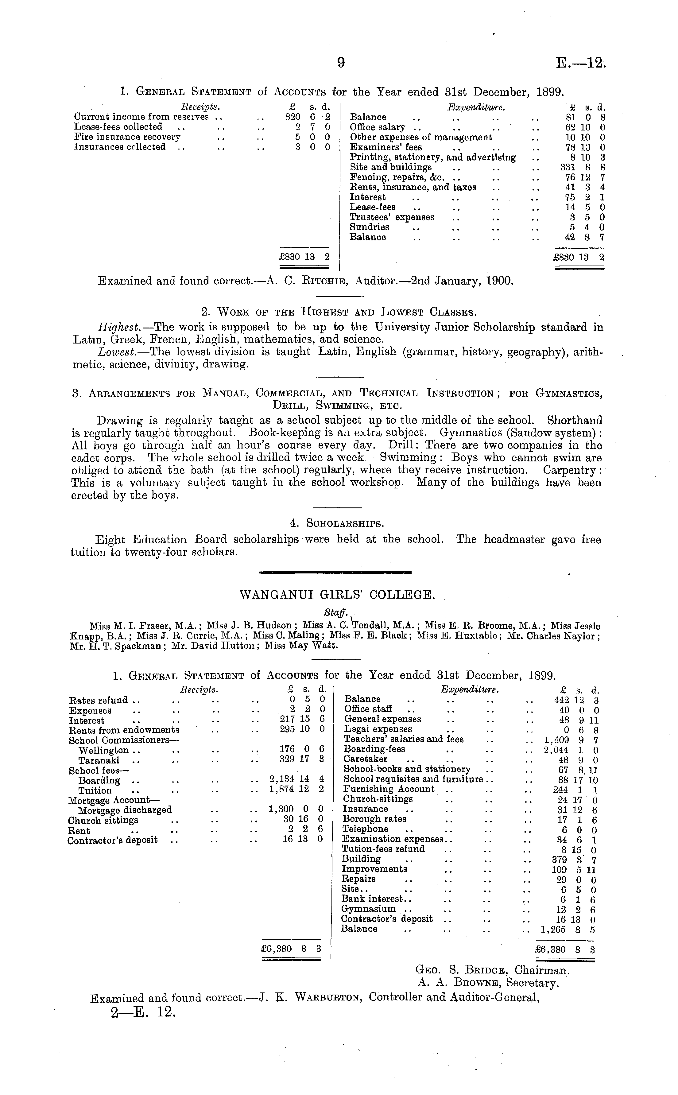 1. General Statement of Accounts for the Year ended 31st December, 1899. Receipts. £ s. d. Expenditure. a s. d. Current income from reserves .. .. 820 6 2 Balanoe .. .. .. .. 81 0 8 Lease-fees oollected .. .. .. 2 7 0 Office salary .. .. .. .. 62 10 0 Fire insurance recovery .. .. 5 0 0 Other expenses of management .. 10 10 0 Insurances collected .. .. .. 3 0 0 Examiners' fees .. .. .. 78 13 0 Printing, stationery, and advertising .. 810 3 Site and buildings .. .. .. 331 8 8 Fencing, repairs, Sea. .. .. .. 76 12 7 Rents, insurance, and taxes .. .. 41 3 4 Interest .. .. .. .. 75 2 1 Lease-fees .. .. .. .. 14 5 0 Trustees' expenses .. .. .. 3 5 0 Sundries .. .. .. .. 5 4 0 Balanoe .. .. .. .. 42 8 7 £830 13 2 £830 13 2 Examined and found correct.—A. 0. Eitchie, Auditor.—2nd January, 1900.
