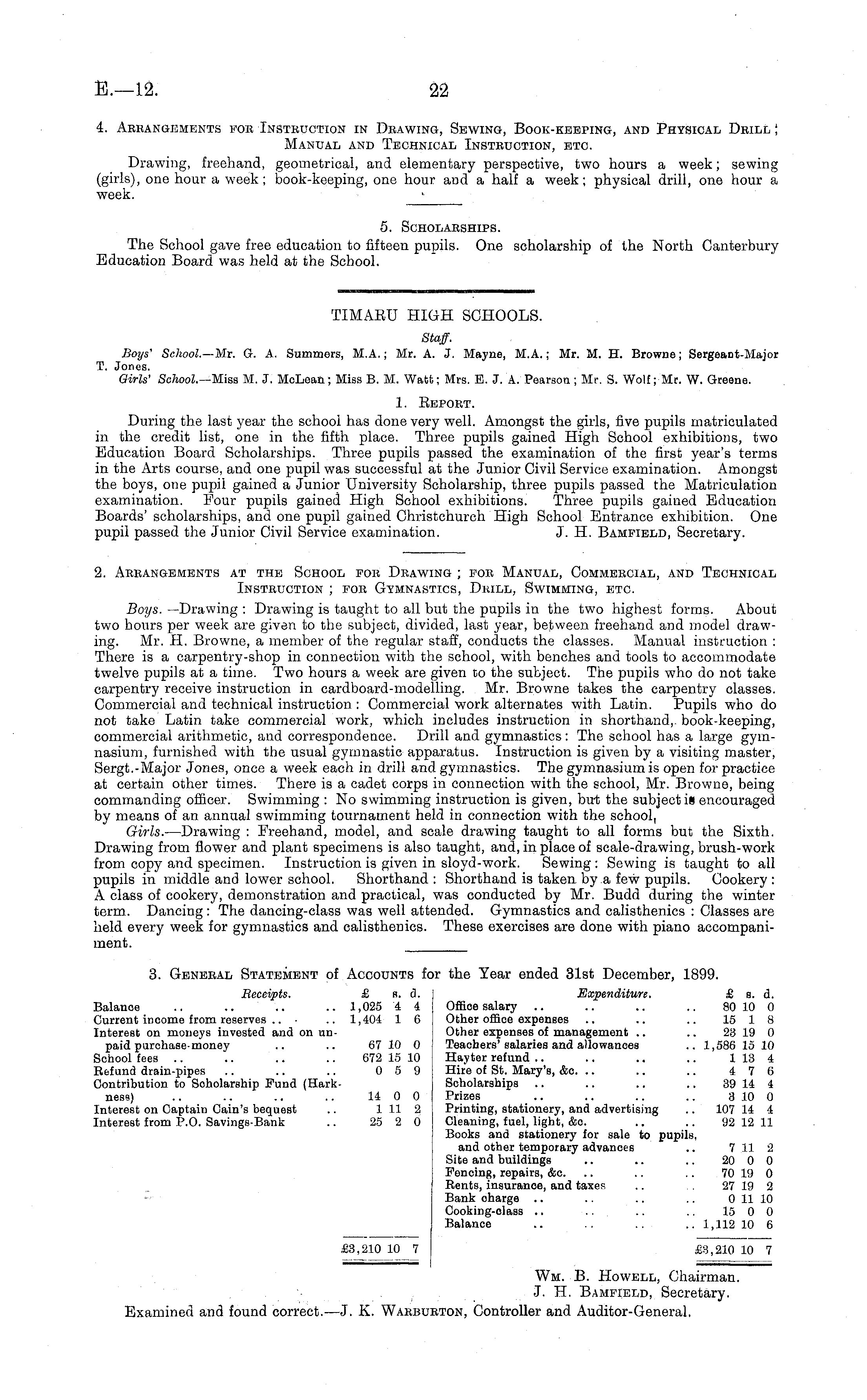 TIMAEU HIGH SCHOOLS. Staff. Boys' School. —Mr. G. A. Summers, M.A.; Mr. A. J. Mayne, M.A.; Mr. M. H. Browne; Sergeant-Major T. Jones. Girls' School.— Miss M. J. McLean; Miss B. M. Watt; Mrs. B. J. A. Pearson; Me. S. Wolf; Mr. W. Greene. 1. Eeport. During the last year the school has done very well. Amongst the girls, five pupils matriculated in the credit list, one in the fifth place. Three pupils gained High School exhibitions, two Education Board Scholarships. Three pupils passed the examination of the first year's terms in the Arts course, and one pupil was successful at the Junior Civil Service examination. Amongst the boys, one pupii gained a Junior University Scholarship, three pupils passed the Matriculation examination. Pour pupils gained High School exhibitions. Three pupils gained Education Boards' scholarships, and one pupil gained Christchurch High School Entrance exhibition. One pupil passed the Junior Civil Service examination. J. H. Bamfield, Secretary.