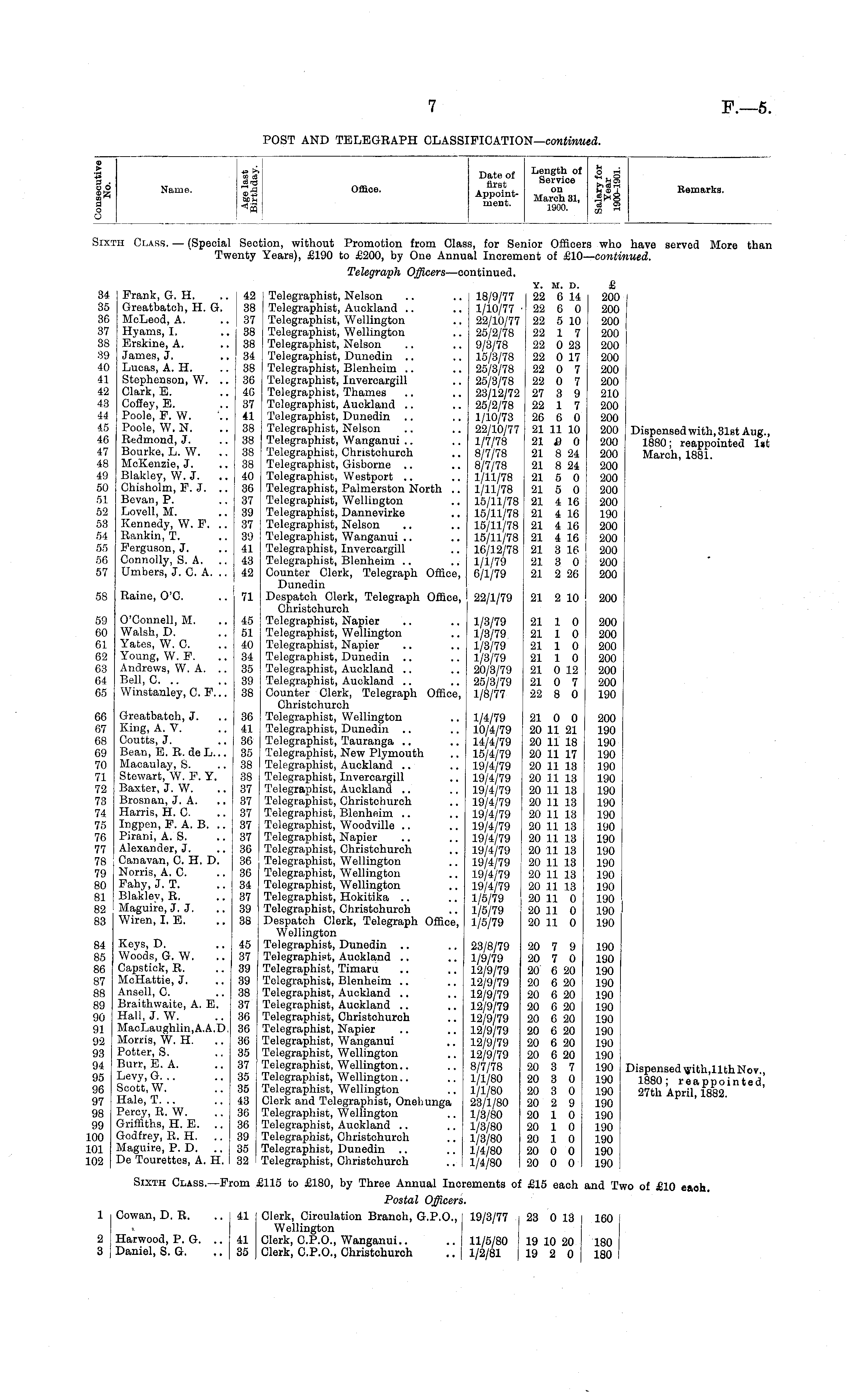 CD §1 Name. a o o co eel edrrt "a DOM Office. Date of Lgagt! 1 °* £ d first Se " 106 £S§ A March 31, StSi ment - 1900. * a Remarks. Sixth Class. — (Special Twi Section, without Promotion from Clasi enty Years), £190 to £200, by One Annul Telegraph Officers —co ss, for Sen: ual Increme lior Officers who ent of £10 — conti', have servod More than ued. :ontinued. Y. M. D. £ 22 6 14 200 22 6 0 200 22 5 10 200 22 1 7 200 22 0 23 200 22 0 17 200 22 0 7 200 22 0 7 200 27 3 9 210 22 1 7 200 26 6 0 200 21 11 10 200 21 8 0 200 21 8 24 200 21 8 24 200 21 5 0 200 21 5 0 200 21 4 16 200 21 4 16 190 21 4 16 200 21 4 16 200 21 3 16 200 21 3 0 200 21 2 26 200 34 Frank, G. H. 35 Greatbatch, H. G. 36 McLeod, A. 37 Hyams, I. 38 Erskine, A. 39 James, J. 40 Lucas, A. H. 41 Stephenson, W. .. 42 Clark, E. 43 Coffey, E. 44 Poole, F. W. 45 Poole, W.N. 46 Redmond, J. 47 Bourke, L. W. 48 McKenzie, J. 49 Blakley, W.J. 50 Chisholm, F. J. 51 Bevan, P. 52 Lovell, M. 53 Kennedy, W. F. 54 Rankin, T. 55 Ferguson, J. 56 Connolly, S. A. .. 57 Umbers, J. C. A. .. 42 Telegraphist, Nelson 38 Telegraphist, Auckland 37 Telegraphist, Wellington 38 Telegraphist, Wellington 38 Telegraphist, Nelson 34 Telegraphist, Dunedin 38 Telegraphist, Blenheim 36 Telegraphist, Invercargill 46 Telegraphist, Thames 37 Telegraphist, Auckland 41 Telegraphist, Dunedin 38 Telegraphist, Nelson 38 Telegraphist, Wanganui 38 Telegraphist, Christchurch 38 Telegraphist, Gisborne 40 Telegraphist, Westport 36 Telegraphist, Palmerston North .. 37 Telegraphist, Wellington 39 Telegraphist, Dannevirke 37 Telegraphist, Nelson 39 Telegraphist, Wanganui 41 Telegraphist, Invercargill 43 Telegraphist, Blenheim 42 Counter Clerk, Telegraph Office, Dunedin 71 Despatch Clerk, Telegraph Office, Christchurch 45 Telegraphist, Napier 51 Telegraphist, Wellington 40 Telegraphist, Napier 34 Telegraphist, Dunedin 35 Telegraphist, Auckland 39 Telegraphist, Auckland .. 38 Counter Clerk, Telegraph Office, Christchurch 36 Telegraphist, Wellington 41 Telegraphist, Dunedin 36 Telegraphist, Tauranga 35 Telegraphist, New Plymouth 38 Telegraphist, Auckland 38 Telegraphist, Invercargill 37 Telegraphist, Auckland 37 Telegraphist, Christchurch 37 Telegraphist, Blenheim 37 Telegraphist, Woodville 37 Telegraphist, Napier 36 Telegraphist, Christchurch 36 Telegraphist, Wellington 36 Telegraphist, Wellington 34 Telegraphist, Wellington 37 Telegraphist, Hokitika 39 Telegraphist, Christchurch 38 Despatch Clerk, Telegraph Office, Wellington 45 Telegraphist, Dunedin 37 Telegraphist, Auckland 39 Telegraphist, Timaru 39 Telegraphist, Blenheim 38 Telegraphist, Auckland 37 Telegraphist, Auckland 36 Telegraphist, Christchurch 36 Telegraphist, Napier 36 Telegraphist, Wanganui 35 Telegraphist, Wellington 37 Telegraphist, Wellington.. 35 Telegraphist, Wellington.. 35 Telegraphist, Wellington 43 Clerk and Telegraphist, Onebunga 36 Telegraphist, Wellington 36 Telegraphist, Auckland 39 Telegraphist, Christchurch 35 Telegraphist, Dunedin .. 32 I Telegraphist, Christchurch .. | 18/9/77 1/10/77 ■ 22/10/77 25/2/78 9/3/78 15/3/78 25/3/78 25/3/78 23/12/72 25/2/78 1/10/73 22/10/77 1/7/78 8/7/78 8/7/78 1/11/78 1/11/78 15/11/78 15/11/78 15/11/78 15/11/78 16/12/78 1/1/79 6/1/79 Dispensed with, 31st Aug., 1880; reappointed lat March, 1881. 58 Raine, O'C 22/1/79 21 2 10 200 59 O'Connell, M. 60 Walsh, D. 61 Yates, W. C. 62 Young, W. F. 63 Andrews, W. A. 64 Bell, C. .. 65 Winstanley, 0. F... 1/3/79 1/3/79 1/3/79 1/3/79 20/3/79 25/3/79 1/8/77 21 1 0 200 21 1 0 200 21 1 0 200 21 1 0 200 21 0 12 200 21 0 7 200 22 8 0 190 66 Greatbatch, J. 67 King, A. V. 68 Coutts, J. 69 Bean, E. R. deL... 70 Maoaulay, S. 71 Stewart, W. F. Y. 72 Baxter, J. W. 73 Brosnan, J. A. 74 Harris, H. C 75 Ingpen, F. A. B. 76 Pirani, A. S. 77 Alexander, J. 78 Canavan, C. H. D. 79 Norris, A. C. 80 Fahy, J. T. 81 Blakley, R. 82 Maguire, J. J. 83 Wiren, I. E. 1/4/79 10/4/79 14/4/79 15/4/79 19/4/79 19/4/79 19/4/79 19/4/79 19/4/79 19/4/79 19/4/79 19/4/79 19/4/79 19/4/79 19/4/79 1/5/79 1/5/79 1/5/79 : 21 0 0 200 20 11 21 190 20 11 18 190 20 11 17 190 20 11 13 190 20 11 13 190 20 11 13 190 20 11 13 190 20 11 18 190 20 11 13 190 20 11 13 190 20 11 13 190 20 11 13 190 20 11 13 190 20 11 13 190 20 11 0 190 20 11 0 190 20 11 0 190 84 Keys, D. 85 Woods, G. W. 86 Capstick, R. 87 McHattie, J. 88 Ansell, C. 89 Braithwaite, A. E. 90 Hall, J. W. 91 MacLaughlin,A.A.D. 92 Morris, W. H. 93 Potter, S. 94 Burr, E. A. 95 Levy, G. .. 96 Scott, W. 97 Hale, T. .. 98 Percy, R. W. 99 Griffiths, H. E. .00 Godfrey, R. H. .01 Maguire, P. D. .02 Le Tourettes, A. H. 23/8/79 : 1/9/79 ! 12/9/79 I 12/9/79 : 12/9/79 : 12/9/79 ! 12/9/79 I 12/9/79 ! 12/9/79 I 12/9/79 ! 8/7/78 I 1/1/80 ! 1/1/80 ! 23/1/80 ! 1/3/80 i 1/3/80 ! 1/3/80 : 1/4/80 ! 1/4/80 5 20 7 9 190 20 7 0 190 20 6 20 190 20 6 20 190 20 6 20 190 20 6 20 190 20 6 20 190 20 6 20 190 20 6 20 190 20 6 20 190 20 3 7 190 20 3 0 190 20 3 0 190 20 2 9 190 20 1 0 190 20 1 0 190 20 1 0 190 20 0 0 190 20 0 0 190 Dispensed with.llthNov., 1880; reappointed, 27th April, 1882. po of £10 eaoh. Sixth Class. —Fr :om £115 to £180, by Three Annual Incn rements of i £15 each and Tv 1 Cowan, D. R. 2 Harwood, P. G. 3 Daniel, S. G. Postal Officers. 41 Clerk, Circulation Branch, G.P.C, Wellington 41 Clerk, G.P.C, Wanganui.. 35 Clerk, C.P.O., Christohurch 19/3/77 ! 23 0 13 160 I 11/5/80 ] 1/2/81 1 19 10 20 180 19 2 0 180 I