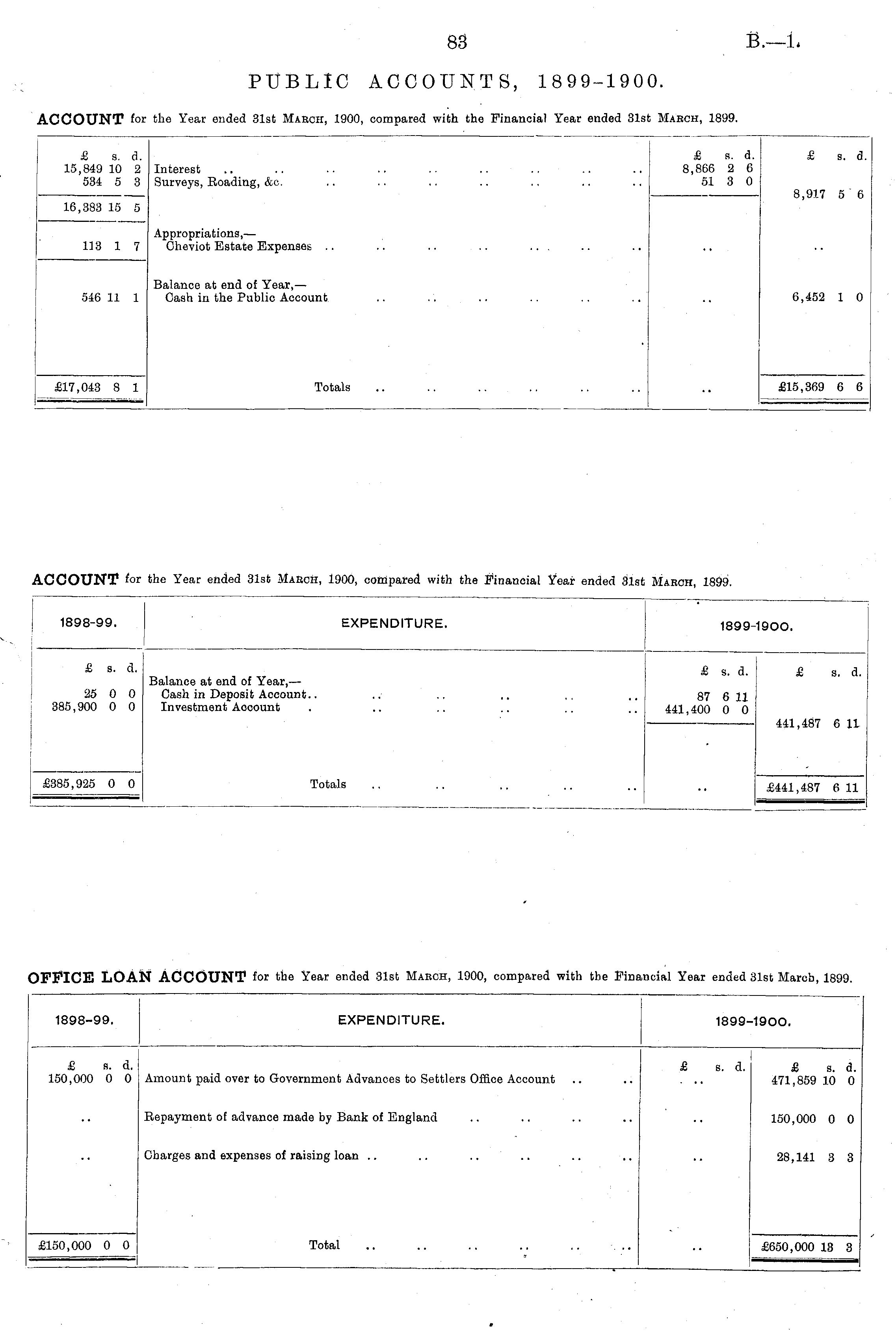 £ s. d. 15,849 10 2 534 5 3 Interest Surveys, Roading, &c. £ s. d. 8,866 2 6 51 3 0 £ s. d. 8,917 5 6 10,383 15 5 Appropriations,— Cheviot Estate Expenses .. 113 1 7 546 11 1 Balance at end of Year, — Cash in the Public Account 6,452 1 0 Totals £17,043 8 1 £15,369 6 6 ACCOUNT for the Year ended 31st March, 1900, compared with the Financial Year ended 31st March, 1899. 1898-99. EXPENDITURE. 1899-1900. £ s. d. £ s. d. £ s. d. 25 0 0 385,900 0 0 Balance at end of Year, — Cash in Deposit Account.. Investment Account 87 6 11 441,400 0 0 441,487 6 11 Totals £385,925 0 0 £441,487 6 11 ACCOUNT for the Year ended 31st March, 1900, compared with tbe Fin FFICE LOAl ,ncial Year ended 31st March, 1899. 1898-99. EXPENDITURE. 1899-1900. £ s. d. 150,000 0 0 Amount paid over to Government Advances to Settlers Office Account £ s. d. £ s. d. 471,859 10 0 Repayment of advance made by Bank of England 150,000 0 0 Charges and expenses of raising loan 28,141 3 3 £150,000 0 0 Total £650,000 13 3
