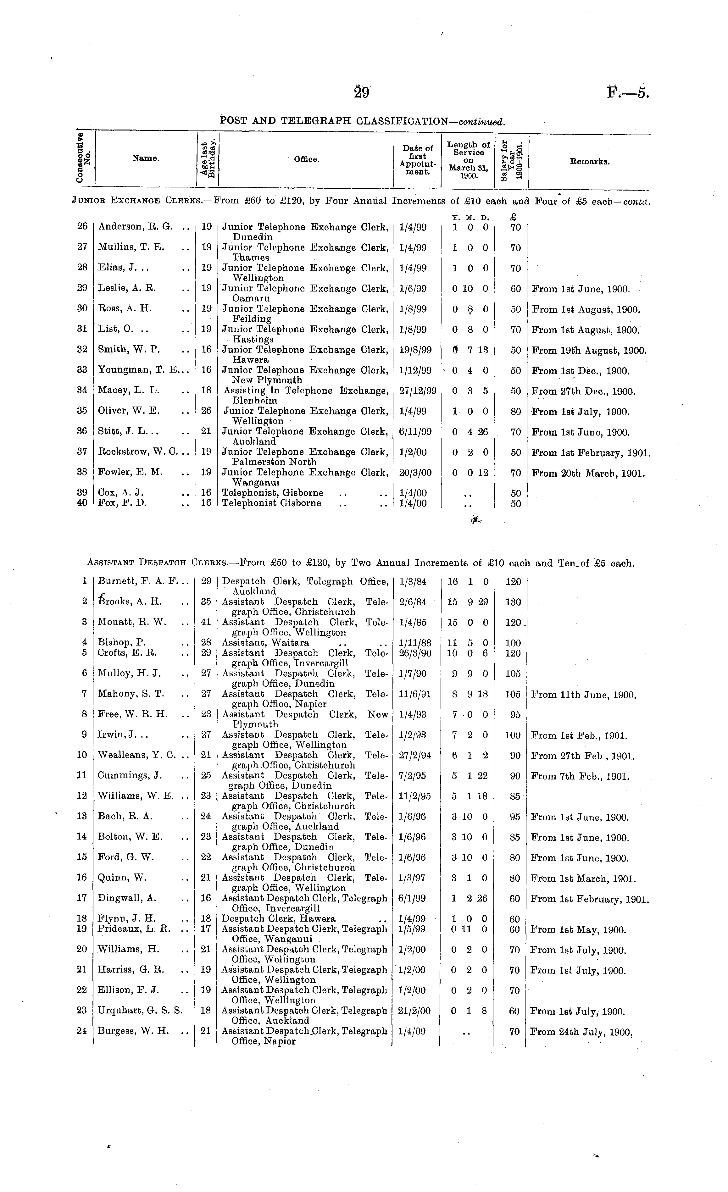 > CDbr a o O Name. co o3 edrH "S CD+3 Ufa Office. Date of first Appointment. Length of o r-i Service T^tS on sw © i March 31, £x»g 1900. £ S Remarks. Iunior Exchange Cleri UND 26 Anderson, R. G. :s.— <'rom £60 to £120, by Four Annual Junior Telephone Exchange Clerk, Dunedin Junior Telephone Exchange Clerk, Thames Junior Telephone Exchange Clerk, Wellington Junior Telephone Exchange Clerk, Oamaru Junior Telephone Exchange Clerk, Feilding Junior Telephone Exchange Clerk, Hastings Junior Telephone Exchange Clerk, Hawera Junior Telephone Exchange Clerk, New Plymouth Assisting in Telephone Exchange, Blenheim Junior Telephone Exchange Clerk, Wellington Junior Telephone Exchange Clerk, Auckland Junior Telephone Exchange Clerk, Palmerston North Junior Telephone Exchange Clerk, Wanganui Telephonist, Gisborne Telephonist Gisborne Lncrernent 1/4/99 of £10 each anc Y. m. d. £ 10 0 70 I Four of £5 each — conia. 26 19 27 27 Mullins, T. E. 19 1/4/99 10 0 70 From 1st June, 1900. 28 28 Elias, J. .. 19 1/4/99 10 0 70 29 29 Leslie, A. R. 19 1/6/99 0 10 0 60 30 30 Ross, A. H. 19 1/8/99 0 8 0 50 From 1st August, 1900. 31 31 List, 0. .. 19 1/8/99 0 8 0 70 From 1st August, 1900. 32 32 Smith, W. P. 16 19/8/99 0 7 13 50 From 19th August, 1900. 33 33 Youngman, T. E... 16 1/12/99 0 4 0 50 From 1st Dec, 1900. 34 34 Macey, L. L. 18 27/12/99 0 3 5 50 From 27th Dec, 1900. 35 35 Oliver, W. E. 26 1/4/99 10 0 80 From 1st July, 1900. 36 36 Stitt, J. L 21 6/11/99 0 4 26 70 From 1st June, 1900. 37 37 Rockstrow, W. 0. .. 19 1/2/00 0 2 0 50 From 1st February, 1901. 38 38 Fowler, E. M. 19 20/3/00 0 0 12 70 From 20th March, 1901. 39 40 39 Cox, A. J. 40 Fox, F. D. 16 16 1/4/00 1/4/00 50 50 Assistant Despatch 1 Burnett, F. A. F. .. !ler: 29 ks.—From £50 to £120, by Two Am Despatch Clerk, Telegraph Office, Auckland Assistant Despatch Clerk, Telegraph Office, Christchurch Assistant Despatch Clerk, Telegraph Office, Wellington Assistant, Waitara Assistant Despatch Clerk, Telegraph Office, Invercargill Assistant Despatch Clerk, Telegraph Office, Dunedin Assistant Despatch Clerk, Telegraph Office, Napier Assistant Despatch Clerk, New Plymouth Assistant Despatch Clerk, Telegraph Office, Wellington Assistant Despatch Clerk, Telegraph Office, Christchurch Assistant Despatch Clerk, Telegraph Office, Dunedin Assistant Despatch Clerk, Telegraph Office, Christchurch Assistant Despatch Clerk, Telegraph Office, Auckland Assistant Despatch Clerk, Telegraph Office, Dunedin Assistant Despatch Clerk, Telegraph Office, Christchurch Assistant Despatch Clerk, Telegraph Office, Wellington Assistant Despatch Clerk, Telegraph Office, Invercargill Despatch Clerk, Hawera Assistant Despatch Clerk, Telegraph Offioe, Wanganui Assistant Despatch Clerk, Telegraph Office, Wellington Assistant Despatch Clerk, Telegraph Office, Wellington Assistant Despatch Clerk, Telegraph Office, Wellington Assistant Despatch Clerk, Telegraph Office, Auckland Assistant Despatch Clerk, Telegraph Office, Napier mal Incre: 1/3/84 lents of £10 eacl 16 1 0 120 l and Ten of £5 each. 2 Brooks, A. H. 35 2/6/84 15 9 29 130 3 Mouatt, R. W. .. 41 1/4/85 15 0 0 120 4 Bishop, P. 5 Crofts, E. R. 6 Mulloy, H. J. 28 29 27 1/11/88 26/3/90 1/7/90 11 5 0 100 10 0 6 120 9 9 0 105 From 11th June, 1900. 7 Mahony, S. T. 27 11/6/91 8 9 18 105 8 Free, W. R. H. 23 1/4/93 7 0 0 95 i 9 Irwin, J. 27 1/2/93 7 2 0 100 From 1st Feb., 1901. 10 Wealleans, Y. C. 21 27/2/94 6 12 90 From 27th Feb , 1901. 11 Cummings, J. 25 7/2/95 5 1 22 90 From 7th Feb., 1901. 12 Williams, W. E. .. 23 11/2/95 ! 5 1 18 85 13 Bach, R. A. 24 1/6/96 3 10 0 95 From 1st June, 1900. 14 Bolton, W. E. 23 1/6/96 3 10 0 85 From 1st June, 1900. 15 Ford, G. W. 22 1/6/96 3 10 0 80 From 1st June, 1900. 16 Quinn, W. 21 1/3/97 3 10 80 From 1st March, 1901. 17 Dingwall, A. 16 6/1/99 1 2 26 60 From 1st February, 1901. 18 Flynn, J. H. 19 Prideaux, L. R. 18 17 1/4/99 1/5/99 10 0 60 0 11 0 60 From 1st May, 1900. 20 Williams, H. 21 1/9/00 0 2 0 70 From 1st July, 1900. 21 Harriss, G. R. 19 1/2/00 0 2 0 70 From 1st July, 1900. 22 Ellison, F. J. 19 1/2/00 0 2 0 70 23 Urquhart, G. S. S. 18 21/2/00 0 18 60 From 1st July, 1900. 24 Burgess, W. H. .. 21 1/4/00 70 From 24th July, 1900,