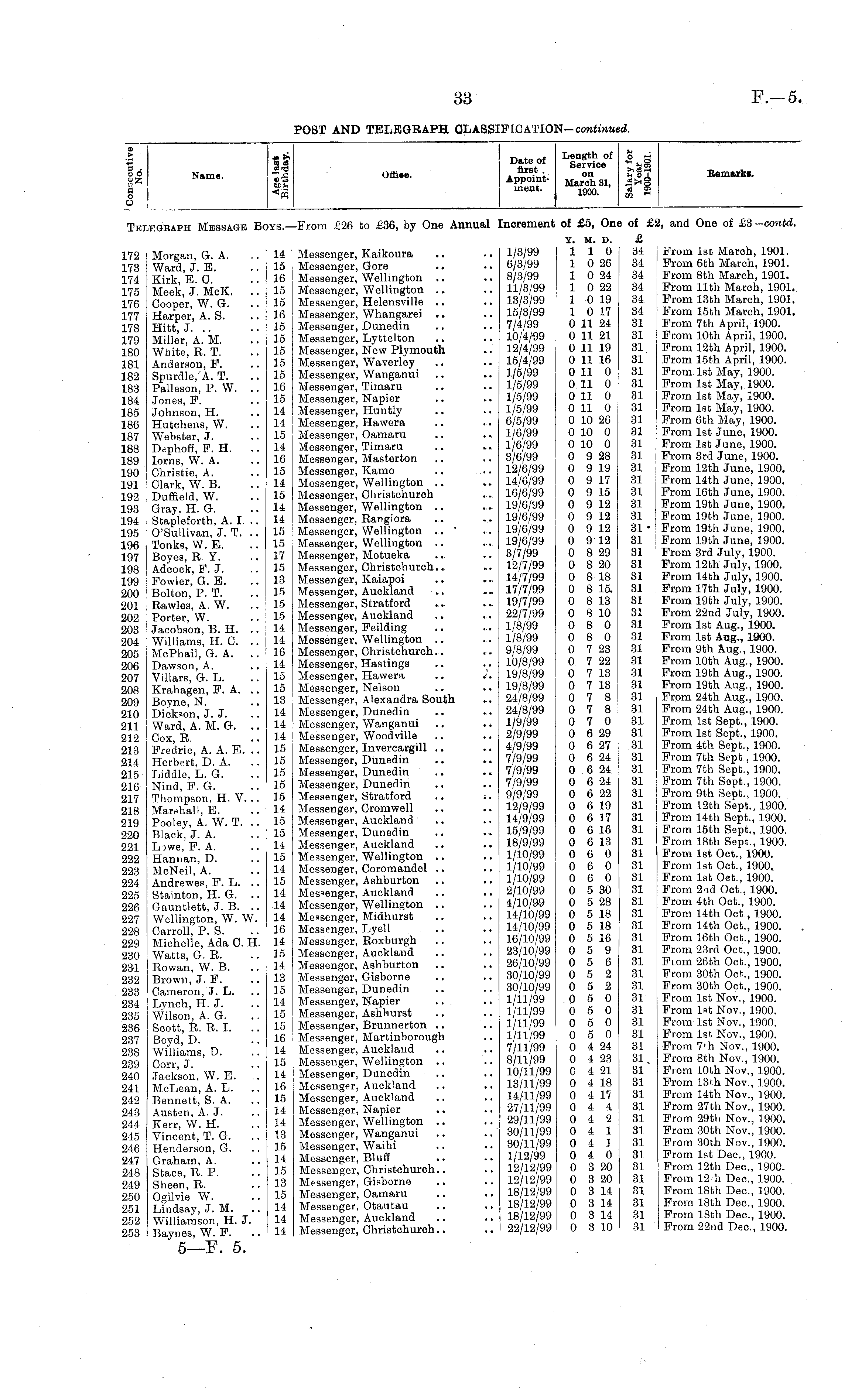 CO > id a o O Name. ■» it cSoJ • | an Office. . flrB * i on Appoint- Mttroh 31 ment - 1900. u >ic3 .h 4 v X £><9 03 Os JO rt Remark!. Te egraph Message Bi IYS.--From £26 to £36, by One Annual increment of £5, Om of £'. !, and One of £3— contd. .72 .73 .74 .75 .76 .77 .78 .79 .80 .81 .82 .83 .84 .85 .86 .87 .88 .89 .90 .91 .92 .93 .94 .95 .96 .97 .98 .99 !00 !01 !02 !03 !04 !05 106 !07 !08 109 !10 ill !12 113 !14 !15 !16 il7 ilfi !19 220 !21 !22 223 224 225 226 227 228 229 230 231 232 233 234 235 236 237 238 239 240 241 242 243 244 245 246 247 248 249 250 251 252 253 Morgan, G. A. Ward, J. E. Kirk, E. 0. Meek, J. McK. .. Cooper, W. G. Harper, A. S. Hitt, J. .. Miller, A. M. White, R. T. Anderson, F. Spurdle, A. T. Palleson, P. W. Jones, F. Johnson, H. Hutchens, W. Webster, J. Dephoff, F. H. Iorns, W. A. Christie, A. Clark, W. B. Duffield, W. Gray, H. G. Stapleforth, A. I. .. O'Sullivan, J. T. Tonks, W. E. Boyes, R. Y. Adcock, F. J. Fowler, G. E. Bolton, P. T. Rawles, A. W. Porter, W. Jacobson,B. H. Williams, H. C .. McPhail, G. A. Dawson, A. Villars, G. L. Krahagen, F. A. Boyne, N. Dickson, J. J. Ward, A. M. G. .. Cox, R. Fredric, A. A. E. .. Herbert, D. A. Liddle, L. G. Nind, F. G. Thompson, H. V. .. Mar-hall, E. Pooley, A. W. T. Black, J. A. Lowe, F. A. Hannan, D. McNeil, A. Andrewes, F. L. Stainton, H. G. Gauntlett, J. B. .. Wellington, W. W. Carroll, P. S. Michelle, Ada 0. H. Watts, G. R. Rowan, W. B. Brown, J. F. Cameron, J. L. Lynch, H. J. Wilson, A. G. Scott, R. R. I. Boyd, D. Williams, D. Corr, J. Jackson, W. E. McLean, A. L. Bennett, S. A. Austen, A. J. Kerr, W. H. Vincent, T. G. Henderson, G. Graham, A. Stace, R. P. Sheen,R. Ogilvie W. Lindsay, J. M. Williamson, H. J. Baynes, W. F. 14 15 16 15 15 16 15 15 15 15 15 16 15 14 14 15 14 16 15 14 15 14 14 15 15 17 15 13 15 15 15 14 14 16 14 15 15 13 14 14 14 15 15 15 15 15 14 15 15 14 15 14 15 14 14 14 16 14 15 14 13 15 14 15 15 16 14 15 14 16 15 14 14 13 15 14 15 13 15 14 14 14 Messenger, Kaikoura Messenger, Gore Messenger, Wellington .. Messenger, Wellington Messenger, Helensville Messenger, Whangarei Messenger, Dunedin Messenger, Lyttelton Messenger, New Plymouth Messenger, Waverley Messenger, Wanganui Messenger, Timaru Messenger, Napier Messenger, Huntly Messenger, Hawera Messenger, Oamaru Messenger, Timaru Messenger, Masterton Messenger, Kamo Messenger, Wellington .. Messenger, Christchurch Messenger, Wellington .. Messenger, Rangiora Messenger, Wellington .. Messenger, Wellington .. Messenger, Motueka Messenger, Christchurch Messenger, Kaiapoi Messenger, Auckland Messenger, Stratford Messenger, Auckland Messenger, Feilding Messenger, Wellington Messenger, Christchurch.. Messenger, Hastings Messenger, Hawera Messenger, Nelson Messenger, Alexandra South Messenger, Dunedin Messenger, Wanganui Messenger, Woodville Messenger, Invercargill Messenger, Dunedin Messenger, Dunedin Messenger, Dunedin Messenger, Stratford Messenger, Cromwell Messenger, Auckland Messenger, Dunedin Messenger, Auckland Messenger, Wellington Messenger, Coromandel Messenger, Ashburton Messenger, Auckland Messenger, Wellington Messenger, Midhurst Messenger, Lyell Messenger, Roxburgh Messenger, Auckland Messenger, Ashburton Messenger, Gisborne Messenger, Dunedin Messenger, Napier Messenger, Ashhurst Messenger, Brunnerton Messenger, Martinborough Messenger, Auckland Messenger, Wellington Messenger, Dunedin Messenger, Auckland Messenger, Auckland Messenger, Napier Messenger, Wellington Messenger, Wanganui Messenger, Waihi Messenger, Bluff Messenger, Christchurch.. Messenger, Gisborne Messenger, Oamaru Messenger, Otautau Messenger, Auckland Messenger, Christchurch.. 1/3/99 6/3/99 8/3/99 11/3/99 13/3/99 15/3/99 7/4/99 10/4/99 12/4/99 15/4/99 1/5/99 1/5/99 1/5/99 1/5/99 6/5/99 1/6/99 1/6/99 3/6/99 12/6/99 14/6/99 16/6/99 19/6/99 19/6/99 19/6/99 19/6/99 3/7/99 12/7/99 14/7/99 17/7/99 19/7/99 22/7/99 1/8/99 1/8/99 9/8/99 10/8/99 19/8/99 19/8/99 24/8/99 24/8/99 1/9/99 2/9/99 4/9/99 7/9/99 7/9/99 7/9/99 9/9/99 12/9/99 14/9/99 15/9/99 18/9/99 1/10/99 1/10/99 1/10/99 2/10/99 4/10/99 14/10/99 14/10/99 16/10/99 23/10/99 26/10/99 30/10/99 30/10/99 1/11/99 1/11/99 1/11/99 1/11/99 7/11/99 8/11/99 10/11/99 13/11/99 14/11/99 27/11/99 29/11/99 30/11/99 30/11/99 1/12/99 12/12/99 12/12/99 18/12/99 18/12/99 18/12/99 22/12/99 Y. M. D. 110 1 0 26 1 0 24 1 0 22 1 0 19 1 0 17 0 11 24 0 11 21 0 11 19 0 11 16 0 11 0 0 11 0 0 11 0 0 11 0 0 10 26 0 10 0 0 10 0 0 9 28 0 9 19 0 9 17 0 9 15 0 9 12 0 9 12 0 9 12 0 9 12 0 8 29 0 8 20 0 8 18 0 8 15. 0 8 13 0 8 10 0 8 0 0 8 0 0 7 23 0 7 22 0 7 13 0 7 13 0 7 8 0 7 8 0 7 0 0 6 29 0 6 27 0 6 24 0 6 24 0 6 24 0 6 22 0 6 19 0 6 17 0 6 16 0 6 13 0 6 0 0 6 0 0 6 0 0 5 30 0 5 28 0 5 18 0 5 18 0 5 16 0 5 9 0 5 6 0 5 2 0 5 2 0 5 0 0 5 0 0 5 0 0 5 0 0 4 24 0 4 23 C 4 21 0 4 18 0 4 17 0 4 4 0 4 2 0 4 1 0 4 1 0 4 0 0 3 20 0 3 20 0 3 14 0 3 14 0 3 14 0 3 10 £ 34 34 34 34 34 34 31 31 31 31 31 31 31 31 31 31 31 31 31 31 31 31 31 31 • 31 31 31 31 31 31 31 31 31 31 31 31 31 31 31 31 31 81 31 31 31 31 31 31 31 31 31 31 31 31 31 31 31 31 31 31 31 31 31 31 31 31 31 31 31 31 31 31 31 31 31 31 31 31 31 31 31 31 From 1st March, 1901. From 6th March, 1901. From 8th March, 1901. From 11th March, 1901. From 13th March, 1901. From 15th March, 1901. From 7th April, 1900. From 10th April, 1900. From 12th April, 1900. From 15th April, 1900. From. 1st May, 1900. From 1st May, 1900. From 1st May, 1900. From 1st May, 1900. From 6th May, 1900. From 1st June, 1900. From 1st June, 1900. From 3rd June, 1900. From 12th June, 1900. From 14th June, 1900. From 16th June, 1900. From 19th June, 1900. From 19th June, 1900. From 19th June, 1900. From 19th June, 1900. From 3rd July, 1900. From 12th July, 1900. From 14th July, 1900. From 17th July, 1900. From 19th July, 1900. From 22nd July, 1900. From 1st Aug., 1900. From 1st Aug., 1900. From 9th Aug., 1900. From 10th Aug., 1900. From 19th Aug., 1900. From 19th Aug., 1900. From 24th Aug., 1900. From 24th Aug., 1900. From 1st Sept.