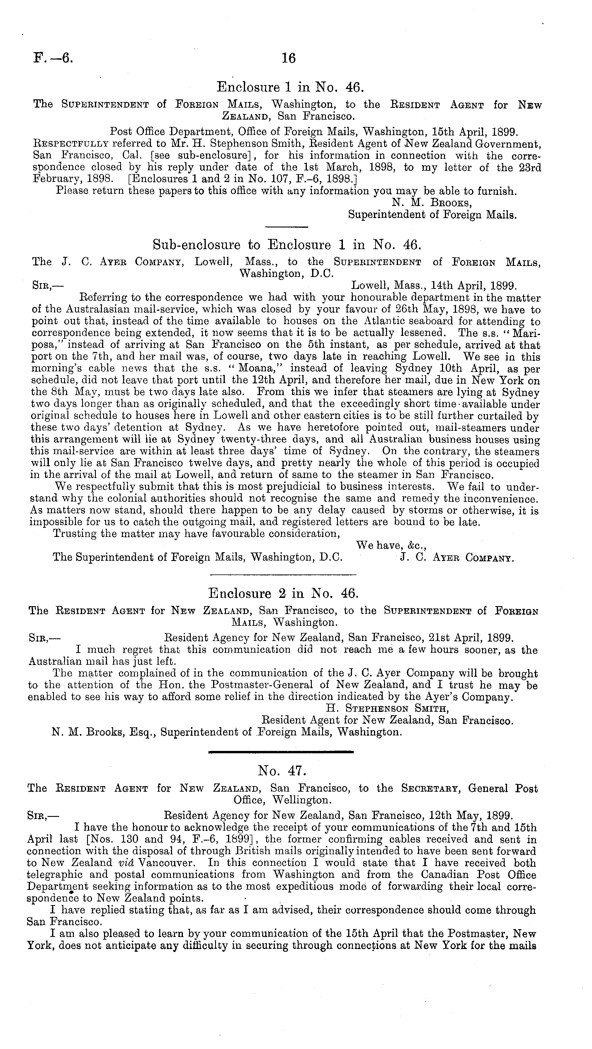 Sub-enclosure to Enclosure 1 in No. 46. The J. 0. Ayee Company, Lowell, Mass., to the Superintendent of Foreign Mails, Washington, D.C. Sir,— Lowell, Mass., 14th April, 1899. Referring to the correspondence we had with your honourable department in the matter of the Australasian mail-service, which was closed by your favour of 26th May, 1898, we have to point out that, instead of the time available to houses on the Atlantic seaboard for attending to correspondence being extended, it now seems that it is to be actually lessened. The s.s. " Mariposa," instead of arriving at San Francisco on the sth instant, as per schedule, arrived at that port on the 7th, and her mail was, of course, two days late in reaching Lowell. We see in this morning's cable news that the s.s. " Moana," instead of leaving Sydney 10th April, as per schedule, did not leave that port until the 12th April, and therefore her mail, due in New York on the Bth May, must be two days late also. From this we infer that steamers are lying at Sydney two days longer than as originally scheduled, and that the exceedingly short time available under original schedule to houses here in Lowell and other eastern cities is to be still further curtailed by these two days' detention at Sydney. As we have heretofore pointed out, mail-steamers under this arrangement will lie at Sydney twenty-three days, and all Australian business houses using this mail-service are within at least three days' time of Sydney. On the contrary, the steamers will only lie at San Francisco twelve days, and pretty nearly the whole of this period is occupied in the arrival of the mail at Lowell, and return of same to the steamer in San Francisco. We respectfully submit that this is most prejudicial to business interests. We fail to understand why the colonial authorities should not recognise the same and remedy the inconvenience. As matters now stand, should there happen to be any delay caused by storms or otherwise, it is impossible for us to catch the outgoing mail, and registered letters are bound to be late. Trusting the matter may have favourable consideration, We have, &c, The Superintendent of Foreign Mails, Washington, D.C. J. C. Ayer Company.