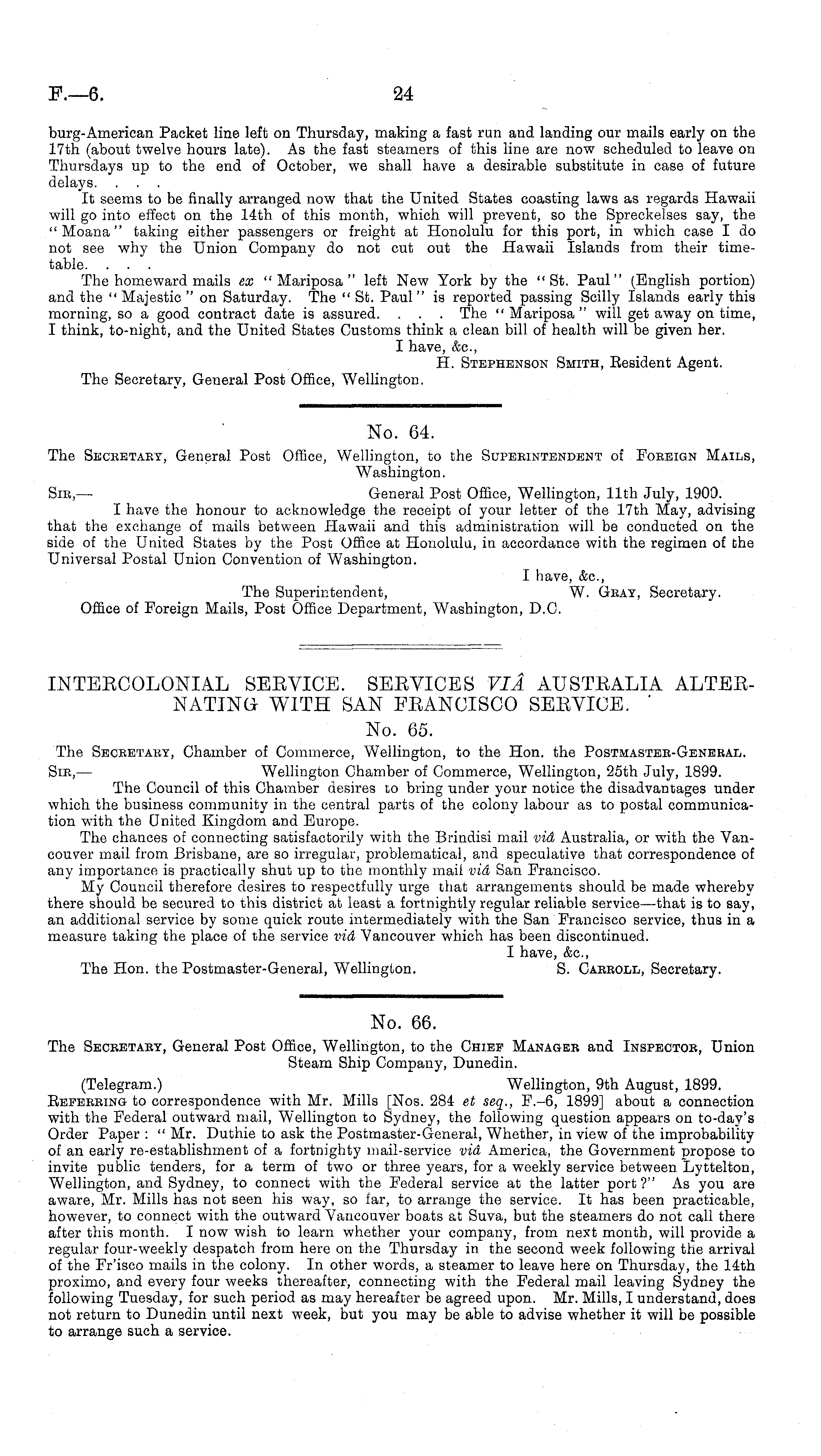 burg-American Packet line left on Thursday, making a fast run and landing our mails early on the 17th (about twelve hours late). As the fast steamers of this line are now scheduled to leave on Thursdays up to the end of October, we shall have a desirable substitute in case of future delays. . . . It seems to be finally arranged now that the United States coasting laws as regards Hawaii will go into effect on the 14th of this month, which will prevent, so the Spreckelses say, the " Moana" taking either passengers or freight at Honolulu for this port, in which case Ido not see why the Union Company do not cut out the Hawaii Islands from their timetable. . . . The homeward mails ex " Mariposa " left New York by the "St. Paul" (English portion) and the "Majestic "on Saturday. The " St. Paul" is reported passing Scilly Islands early this morning, so a good contract date is assured. . . . The " Mariposa" will get away on time, I think, to-night, and the United States Customs think a clean bill of health will be given her. I have, &c, H. Stephenson Smith, Eesident Agent. The Secretary, General Post Office, Wellington.