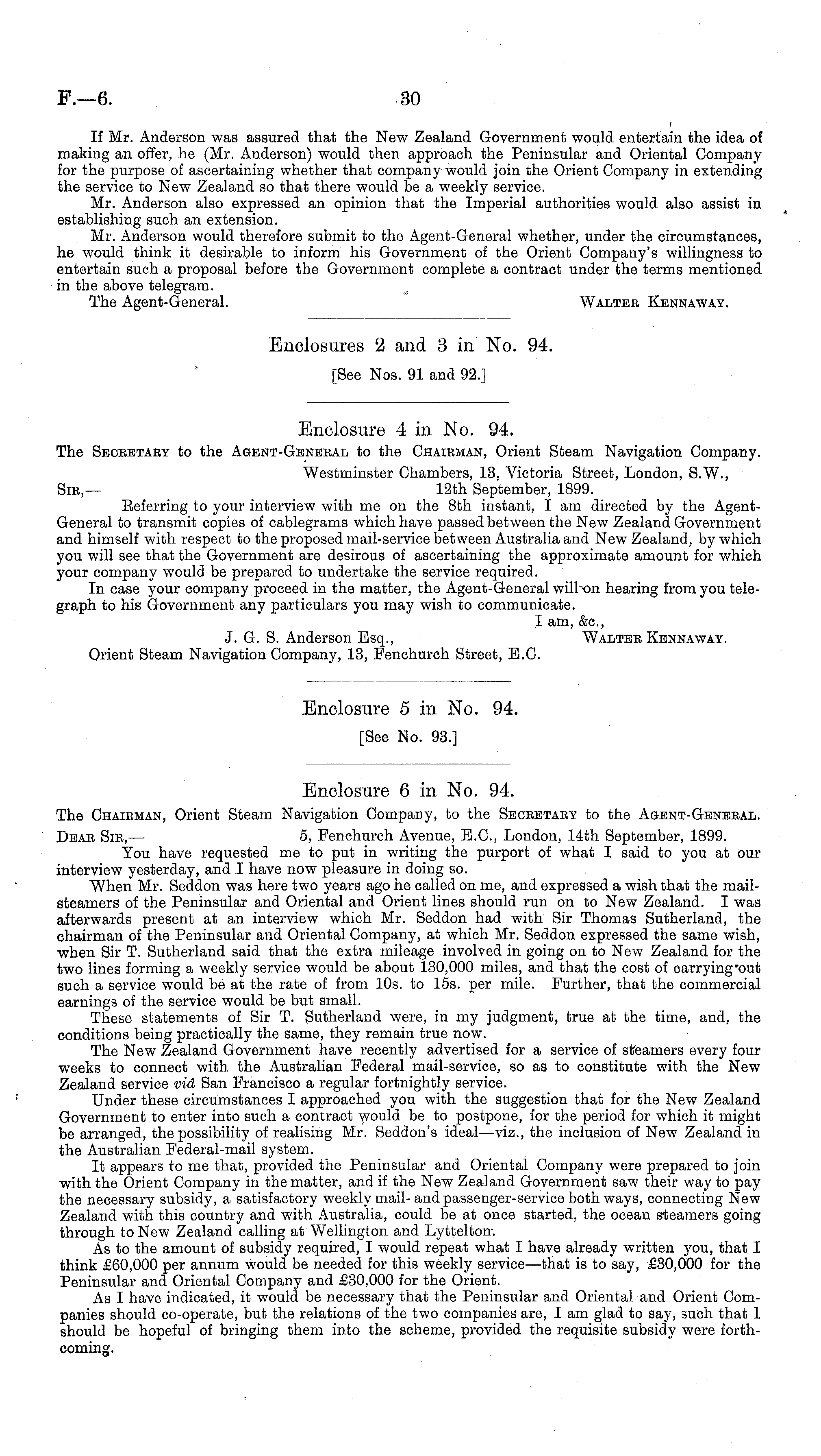 Enclosure 4 in No. 94. The Seceetaey to the Agent-Genebal to the Chairman, Orient Steam Navigation Company. Westminster Chambers, 13. Victoria Street, London, S.W., Sib,— 12th September, 1899. Eeferring to your interview with me on the Bth instant, I am directed by the AgentGeneral to transmit copies of cablegrams which have passed between the New Zealand Government and himself with respect to the proposed mail-service between Australia and New Zealand, by which you will see that the Government are desirous of ascertaining the approximate amount for which your company would be prepared to undertake the service required. In case your company proceed in the matter, the Agent-General will on hearing from you telegraph to his Government any particulars you may wish to communicate. I am, &c, J. G. S. Anderson Esq., Waltee Kennaway. Orient Steam Navigation Company, 13, Fenchureh Street, E.C.