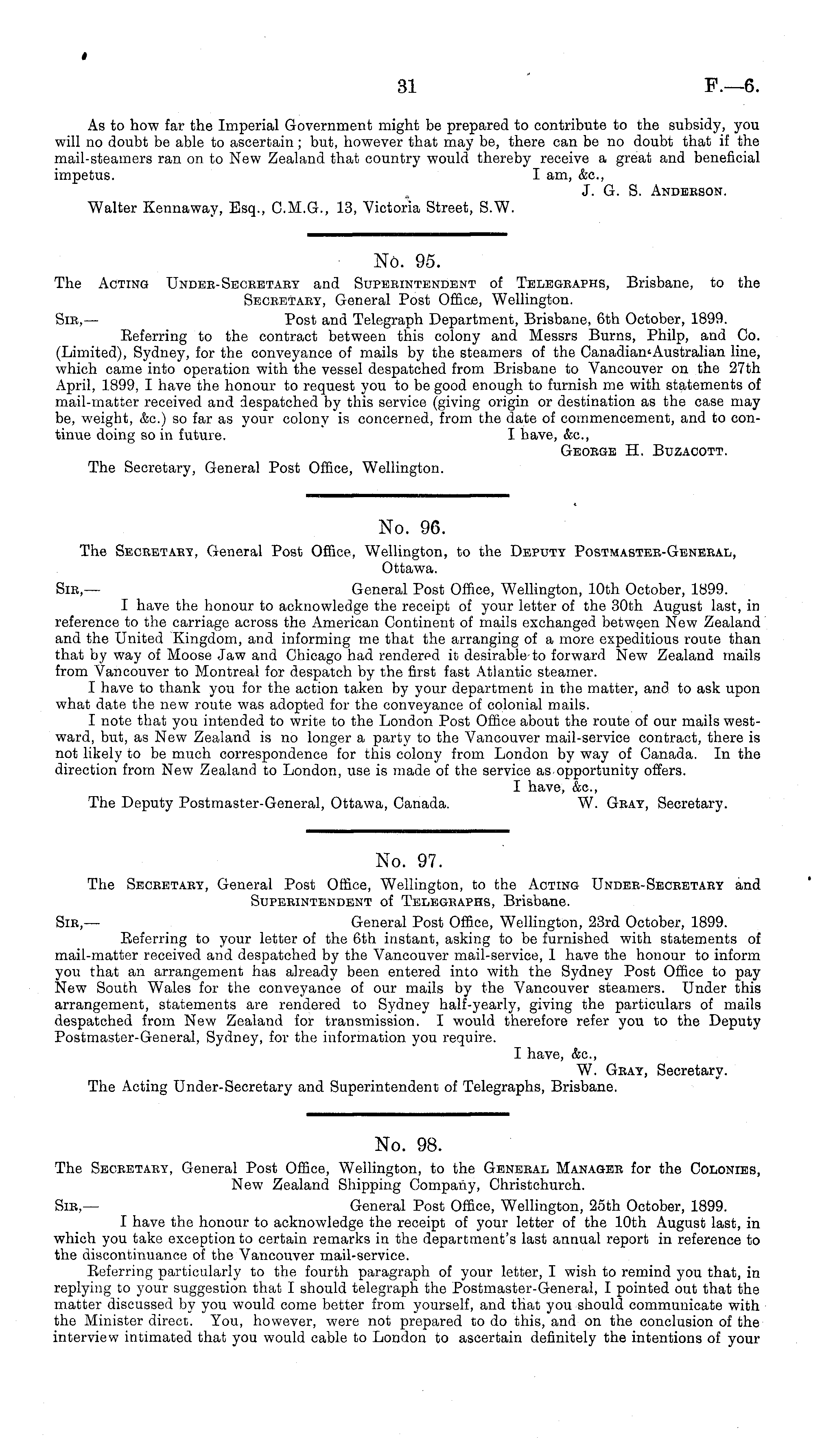 No. 98. The Seceetaey, General Post Office, Wellington, to the Geneeal Manages for the Colonies, New Zealand Shipping Company, Christchurch. Sib,— General Post Office, Wellington, 25th October, 1899. I have the honour to acknowledge the receipt of your letter of the 10th August last, in which you take exception to certain remarks in the department's last annual report in reference to the discontinuance of the Vancouver mail-service. Eeferring particularly to the fourth paragraph of your letter, I wish to remind you that, in replying to your suggestion that I should telegraph the Postmaster-General, I pointed out that the matter discussed by you would come better from yourself, and that you should communicate with the Minister direct. You, however, were not prepared to do this, and on the conclusion of the interview intimated that you would cable to London to ascertain definitely the intentions of your