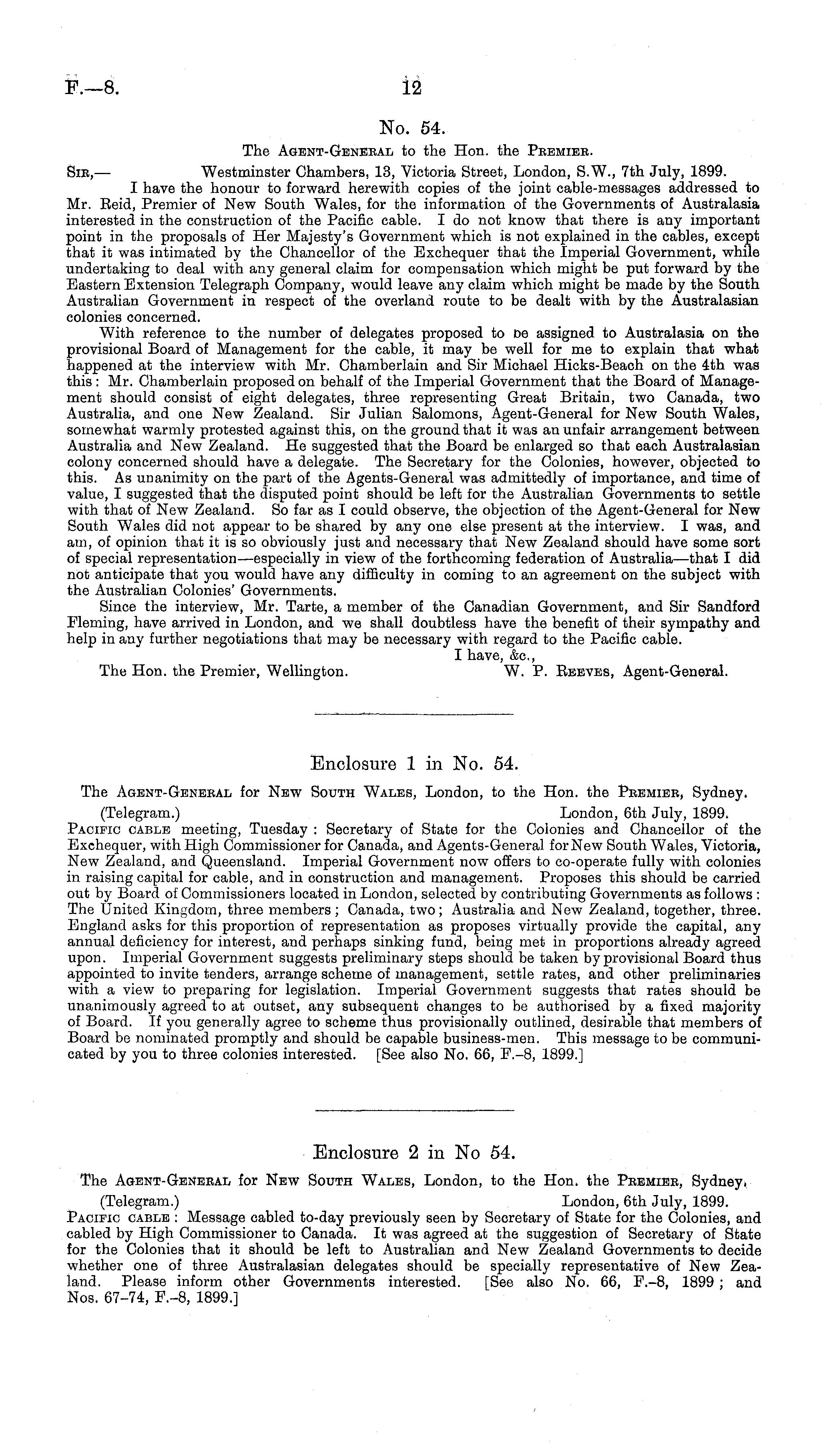 No. 54. The Agent-Genebal to the Hon. the Peemieb. Sic, — Westminster Chambers, 13, Victoria Street, London, S.W., 7th July, 1899. I have the honour to forward herewith copies of the joint cable-messages addressed to Mr. Reid, Premier of New South Wales, for the information of the Governments of Australasia interested in the construction of the Pacific cable. I do not know that there is any important point in the proposals of Her Majesty's Government which is not explained in the cables, except that it was intimated by the Chancellor of the Exchequer that the Imperial Government, while undertaking to deal with any general claim for compensation which might be put forward by the Eastern Extension Telegraph Company, would leave any claim which might be made by the South Australian Government in respect of the overland route to be dealt with by the Australasian colonies concerned. With reference to the number of delegates proposed to De assigned to Australasia on the provisional Board of Management for the cable, it may be well for me to explain that what happened at the interview with Mr. Chamberlain and Sir Michael Hicks-Beach on the 4th was this : Mr. Chamberlain proposed on behalf of the Imperial Government that the Board of Management should consist of eight delegates, three representing Great Britain, two Canada, two Australia, and one New Zealand. Sir Julian Salomons, Agent-General for New South Wales, somewhat warmly protested against this, on the ground that it was an unfair arrangement between Australia and New Zealand. He suggested that the Board be enlarged so that each Australasian colony concerned should have a delegate. The Secretary for the Colonies, however, objected to this. As unanimity on the part of the Agents-General was admittedly of importance, and time of value, I suggested that the disputed point should be left for the Australian Governments to settle with that of New Zealand. So far as I could observe, the objection of the Agent-General for New South Wales did not appear to be shared by any one else present at the interview. I was, and am, of opinion that it is so obviously just and necessary that New Zealand should have some sort of special representation—especially in view of the forthcoming federation of Australia—that I did not anticipate that you would have any difficulty in coming to an agreement on the subject with the Australian Colonies' Governments. Since the interview, Mr. Tarte, a member of the Canadian Government, and Sir Sandford Fleming, have arrived in London, and we shall doubtless have the benefit of their sympathy and help in any further negotiations that may be necessary with regard to the Pacific cable. I have, &c, The Hon. the Premier, Wellington. W. P. Reeves, Agent-General.