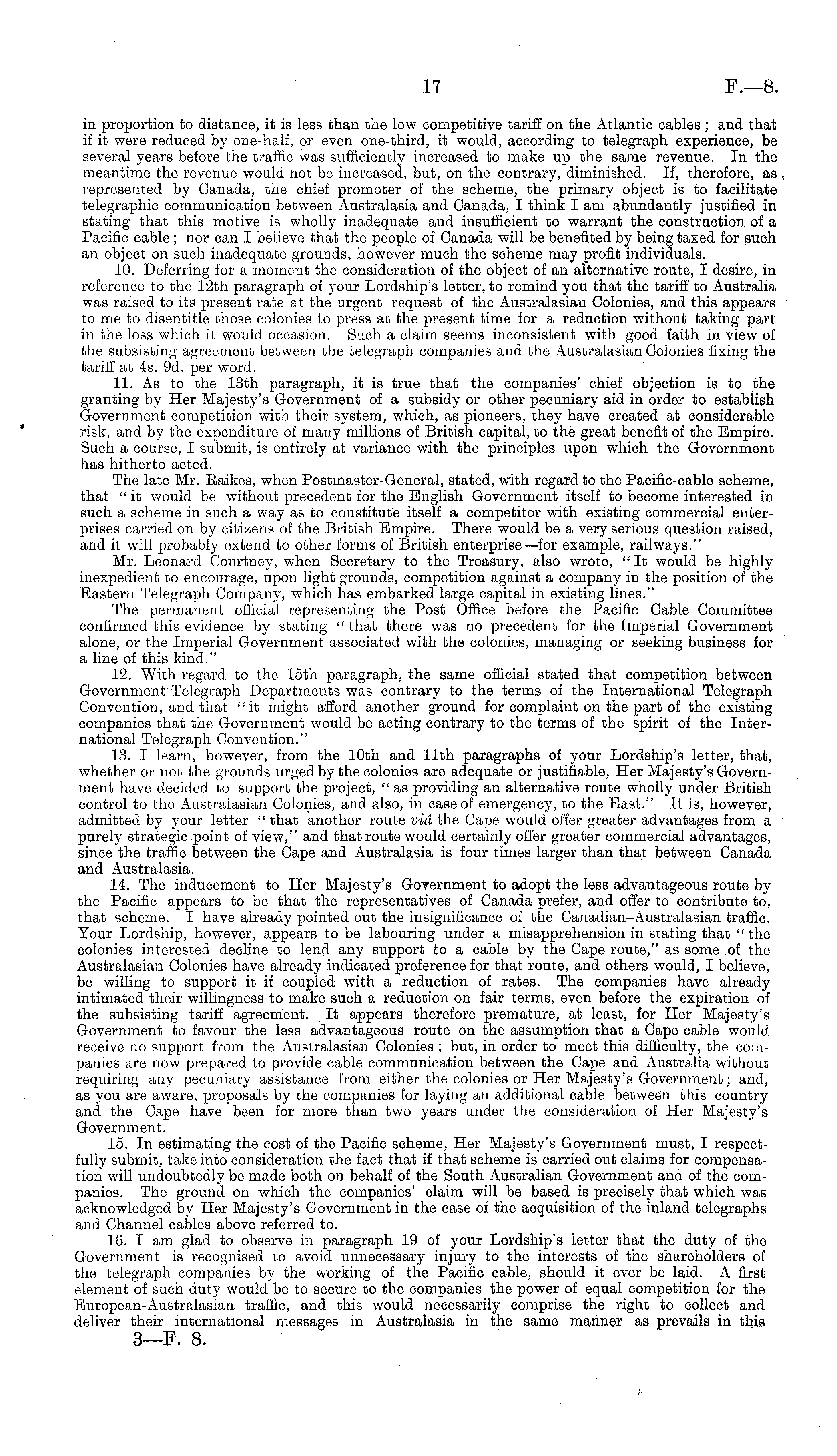 in proportion to distance, it is less than the low competitive tariff on the Atlantic cables ; and that if it were reduced by one-half, or even one-third, it would, according to telegraph experience, be several years before the traffic was sufficiently increased to make up the same revenue. In the meantime the revenue would not be increased, but, on the contrary, diminished. If, therefore, as represented by Canada, the chief promoter of the scheme, the primary object is to facilitate telegraphic communication between Australasia and Canada, I think I am abundantly justified in stating that this motive is wholly inadequate and insufficient to warrant the construction of a Pacific cable; nor can I believe that the people of Canada will be benefited by being taxed for such an object on such inadequate grounds, however much the scheme may profit individuals. 10. Deferring for a moment the consideration of the object of an alternative route, I desire, in reference to the 12th paragraph of your Lordship's letter, to remind you that the tariff to Australia was raised to its present rate at the urgent request of the Australasian Colonies, and this appears to me to disentitle those colonies to press at the present time for a reduction without taking part in the loss which it would occasion. Such a claim seems inconsistent with good faith in view of the subsisting agreement between the telegraph companies and the Australasian Colonies fixing the tariff at 4s. 9d. per word. 11. As to the 13th paragraph, it is true that the companies' chief objection is to the granting by Her Majesty's Government of a subsidy or other pecuniary aid in order to establish Government competition with their system, which, as pioneers, they have created at considerable risk, and by the expenditure of many millions of British capital, to the great benefit of the Empire. Such a course, I submit, is entirely at variance with the principles upon which the Government has hitherto acted. The late Mr. Eaikes, when Postmaster-General, stated, with regard to the Pacific-cable scheme, that "it would be without precedent for the English Government itself to become interested in such a scheme in such a way as to constitute itself a competitor with existing commercial enterprises carried on by citizens of the British Empire. There would be a very serious question raised, and it will probably extend to other forms of British enterprise —for example, railways." Mr. Leonard Courtney, when Secretary to the Treasury, also wrote, "It would be highly inexpedient to encourage, upon light grounds, competition against a company in the position of the Eastern Telegraph Company, which has embarked large capital in existing lines." The permanent official representing the Post Office before the Pacific Cable Committee confirmed this evidence by stating " that there was no precedent for the Imperial Government alone, or the Imperial Government associated with the colonies, managing or seeking business for a line of this kind." 12. With regard to the 15th paragraph, the same official stated that competition between Government Telegraph Departments was contrary to the terms of the International Telegraph Convention, and that "it might afford another ground for complaint on the part of the existing companies that the Government would be acting contrary to the terms of the spirit of the International Telegraph Convention." 13. I learn, however, from the 10th and 11th paragraphs of your Lordship's letter, that, whether or not the grounds urged by the colonies are adequate or justifiable, Her Majesty's Government have decided to support the project, " as providing an alternative route wholly under British control to the Australasian Colonies, and also, in case of emergency, to the East." It is, however, admitted by your letter " that another route via the Cape would offer greater advantages from a purely strategic point of view," and that route would certainly offer greater commercial advantages, since the traffic between the Cape and Australasia is four times larger than that between Canada and Australasia. 14. The inducement to Her Majesty's Government to adopt the less advantageous route by the Pacific appears to be that the representatives of Canada prefer, and offer to contribute to, that scheme. I have already pointed out the insignificance of the Canadian-Australasian traffic. Tour Lordship, however, appears to be labouring under a misapprehension in stating that "the colonies interested decline to lend any support to a cable by the Cape route," as some of the Australasian Colonies have already indicated preference for that route, and others would, I balieve, be willing to support it if coupled with a reduction of rates. The companies have already intimated their willingness to make such a reduction on fair terms, even before the expiration of the subsisting tariff agreement. It appears therefore premature, at least, for Her Majesty's Government to favour the less advantageous route on the assumption that a Cape cable would receive no support from the Australasian Colonies ; but, in order to meet this difficulty, the companies are now prepared to provide cable communication between the Cape and Australia without requiring any pecuniary assistance from either the colonies or Her Majesty's Government; and, as you are aware, proposals by the companies for laying an additional cable between this country and the Cape have been for more than two years under the consideration of Her Majesty's Government. 15. In estimating the cost of the Pacific scheme, Her Majesty's Government must, I respectfully submit, take into consideration the fact that if that scheme is carried out claims for compensation will undoubtedly be made both on behalf of the South Australian Government and of the companies. The ground on which the companies' claim will be based is precisely that which was acknowledged by Her Majesty's Government in the case of the acquisition of the i