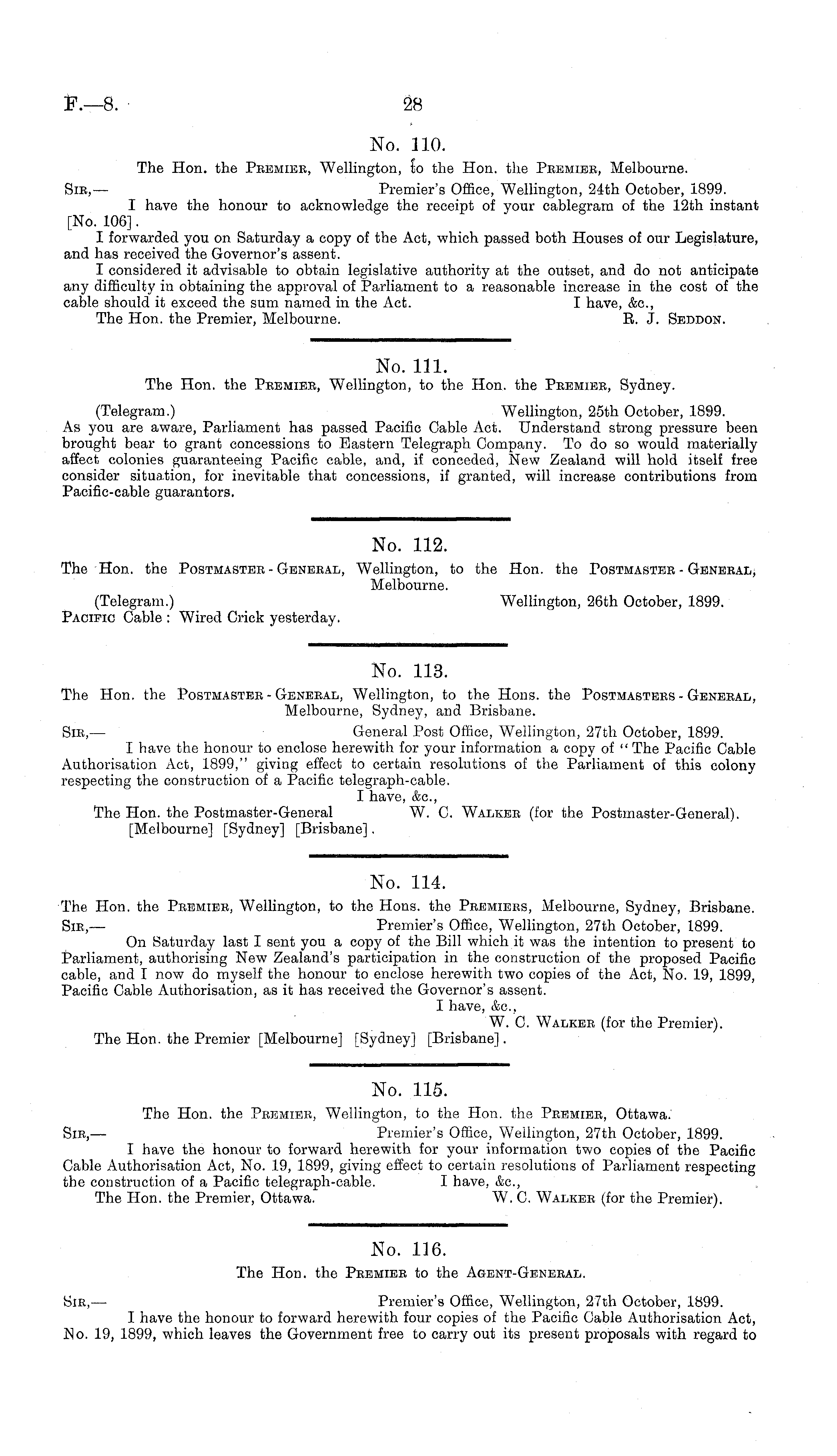 No. 114. The Hon. the Pbemieb, Wellington, to the Hons. the Peemiees, Melbourne, Sydney, Brisbane. Sib,— Premier's Office, Wellington, 27th October, 1899. On Saturday last I sent you a copy of the Bill which it was the intention to present to Parliament, authorising New Zealand's participation in the construction of the proposed Pacific cable, and I now do myself the honour to enclose herewith two copies of the Act, No. 19, 1899, Pacific Cable Authorisation, as it has received the Governor's assent. I have, &c, W. C. Walkee (for the Premier). The Hon. the Premier [Melbourne] [Sydney] [Brisbane].
