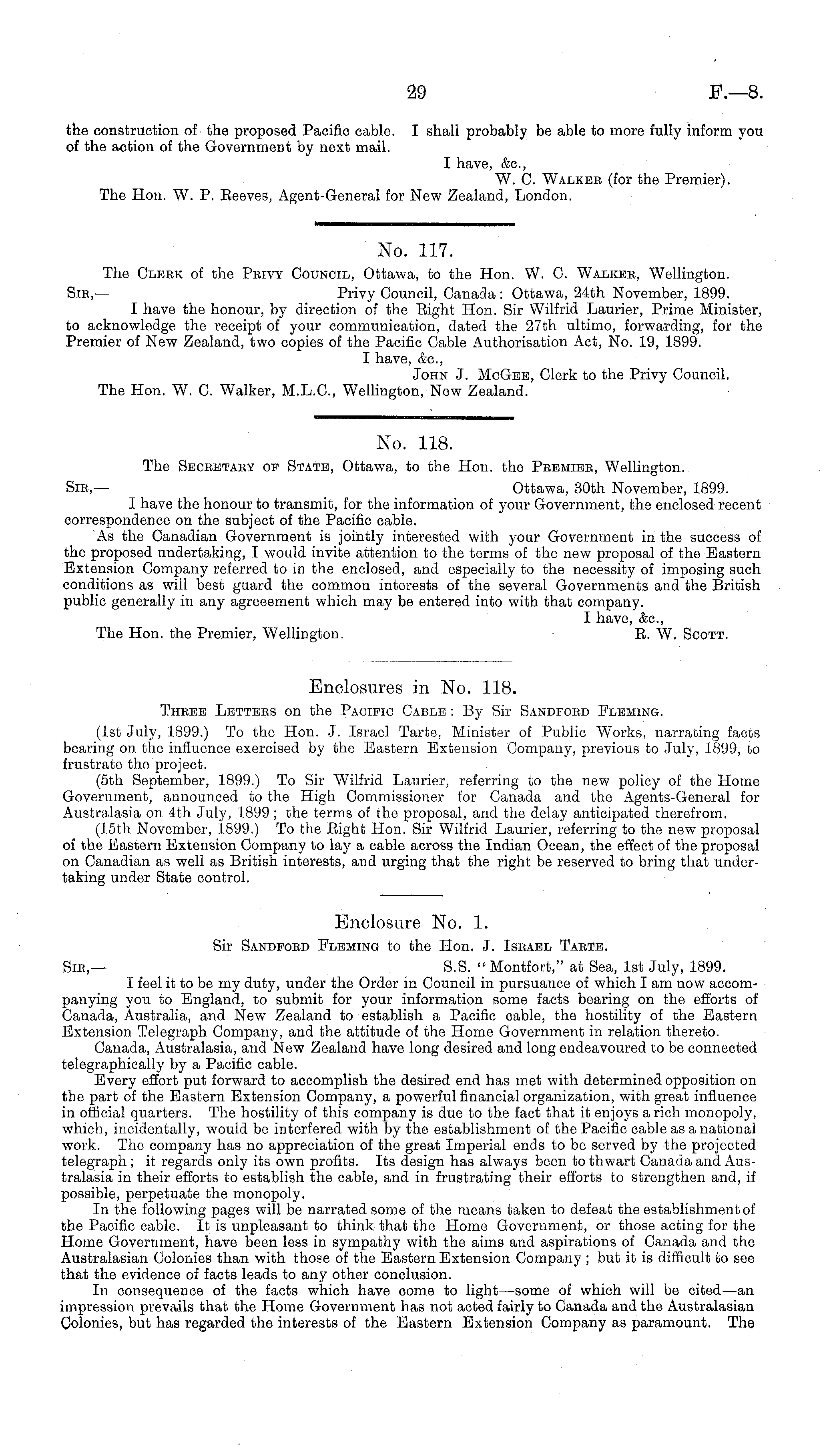 Enclosures in No. 118. Theee Lettebs on the Pacific Cable : By Sir Sandfoed Fleming. (Ist July, 1899.) To the Hon. J. Israel Tarte, Minister of Public Works, narrating facts bearing on the influence exercised by the Eastern Extension Company, previous to July, 1899, to frustrate the project. (sth September, 1899.) To Sir Wilfrid Laurier, referring to the new policy of the Home Government, announced to the High Commissioner for Canada and the Agents-General for Australasia on 4th July, 1899 ; the terms of the proposal, and the delay anticipated therefrom. (15th November, 1899.) To the Right Hon. Sir Wilfrid Laurier, referring to the new proposal of the Eastern Extension Company to lay a cable across the Indian Ocean, the effect of the proposal on Canadian as well as British interests, and urging that the right be reserved to bring that undertaking under State control.