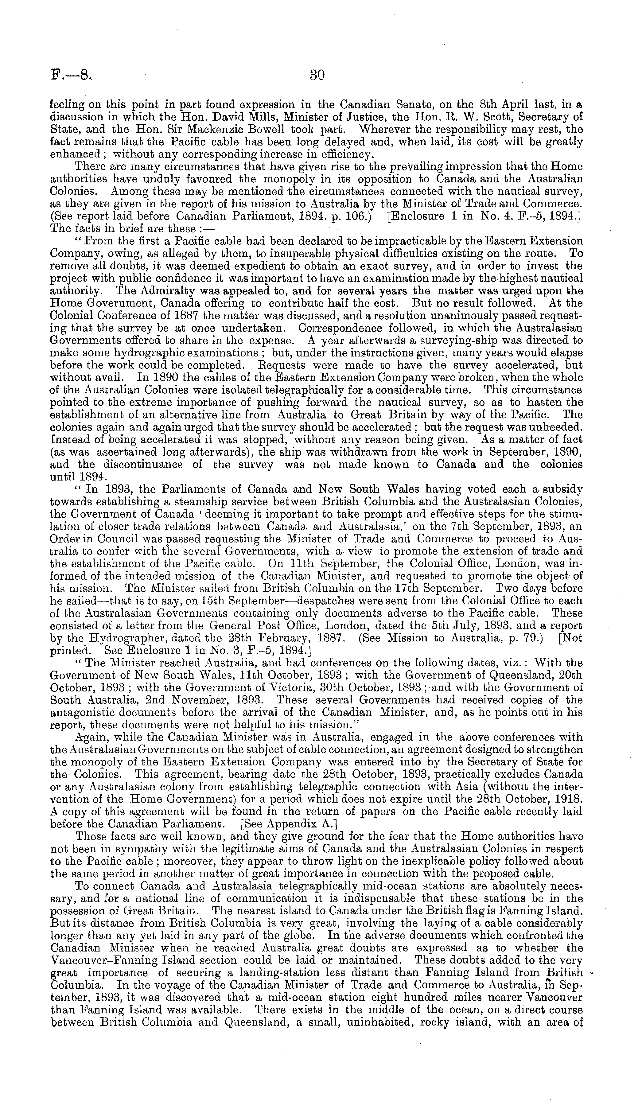 feeling on this point in part found expression in the Canadian Senate, on the Bth April last, in a discussion in which the Hon. David Mills, Minister of Justice, the Hon. R. W. Scott, Secretary of State, and the Hon. Sir Mackenzie Bowell took part. Wherever the responsibility may rest, the fact remains that the Pacific cable has been long delayed and, when laid, its cost will be greatly enhanced; without any corresponding increase in efficiency. There are many circumstances that have given rise to the prevailing impression that the Home authorities have unduly favoured the monopoly in its opposition to Canada and the Australian Colonies. Among these may be mentioned the circumstances connected with the nautical survey, as they are given in the report of his mission to Australia by the Minister of Trade and Commerce. (See report laid before Canadian Parliament, 1894. p. 106.) [Enclosure lin No. 4. F.-5,1894.] The facts in brief are these :— " From the first a Pacific cable had been declared to be impracticable by the Eastern Extension Company, owing, as alleged by them, to insuperable physical difficulties existing on the route. To remove all doubts, it was deemed expedient to obtain an exact survey, and in order to invest the project with public confidence it was important to have an examination made by the highest nautical authority. The Admiralty was appealed to, and for several years the matter was urged upon the Home Government, Canada offering to contribute half the cost. But no result followed. At the Colonial Conference of 1887 the matter was discussed, and a resolution unanimously passed requesting that the survey be at once undertaken. Correspondence followed, in which the Australasian Governments offered to share in the expense. A year afterwards a surveying-ship was directed to make some hydrographic examinations ; but, under the instructions given, many years would elapse before the work could be completed. Requests were made to have the survey accelerated, but without avail. In 1890 the cables of the Eastern Extension Company were broken, when the whole of the Australian Colonies were isolated telegraphically for a considerable time. This circumstance pointed to the extreme importance of pushing forward the nautical survey, so as to hasten the establishment of an alternative line from Australia to Great Britain by way of the Pacific. The colonies again and again urged that the survey should be accelerated ; but the request was unheeded. Instead of being accelerated it was stopped, without any reason being given. As a matter of fact (as was ascertained long afterwards), the ship was withdrawn from the work in September, 1890, and the discontinuance of the survey was not made known to Canada and the colonies until 1894. " In 1893, the Parliaments of Canada and New South Wales having voted each a subsidy towards establishing a steamship service between British Columbia and the Australasian Colonies, the Government of Canada ' deeming it important to take prompt and effective steps for the stimulation of closer trade relations between Canada and Australasia,' on the 7th September, 1893, an Order in Council was passed requesting the Minister of Trade and Commerce to proceed to Australia to confer with the several Governments, with a view to promote the extension of trade and the establishment of the Pacific cable. On 11th September, the Colonial Office, London, was informed of the intended mission of the Canadian Minister, and requested to promote the object of his mission. The Minister sailed from British Columbia on the 17th September. Two days before he sailed—that is to say, on 15th September —despatches were sent from the Colonial Office to each of the Australasian Governments containing only documents adverse to the Pacific cable. These consisted of a letter from the General Post Office, London, dated the sth July, 1893, and a report by the Hydrographer, dated the 28th February, 1887. (See Mission to Australia, p. 79.) [Not printed. See Enclosure lin No. 3, F.-5, 1894.] " The Minister reached Australia, and had conferences on the following dates, viz.: With the Government of New South Wales, 11th October, 1893; with the Government of Queensland, 20th October, 1893 ; with the Government of Victoria, 30th October, 1893 ; and with the Government of South Australia, 2nd November, 1893. These several Governments had received copies of the antagonistic documents before the arrival of the Canadian Minister, and, as he points out in his report, these documents were not helpful to his mission." Again, while the Canadian Minister was in Australia, engaged in the above conferences with the Australasian Governments on the subject of cable connection, an agreement designed to strengthen the monopoly of the Eastern Extension Company was entered into by the Secretary of State for the Colonies. This agreement, bearing date the 28th October, 1893, practically excludes Canada or any Australasian colony from establishing telegraphic connection with Asia (without the intervention of the Home Government) for a period which does not expire until the 28th October, 1918. A copy of this agreement will be found in the return of papers on the Pacific cable recently laid before the Canadian Parliament. [See Appendix A.] These facts are well known, and they give ground for the fear that the Home authorities have not been in sympathy with the legitimate aims of Canada and the Australasian Colonies in respect to the Pacific cable ; moreover, they appear to throw light on the inexplicable policy followed about the same period in another matter of great importance in connection with the proposed cable. To connect Canada and Australasia telegraphically mid-ocean stations are absolutely necessary, and for a national line of communication it is indispensable that these stations be in the possession of Great Britain. The nearest island to Canada under the British flag is Fanning Island. But its distance 