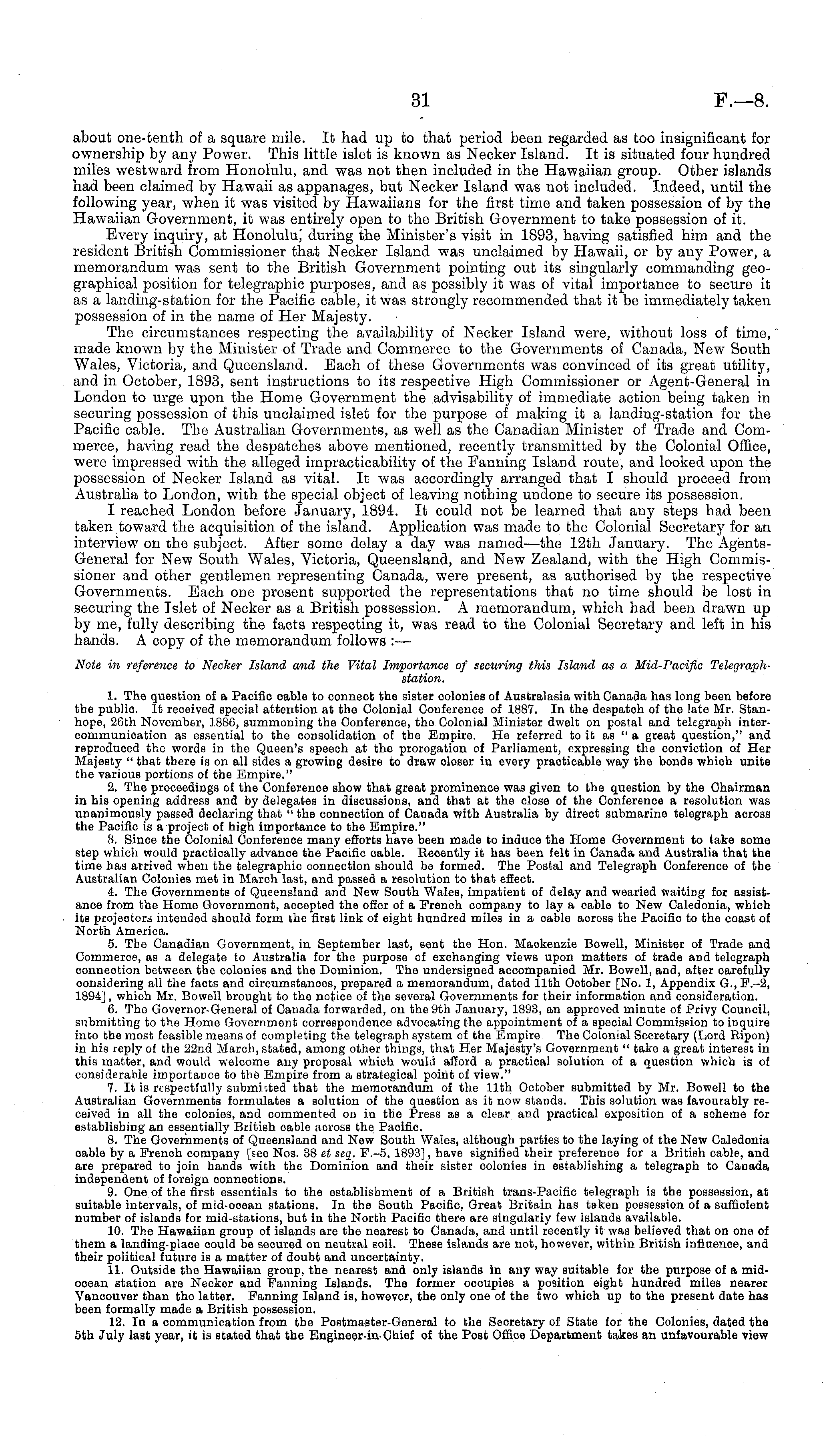 about one-tenth of a square mile. It had up to that period been regarded as too insignificant for ownership by any Power. This little islet is known as Necker Island. It is situated four hundred miles westward from Honolulu, and was not then included in the Hawaiian group. Other islands had been claimed by Hawaii as appanages, but Necker Island was not included. Indeed, until the following year, when it was visited by Hawaiians for the first time and taken possession of by the Hawaiian Government, it was entirely open to the British Government to take possession of it. Every inquiry, at Honolulu,' during the Minister's visit in 1893, having satisfied him and the resident British Commissioner that Necker Island was unclaimed by Hawaii, or by any Power, a memorandum was sent to the British Government pointing out its singularly commanding geographical position for telegraphic purposes, and as possibly it was of vital importance to secure it as a landing-station for the Pacific cable, it was strongly recommended that it be immediately taken possession of in the name of Her Majesty. The circumstances respecting the availability of Necker Island were, without loss of time, made known by the Minister of Trade and Commerce to the Governments of Canada, New South Wales, Victoria, and Queensland. Each of these Governments was convinced of its great utility, and in October, 1893, sent instructions to its respective High Commissioner or Agent-General in London to urge upon the Home Government the advisability of immediate action being taken in securing possession of this unclaimed islet for the purpose of making it a landing-station for the Pacific cable. The Australian Governments, as well as the Canadian Minister of Trade and Commerce, having read the despatches above mentioned, recently transmitted by the Colonial Office, were impressed with the alleged impracticability of the Fanning Island route, and looked upon the possession of Necker Island as vital. It was accordingly arranged that I should proceed from Australia to London, with the special object of leaving nothing undone to secure its possession. I reached London before January, 1894. It could not be learned that any steps had been taken toward the acquisition of the island. Application was made to the Colonial Secretary for an interview on the subject. After some delay a day was named-—the 12th January. The AgentsGeneral for New South Wales, Victoria, Queensland, and New Zealand, with the High Commissioner and other gentlemen representing Canada, were present, as authorised by the respective Governments. Each one present supported the representations that no time should be lost in securing the Islet of Necker as a British possession. A memorandum, which had been drawn up by me, fully describing the facts respecting it, was read to the Colonial Secretary and left in his hands. A copy of the memorandum follows : — Note in reference to Necker Island and the Vital Importance of securing this Island as a Mid-Pacific Telegraphstation. 1. The question of a Pacific cable to connect the sister colonies of Australasia with Canada has long been before the public. It received special attention at the Colonial Conference of 1887. In the despatch of the late Mr. Stanhope, 26th November, 1886, summoning the Conference, the Colonial Minister dwelt on postal and telegraph intercommunication as essential to the consolidation of the Empire. He referred to it as " a great question," and reproduced the words in the Queen's speech at the prorogation of Parliament, expressing the conviction of Her Majesty " that there is on all sides a growing desire to draw closer in every practicable way the bonds which unite the various portions of the Empire." 2. The proceedings of the Conference show that great prominence was given to the question by the Chairman in his opening address and by delegates in discussions, and that at the close of the Conference a resolution was unanimously passed declaring that " the connection of Canada with Australia by direct submarine telegraph across the Pacific is a project of high importance to the Empire." 3. Since the Colonial Conference many efforts have been made to induce the Home Government to take some step which would practically advance the Pacific cable. Recently it has been felt in Canada and Australia that the time has arrived when the telegraphic connection should be formed. The Postal and Telegraph Conference of the Australian Colonies met in March last, and passed a resolution to that effect. 4. The Governments of Queensland and New South Wales, impatient of delay and wearied waiting for assistance from the Home Government, accepted the offer of a French company to lay a cable to New Caledonia, which its projectors intended should form the first link of eight hundred miles in a cable aoross the Pacific to the coast of North America. 5. The Canadian Government, in September last, sent the Hon. Mackenzie Bowell, Minister of Trade and Commerce, as a delegate to Australia for the purpose of exchanging views upon matters of trade and telegraph connection between the colonies and the Dominion. The undersigned accompanied Mr. Bowell, and, after carefully considering all the faots and circumstances, prepared a memorandum, dated 11th October [No. 1, Appendix G., P.-2, 1894], which Mr. Bowell brought to the notice of the several Governments for their information and consideration. 6. The Governor-General of Canada forwarded, on the 9th January, 1893, an approved minute of Privy Council, submitting to the Home Government correspondence advocating the appointment of a special Commission to inquire into the most feasible means of completing the telegraph system of tbe Empire The Colonial Secretary (Lord Bipon) in his reply of the 22nd March, stated, among other things, that Her Majesty's Government " take a great interest in this matter, and would welcome any proposal which would afford a practical solution of a question which i
