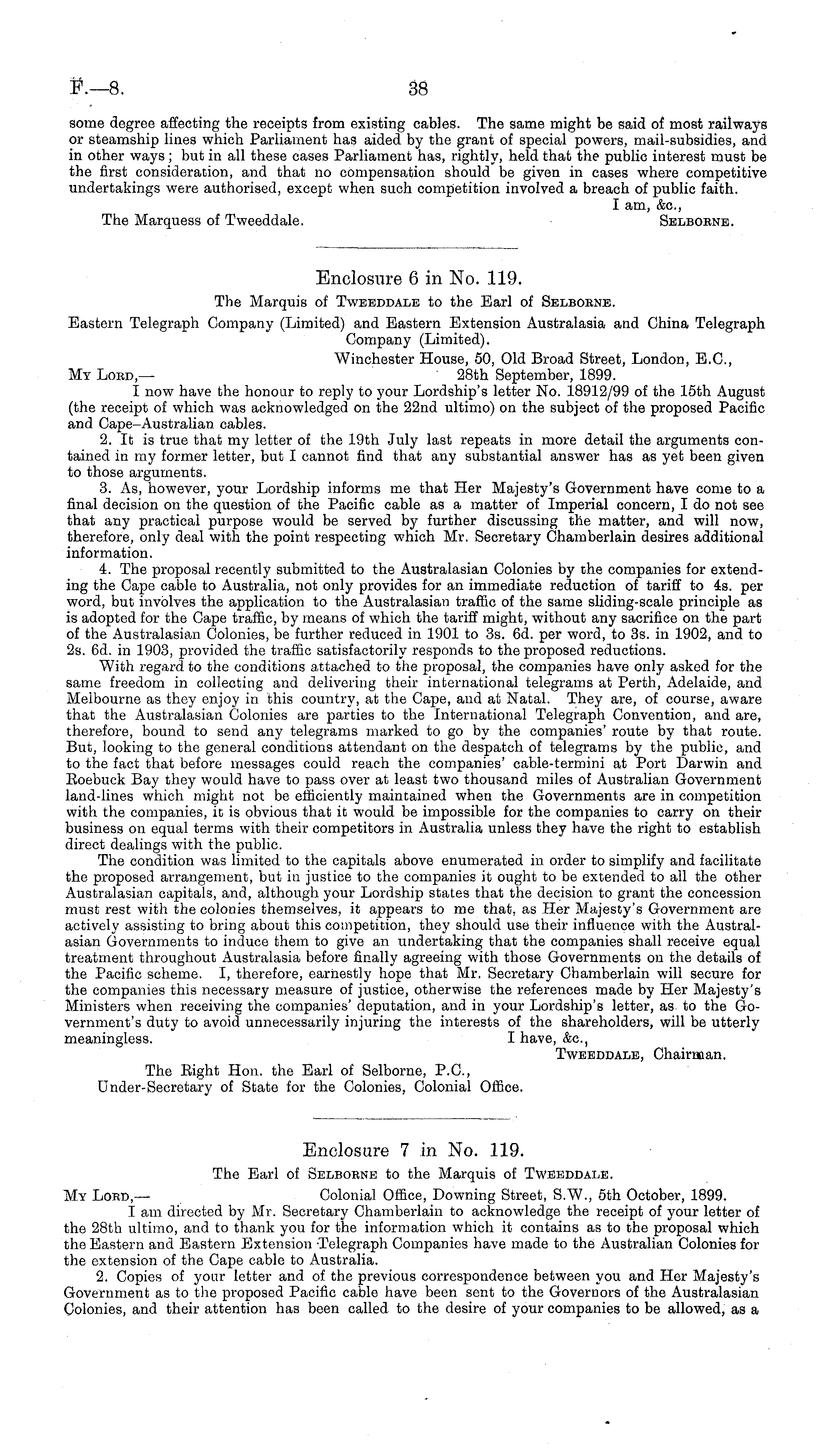 Enclosure 6 in No. 119. The Marquis of Tweeddale to the Earl of Selboene. Eastern Telegraph Company (Limited) and Eastern Extension Australasia and China Telegraph Company (Limited). Winchester House, 50, Old Broad Street, London, E.C., My Loed,— 28th September, 1899. I now have the honour to reply to your Lordship's letter No. 18912/99 of the 15th August (the receipt of which was acknowledged on the 22nd ultimo) on the subject of the proposed Pacific and Cape-Australian cables. 2. It is true that my letter of the 19th July last repeats in more detail the arguments contained in my former letter, but I cannot find that any substantial answer has as yet been given to those arguments. 3. As, however, your Lordship informs me that Her Majesty's Government have come to a final decision on the question of the Pacific cable as a matter of Imperial concern, I do not see that any practical purpose would be served by further discussing the matter, and will now, therefore, only deal with the point respecting which Mr. Secretary Chamberlain desires additional information. 4. The proposal recently submitted to the Australasian Colonies by the companies for extending the Cape cable to Australia, not only provides for an immediate reduction of tariff to 4s. per word, but involves the application to the Australasian traffic of the same sliding-scale principle as is adopted for the Cape traffic, by means of which the tariff might, without any sacrifice on the part of the Australasian Colonies, be further reduced in 1901 to 3s. 6d. per word, to 3s. in 1902, and to 2s. 6d. in 1903, provided the traffic satisfactorily responds to the proposed reductions. With regard to the conditions attached to the proposal, the companies have only asked for the same freedom in collecting and delivering their international telegrams at Perth, Adelaide, and Melbourne as they enjoy in this country, at the Cape, and at Natal. They are, of course, aware that the Australasian Colonies are parties to the International Telegraph Convention, and are, therefore, bound to send any telegrams marked to go by the companies' route by that route. But, looking to the general conditions attendant on the despatch of telegrams by the public, and to the fact that before messages could reach the companies' cable-termini at Port Darwin and Roebuck Bay they would have to pass over at least two thousand miles of Australian Government land-lines which might not be efficiently maintained when the Governments are in competition with the companies, it is obvious that it would be impossible for the companies to carry on their business on equal terms with their competitors in Australia unless they have the right to establish direct dealings with the public. The condition was limited to the capitals above enumerated in order to simplify and facilitate the proposed arrangement, but in justice to the companies it ought to be extended to all the other Australasian capitals, and, although your Lordship states that the decision to grant the concession must rest with the colonies themselves, it appears to me that, as Her Majesty's Government are actively assisting to bring about this competition, they should use their influence with the Australasian Governments to induce them to give an undertaking that the companies shall receive equal treatment throughout Australasia before finally agreeing with those Governments on the details of the Pacific scheme. I, therefore, earnestly hope that Mr. Secretary Chamberlain will secure for the companies this necessary measure of justice, otherwise the references made by Her Majesty's Ministers when receiving the companies' deputation, and in your Lordship's letter, as to the Government's duty to avoid unnecessarily injuring the interests of the shareholders, will be utterly meaningless. I have, &c, Tweeddale, Chairman. The Right Hon. the Earl of Selborne, P. 0., Under-Secretary of State for the Colonies, Colonial Office.