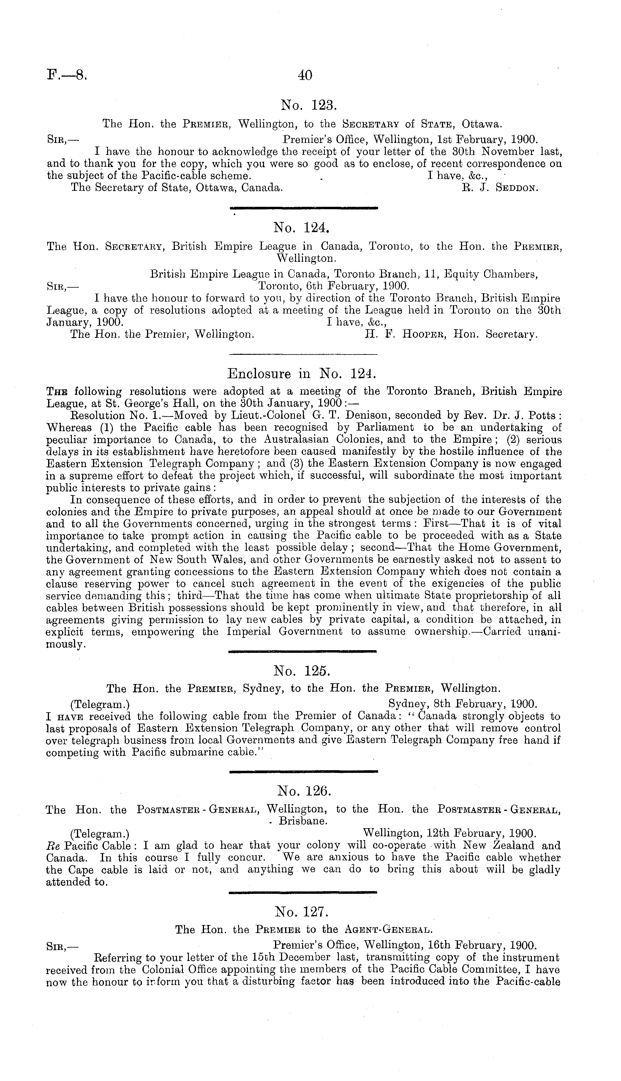No. 123. The Hon. the Premise, Wellington, to the Seceetaby of State, Ottawa. Sic, — Premier's Office, Wellington, Ist February, 1900. I have the honour to acknowledge the receipt of your letter of the 30th November last, and to thank you for the copy, which you were so good as to enclose, of recent correspondence on the subject of the Pacific-cable scheme. . I have, &c, The Secretary of State, Ottawa, Canada. R. J. Seddon.