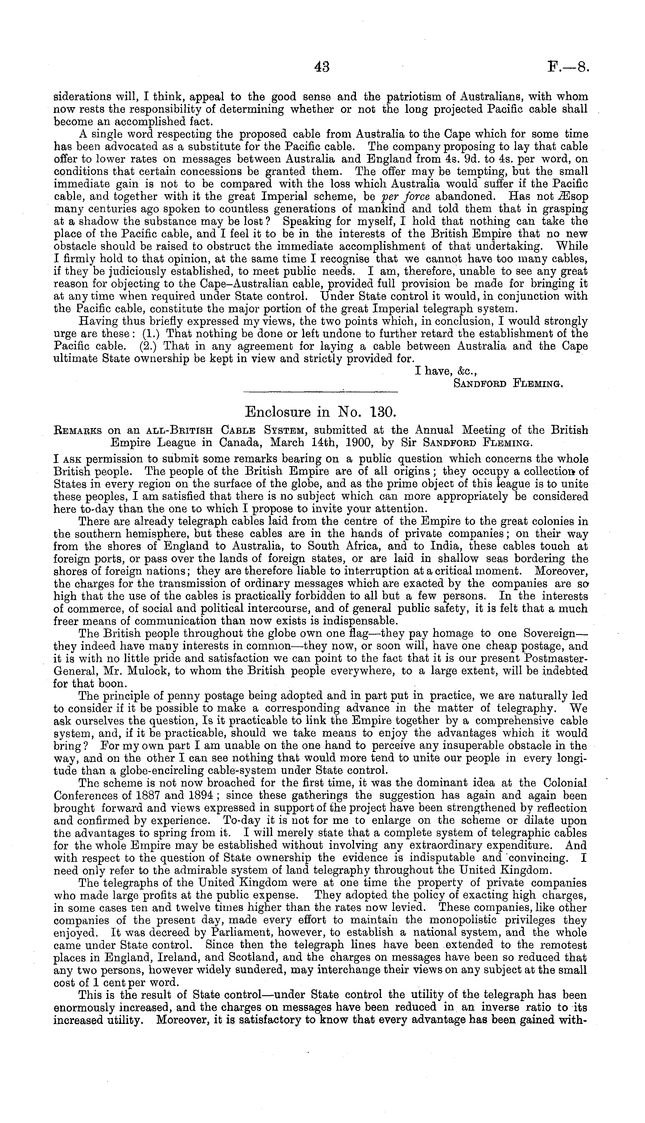 Enclosure in No. 130. Remaeks on an all-Beitish Cable System, submitted at the Annual Meeting of the British Empire League in Canada, March 14th, 1900, by Sir Sandfoed Fleming. I ask permission to submit some remarks bearing on a public question which concerns the whole British people. The people of the British Empire are of all origins ; they occupy a collection- of States in every region on the surface of the globe, and as the prime object of this league is to unite these peoples, I am satisfied that there is no subject which can more appropriately be considered here to-day than the one to which I propose to invite your attention. There are already telegraph cables laid from the centre of the Empire to the great colonies in the southern hemisphere, but these cables are in the hands of private companies; on their way from the shores of England to Australia, to South Africa, and to India, these cables touch at foreign ports, or pass over the lands of foreign states, or are laid in shallow seas bordering the shores of foreign nations; they are therefore liable to interruption at a critical moment. Moreover, the charges for the transmission of ordinary messages which are exacted by the companies are so high that the use of the cables is practically forbidden to all but a few persons. In the interests of commerce, of social and political intercourse, and of general public safety, it is felt that a much freer means of communication than now exists is indispensable. The British people throughout the globe own one flag—they pay homage to one Sovereign— they indeed have many interests in common—they now, or soon will, have one cheap postage, and it is with no little pride and satisfaction we can point to the fact that it is our present PostmasterGeneral, Mr. Mulock, to whom the British people everywhere, to a large extent, will be indebted for that boon. The principle of penny postage being adopted and in part put in practice, we are naturally led to consider if it be possible to make a corresponding advance in the matter of telegraphy. We ask ourselves the question, Is it practicable to link the Empire together by a comprehensive cable system, and, if it be practicable, should we take means to enjoy the advantages which it would bring ? For my own part lam unable on the one hand to perceive any insuperable obstacle in the way, and on the other I can see nothing that would more tend to unite our people in every longitude than a globe-encircling cable-system under State control. The scheme is not now broached for the first time, it was the dominant idea at the Colonial Conferences of 1887 and 1894; since these gatherings the suggestion has again and again been brought forward and views expressed in support of the project have been strengthened by reflection and confirmed by experience. To-day it is not for me to enlarge on the scheme or dilate upon the advantages to spring from it. I will merely state that a complete system of telegraphic cables for the whole Empire may be established without involving any extraordinary expenditure. And with respect to the question of State ownership the evidence is indisputable and convincing. I need only refer to the admirable system of land telegraphy throughout the United Kingdom. The telegraphs of the United Kingdom were at one time the property of private companies who made large profits at the public expense. They adopted the policy of exacting high charges, in some cases ten and twelve times higher than the rates now levied. These companies, like other companies of the present day, made every effort to maintain the monopolistic privileges they enjoyed. It was decreed by Parliament, however, to establish a national system, and the whole came under State control. Since then the telegraph lines have been extended to the remotest places in England, Ireland, and Scotland, and the charges on messages have been so reduced that any two persons, however widely sundered, may interchange their views on any subject at the small cost of 1 cent per word. This is the result of State control—under State control the utility of the telegraph has been enormously increased, and the charges on messages have been reduced in an inverse ratio to its increased utility. Moreover, it is satisfactory to know that every advantage has been gained with-