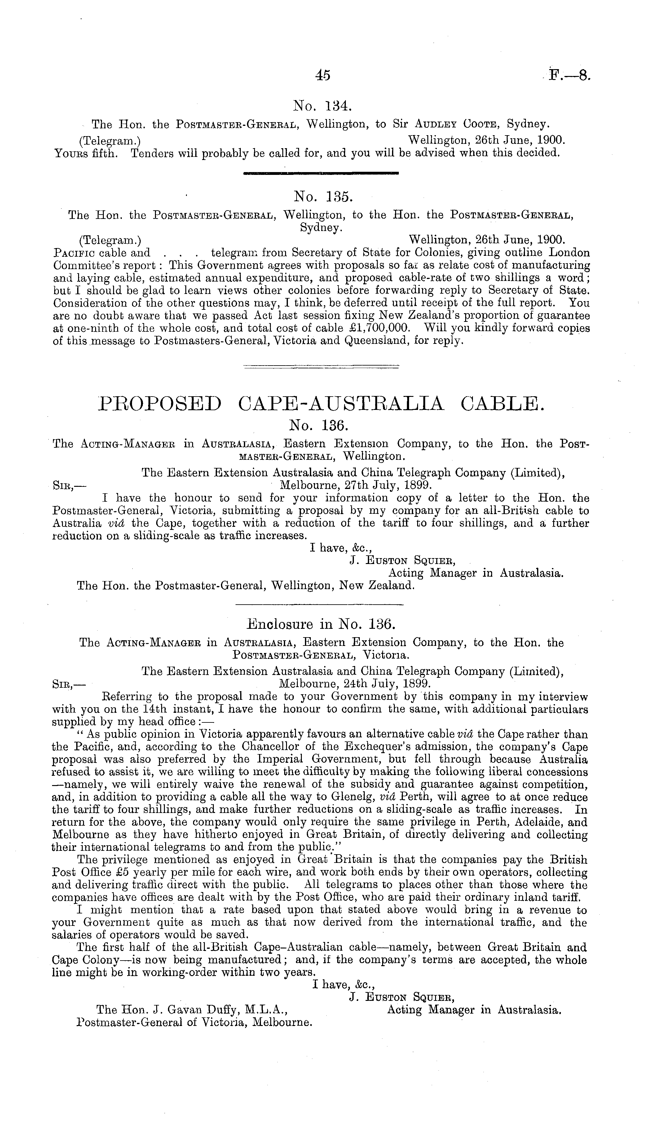 Enclosure in No. 136. The Acting-Managee in Austealasia, Eastern Extension Company, to the Hon. the Postmasteb-Geneeal, Victoria. The Eastern Extension Australasia and China Telegraph Company (Limited), Sib,— Melbourne, 24th July, 1899. Referring to the proposal made to your Government by this company in my interview with you on the 14th instant, I have the honour to confirm the same, with additional particulars supplied by my head office : — " As public opinion in Victoria apparently favours an alternative cable via the Cape rather than the Pacific, and, according to the Chancellor of the Exchequer's admission, the company's Cape proposal was also preferred by the Imperial Government, but fell through because Australia refused to assist it, we are willing to meet the difficulty by making the following liberal concessions —namely, we will entirely waive the renewal of the subsidy and guarantee against competition, and, in addition to providing a cable all the way to Glenelg, via Perth, will agree to at once reduce the tariff to four shillings, and make further reductions on a sliding-scale as traffic increases. In return for the above, the company would only require the same privilege in Perth, Adelaide, and Melbourne as they have hitherto enjoyed in Great Britain, of directly delivering and collecting their international telegrams to and from the public." The privilege mentioned as enjoyed in Great Britain is that the companies pay the British Post Office £5 yearly per mile for each wire, and work both ends by their own operators, collecting and delivering traffic direct with the public. All telegrams to places other than those where the companies have offices are dealt with by the Post Office, who are paid their ordinary inland tariff. I might mention that a rate based upon that stated above would bring in a revenue to your Government quite as much as that now derived from the international traffic, and the salaries of operators would be saved. The first half of the all-British Cape-Australian cable —namely, between Great Britain and Cape Colony—is now being manufactured; and, if the company's terms are accepted, the whole line might be in working-order within two years. I have, &c, J. Euston Squiee, The Hon. J. Gavan Duffy, M.L.A., Acting Manager in Australasia, Postmaster-General of Victoria, Melbourne.