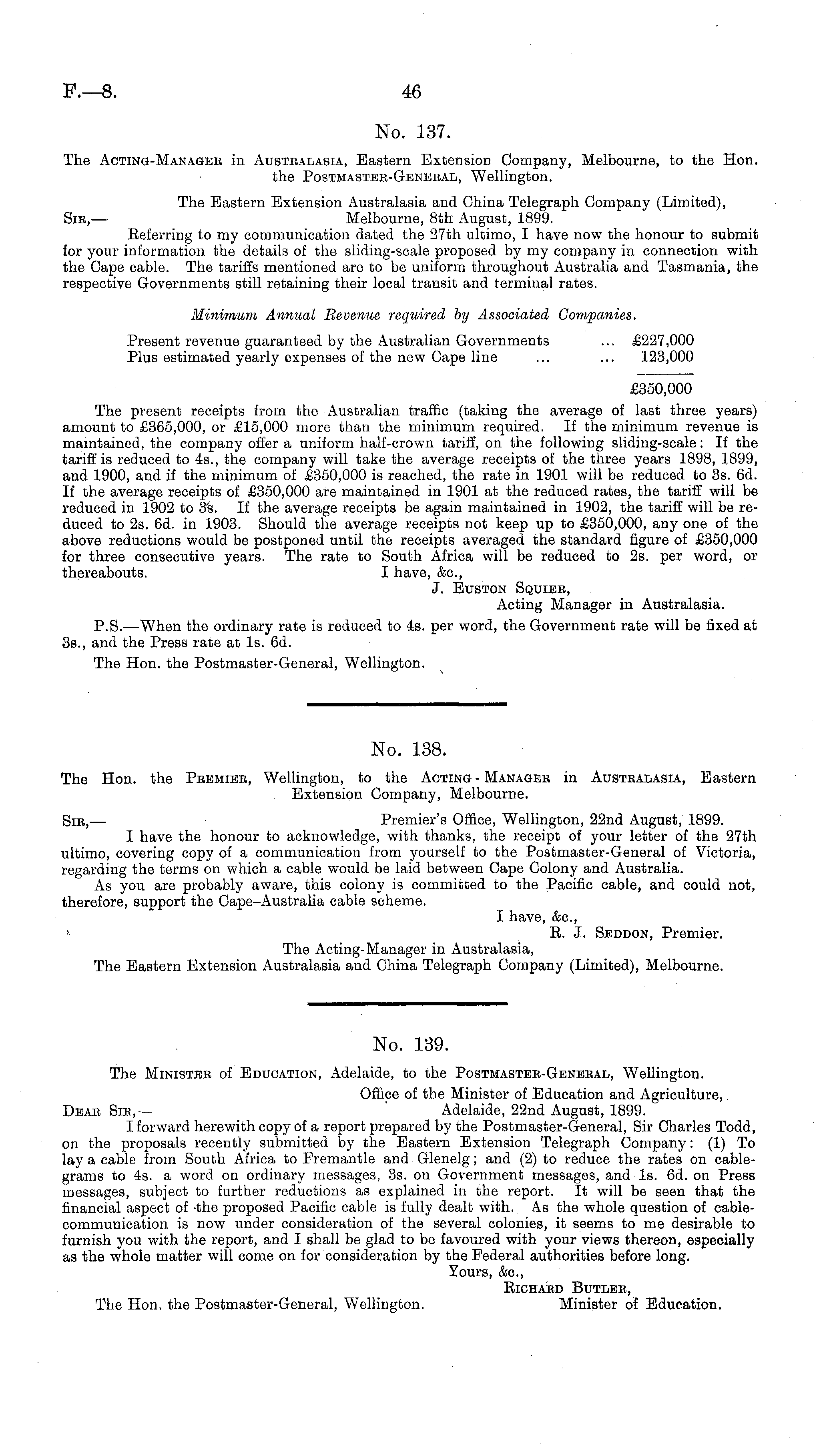No. 139. The Ministeb of Education, Adelaide, to the Postmasteb-Geneeal, Wellington. Office of the Minister of Education and Agriculture, Deab Sib,— Adelaide, 22nd August, 1899. I forward herewith copy of a report prepared by the Postmaster-General, Sir Charles Todd, on the proposals recently submitted by the Eastern Extension Telegraph Company: (1) To lay a cable from South Africa to Fremantle and Glenelg; and (2) to reduce the rates on cablegrams to 4s. a word on ordinary messages, 3s. on Government messages, and Is. 6d. on Press messages, subject to further reductions as explained in the report. It will be seen that the financial aspect of -the proposed Pacific cable is fully dealt with. As the whole question of cablecommunication is now under consideration of the several colonies, it seems to me desirable to furnish you with the report, and I shall be glad to be favoured with your views thereon, especially as the whole matter will come on for consideration by the Federal authorities before long. Yours, &c, Richabd Butlee, The Hon. the Postmaster-General, Wellington. Minister of Education.