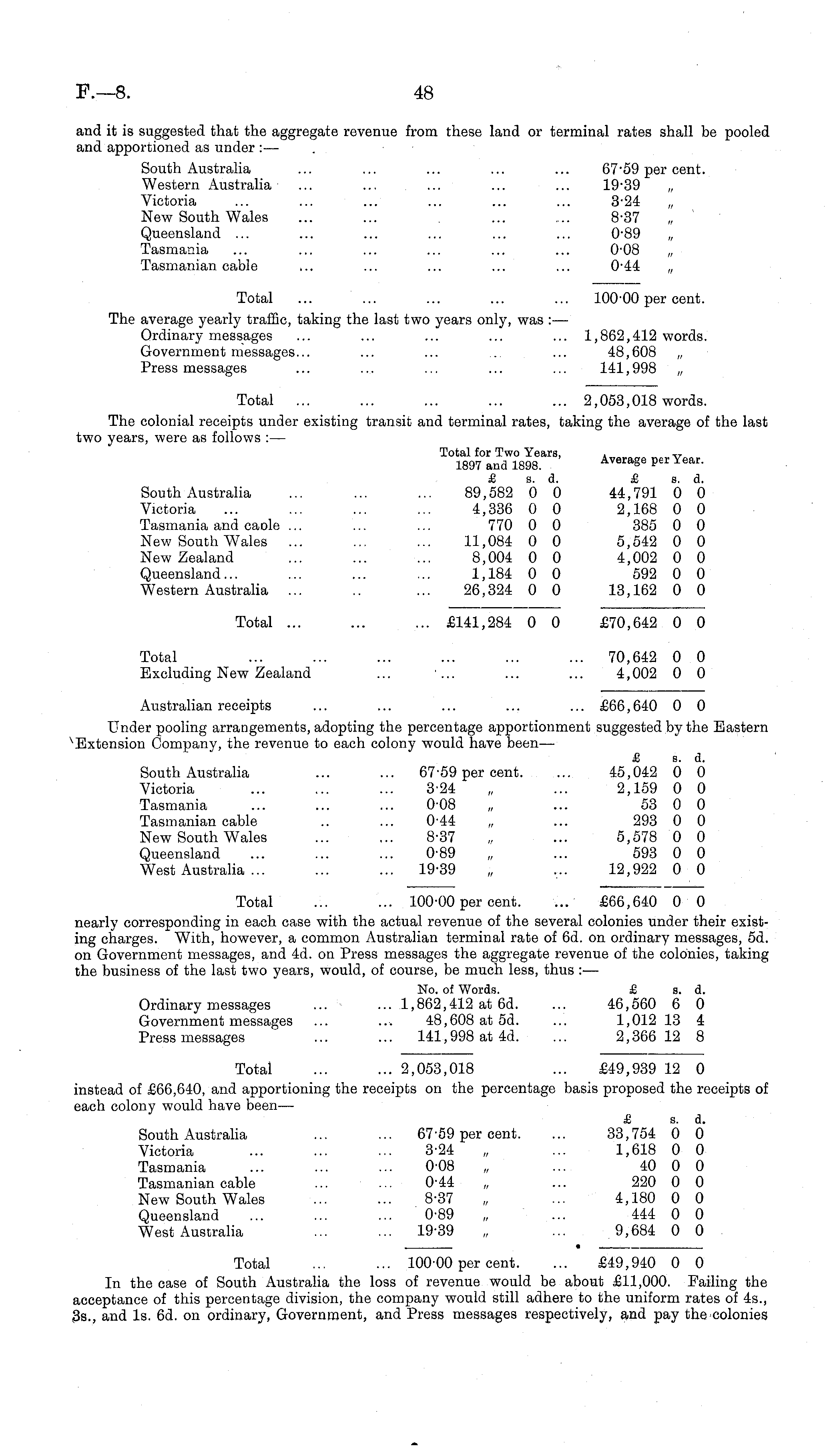 and it is suggested that the aggregate revenue from these land or terminal rates shall be pooled and apportioned as under : — South Australia ... ... ... ... ... 67-59 per cent. Western Australia ... ... ... 19-39 „ Victoria ... ... ... ... ... ... 3-24 New South Wales ... ... ... .... 8-37 Queensland ... ... ... ... ... ... 0-89 „ Tasmania ... ... ... ... ... ... 0-08 „ Tasmanian cable ... ... ... ... ... 0-44 „ Total ... ... ... ... ... 100-00 per cent. The average yearly traffic, taking the last two years only, was : — Ordinary messages ... ... ... ... ... 1,862,412 words. Government messages... ... ... ... ... 48,608 „ Press messages ... ... ... ... ... 141,998 „ Total ... ... ... ... ... 2,053,018 words. The colonial receipts under existing transit and terminal rates, taking the average of the last two years, were as follows :— Total for Two Years, , ~ 1897 and 1898. Average per Year. £ s. d. £ s. d. South Australia ... ... ... 89,582 0 0 44,791 0 0 Victoria ... ... ... ... 4,336 0 0 2,168 0 0 Tasmania and cade ... ... ... 770 0 0 385 0 0 New South Wales ... ... ... 11,084 0 0 5,542 0 0 New Zealand ... ... ... 8,004 0 0 4,002 0 0 Queensland... ... ... ... 1,184 0 0 592 0 0 Western Australia ... .. ... 26,324 0 0 13,162 0 0 Total ... ... ... £141,284 0 0 £70,642 0 0 Total ... ... ... ... ... ... 70,642 0 0 Excluding New Zealand ... ... ... ... 4,002 0 0 Australian receipts ... ... ... ... ... £66,640 0 0 Under pooling arrangements, adopting the percentage apportionment suggested by the Eastern Extension Company, the revenue to each colony would have been— £ s. d. South Australia ... ... 67-59 per cent. ... 45,042 0 0 Victoria ... ... ... 3-24 „ ... 2,159 0 0 Tasmania ... ... ... 0-08 „ ... 53 0 0 Tasmanian cable .. ... 0-44 „ ... 293 0 0 New South Wales ... ... 8-37 „ ... 5,578 0 0 Queensland ... ... ... 0-89 „ ... 593 0 0 West Australia ... ... ... 19-39 „ ... 12,922 0 0 Total ... ... 100-00 per cent. ... £66,640 0 0 nearly corresponding in each case with the actual revenue of the several colonies under their existing charges. With, however, a common Australian terminal rate of 6d. on ordinary messages, sd. on Government messages, and 4d. on Press messages the aggregate revenue of the colonies, taking the business of the last two years, would, of course, be much less, thus : — No. of Words. £ s. d. Ordinary messages ... - ... 1,862,412 at 6d. ... 46,560 6 0 Government messages ... ... 48,608 at sd. ... 1,012 13 4 Press messages ... ... 141,998 at 4d. ... 2,366 12 8 Total ... ... 2,053,018 ... £49,939 12 0 instead of £66,640, and apportioning the receipts on the percentage basis proposed the receipts of each colony would have been— £ s. d. South Australia ... ... 67-59 per cent. ... 33,754 0 0 Victoria ... ... ... 3-24 „ ... 1,618 0 0 Tasmania 0-08 „ ..'.. 40 0 0 Tasmanian cable ... ... 0-44 „ ... 220 0 0 New South Wales ... ... 8-37 „ ... 4,180 0 0 Queensland ... ... ... 0-89 „ ... 444 0 0 West Australia ... ... 19-39 „ ... 9,684 0 0 , • Total ... ... 100-00 per cent. ... £49,940 0 0 In the case of South Australia the loss of revenue would be about £11,000. Failing the acceptance of this percentage division, the company would still adhere to the uniform rates of 45., 35., and Is. 6d. on ordinary, Government, and Press messages respectively, and pay the colonies