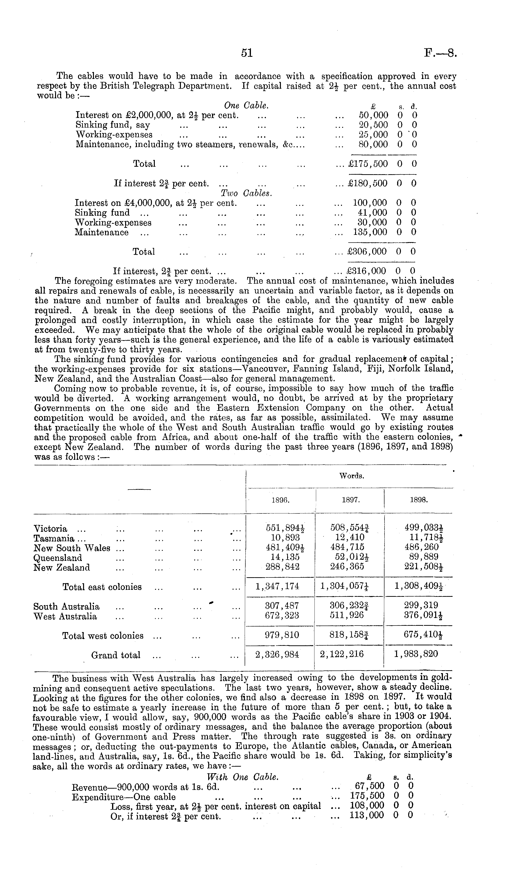 The cables would have to be made in accordance with a specification approved in every respect by the British Telegraph Department. If capital raised at 24 per cent., the annual cost would be:— One Cable. £ s. d. Interest on £2,000,000, at 24 per cent. ... ... ... 50,000 0 0 Sinking fund, say ... ... ... ... ... 20,500 0 0 Working-expenses ... ... ... ... ... 25,000 o'o Maintenance, including two steamers, renewals, &c... ... 80,000 0 0 Total ... ... ... ... ...£175,500 0 0 If interest 2f per cent. ... ... ... ...£180,500 0 0 Two Cables. Interest on £4,000,000, at 24 per cent. ... ... ... 100,000 0 0 Sinking fund ... ... ... ... ... ... 41,000 0 0 Working-expenses ... ... ... ... ... 30,000 0 0 Maintenance ... ... ... ... ... ... 135,000 0 0 , Total ... ... ... ... ... £306,000 0 0 If interest, 2f percent. ... ... ... ...£316,000 0 0 The foregoing estimates are very moderate. The annual cost of maintenance, which includes all repairs and renewals of cable, is necessarily an uncertain and variable factor, as it depends on the nature and number of faults and breakages of the cable, and the quantity of new cable required. A break in the deep sections of the Pacific might, and probably would, cause a prolonged and costly interruption, in which case the estimate for the year might be largely exceeded. We may anticipate that the whole of the original cable would be replaced in probably less than forty years—such is the general experience, and the life of a cable is variously estimated at from twenty-five to thirty years. The sinking fund provides for various contingencies and for gradual replacement! of capital; the working-expenses provide for six stations —Vancouver, Fanning Island, Fiji, Norfolk Island, New Zealand, and the Australian Coast—also for general management. Coming now to probable revenue, it is, of course, impossible to say how much of the traffic would be diverted. A working arrangement would, no doubt, be arrived at by the proprietary Governments on the one side and the Eastern Extension Company on the other. Actual competition would be avoided, and the rates, as far as possible, assimilated. We may assume that practically the whole of the West and South Australian traffic would go by existing routes and the proposed cable from Africa, and about one-half of the traffic with the eastern colonies, except New Zealand. The number of words during the past three years (1896, 1897, and 1898) was as follows :—