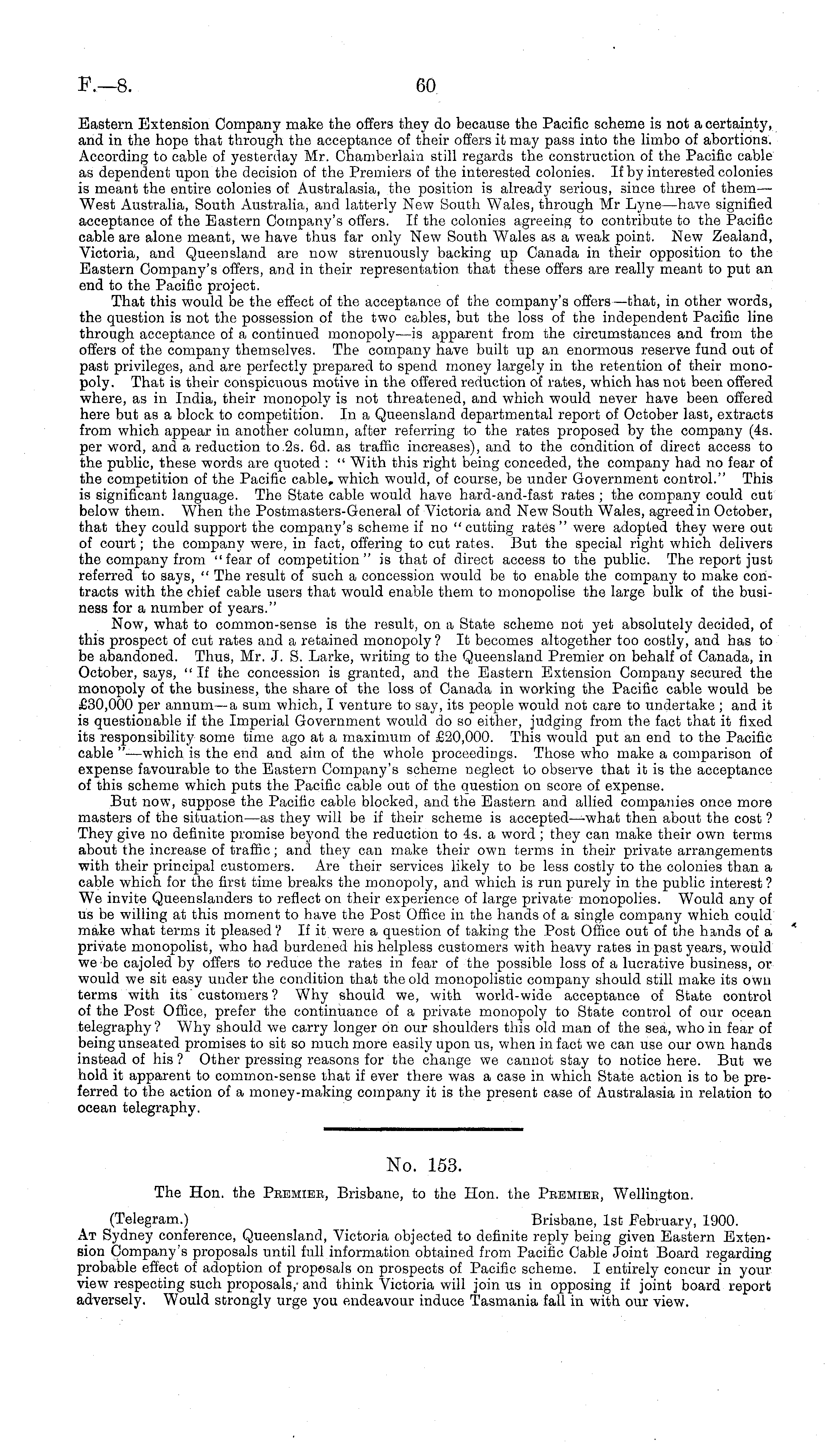 No. 153. The Hon. the Peemiee, Brisbane, to the Hon. the Peemiee, Wellington. (Telegram.) Brisbane, Ist February, 1900. At Sydney conference, Queensland, Victoria objected to definite reply being given Eastern Extension Company's proposals until full information obtained from Pacific Cable Joint Board regarding probable effect of adoption of proposals on prospects of Pacific scheme. I entirely concur in your view respecting such proposals, and think Victoria will join us in opposing if joint board report adversely. Would strongly urge you endeavour induce Tasmania fall in with our view.