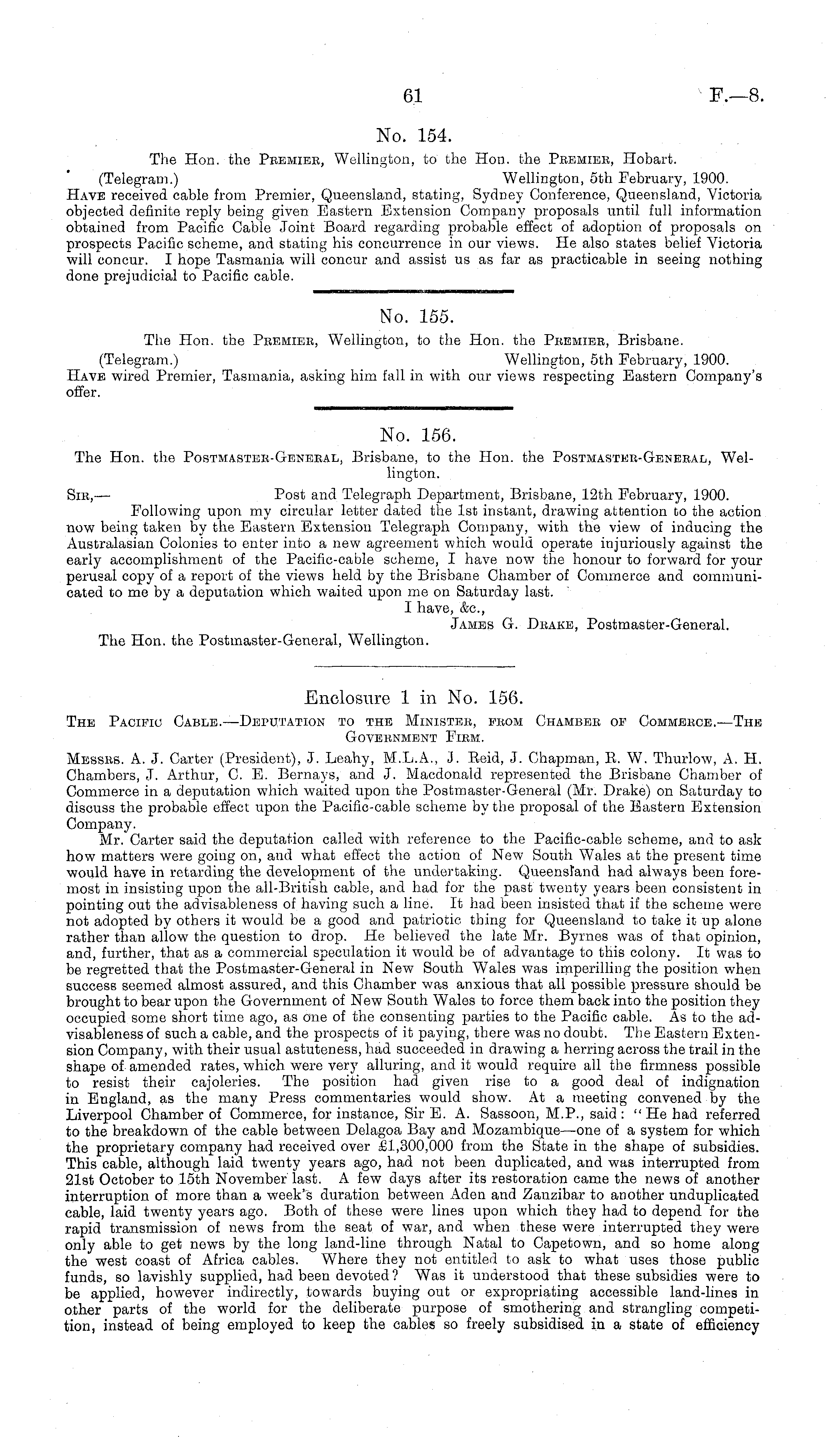 Enclosure 1 in No. 156. The Pacific Cable. —Deputation to the Minister, fbom Chambee of Commebce.—The GOVEBNMENT FIBM. Messes. A. J. Garter (President), J. Leahy, M.L.A., J. Reid, J. Chapman, R. W. Thurlow, A. H. Chambers, J. Arthur, C. E. Bernays, and J. Macdonald represented the Brisbane Chamber of Commerce in a deputation which waited upon the Postmaster-General (Mr. Drake) on Saturday to discuss the probable effect upon the Pacific-cable scheme by the proposal of the Eastern Extension Company. Mr. Carter said the deputation called with reference to the Pacific-cable scheme, and to ask how matters were going on, and what effect the action of New South Wales at the present time would have in retarding the development of the undertaking. Queensland had always been foremost in insisting upon the all-British cable, and had for the past twenty years been consistent in pointing out the advisableness of having such a line. It had been insisted that if the scheme were not adopted by others it would be a good and patriotic thing for Queensland to take it up alone rather than allow the question to drop. He believed the late Mr. Byrnes was of that opinion, and, further, that as a commercial speculation it would be of advantage to this colony. It was to be regretted that the Postmaster-General in New South Wales was imperilling the position when success seemed almost assured, and this Chamber was anxious that all possible pressure should be brought to bear upon the Government of New South Wales to force them back into the position they occupied some short time ago, as one of the consenting parties to the Pacific cable. As to the advisableness of such a cable, and the prospects of it paying, there was no doubt. The Eastern Extension Company, with their usual astuteness, had succeeded in drawing a herring across the trail in the shape of amended rates, which were very alluring, and it would require all the firmness possible to resist their cajoleries. The position had given rise to a good deal of indignation in England, as the many Press commentaries would show. At a meeting convened by the Liverpool Chamber of Commerce, for instance, Sir E. A. Sassoon, M.P., said : "He had referred to the breakdown of the cable between Delagoa Bay and Mozambique—one of a system for which the proprietary company had received over £1,300,000 from the State in the shape of subsidies. This cable, although laid twenty years ago, had not been duplicated, and was interrupted from 21st October to 15th November last. A few days after its restoration came the news of another interruption of more than a week's duration between Aden and Zanzibar to another unduplicated cable, laid twenty years ago. Both of these were lines upon which they had to depend for the rapid transmission of news from the seat of war, and when these were interrupted they were only able to get news by the long land-line through Natal to Capetown, and so home along the west coast of Africa cables. Where they not entitled to ask to what uses those public funds, so lavishly supplied, had been devoted ? Was it understood that these subsidies were to be applied, however indirectly, towards buying out or expropriating accessible land-lines in other parts of the world for the deliberate purpose of smothering and strangling competition, instead of being employed to keep the cables so freely subsidised in a state of efficiency