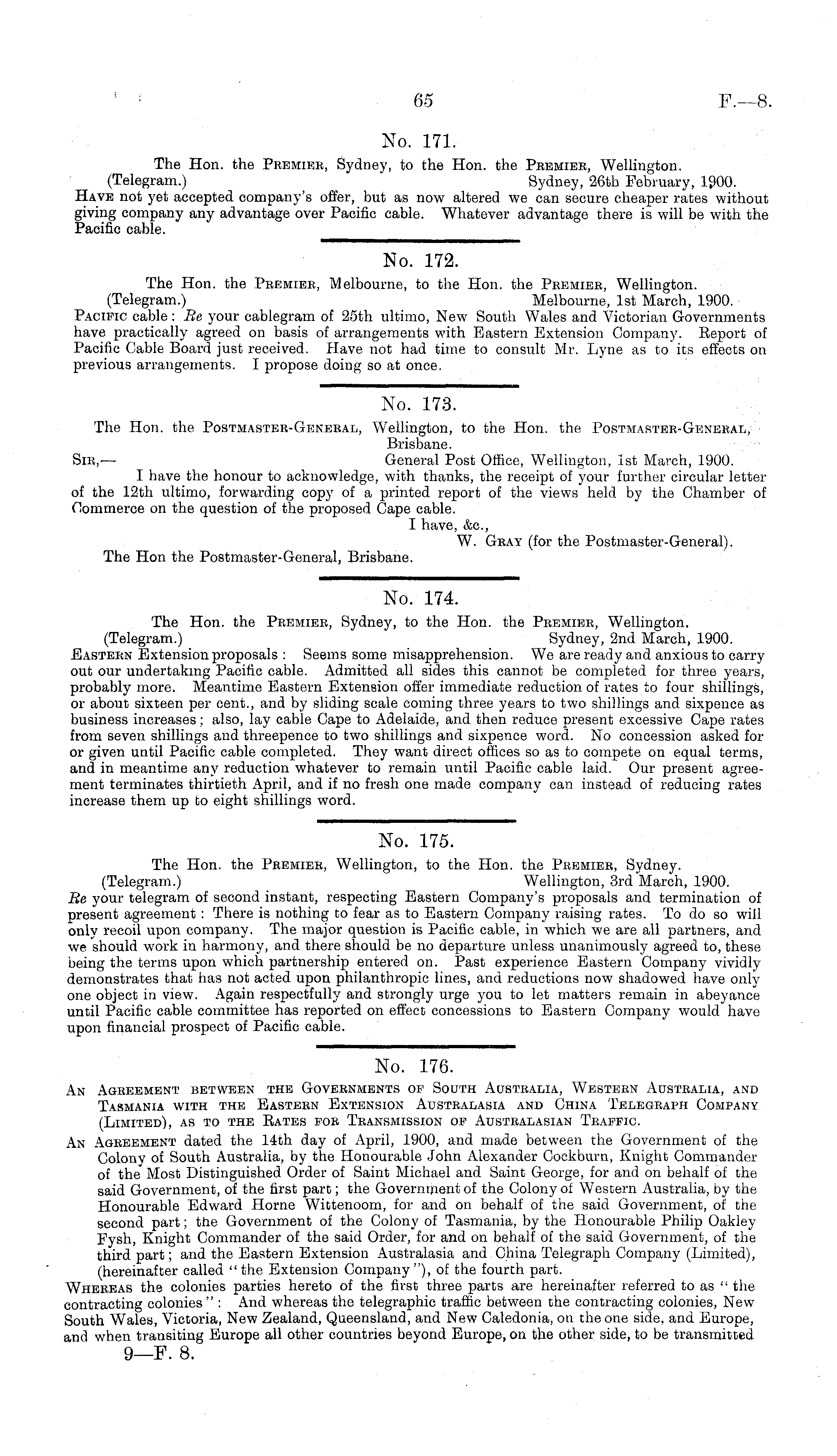 No. 174. The Hon. the Pbemieb, Sydney, to the Hon. the Peemieb, Wellington. (Telegram.) Sydney, 2nd March, 1900. Eastern Extension proposals : Seems some misapprehension. We are ready and anxious to carry out our undertaking Pacific cable. Admitted all sides this cannot be completed for three years, probably more. Meantime Eastern Extension offer immediate reduction of rates to four shillings, or about sixteen per cent., and by sliding scale coming three years to two shillings and sixpence as business increases; also, lay cable Cape to Adelaide, and then reduce present excessive Cape rates from seven shillings and threepence to two shillings and sixpence word. No concession asked for or given until Pacific cable completed. They want direct offices so as to compete on equal terms, and in meantime any reduction whatever to remain until Pacific cable laid. Our present agreement terminates thirtieth April, and if no fresh one made company can instead of reducing rates increase them up to eight shillings word.