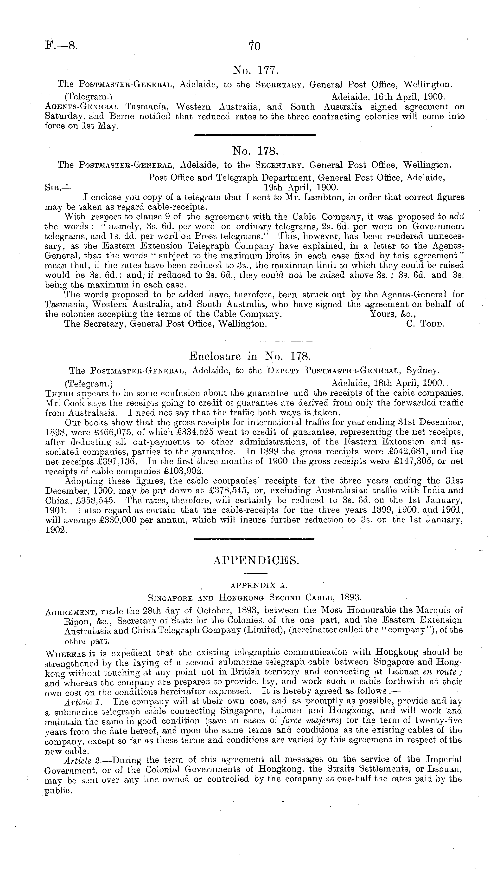 No. 178. The Postmaster-General, Adelaide, to the Secretary, General Post Office, Wellington. Post Office and Telegraph Department, General Post Office, Adelaide, Sic,— 19th April, 1900. I enclose you copy of a telegram that I sent to Mr. Lambton, in order that correct figures may be taken as regard cable-receipts. With respect to clause 9 of the agreement with the Gable Company, it was proposed to add the words : " namely, 3s. 6d. per word on ordinary telegrams, 2s. 6d. per word on Government telegrams, and Is. 4d. per word on Press telegrams." This, however, has been rendered unnecessary, as the Eastern Extension Telegraph Company have explained, in a letter to the AgentsGeneral, that the words " subject to the maximum limits in each case fixed by this agreement" mean that, if the rates have been reduced to 35., the maximum limit to which they could be raised would be 3s. 6d.; and, if reduced to 2s. 6d., they could not be raised above 3s. ; 3s. 6d. and 3s. being the maximum in each case. The words proposed to be added have, therefore, been struck out by the Agents-General for Tasmania, Western Australia, and South Australia, who have signed the agreement on behalf of the colonies accepting the terms of the Cable Company. Yours, &c, The Secretary, General Post Office, Wellington. C. Todd.