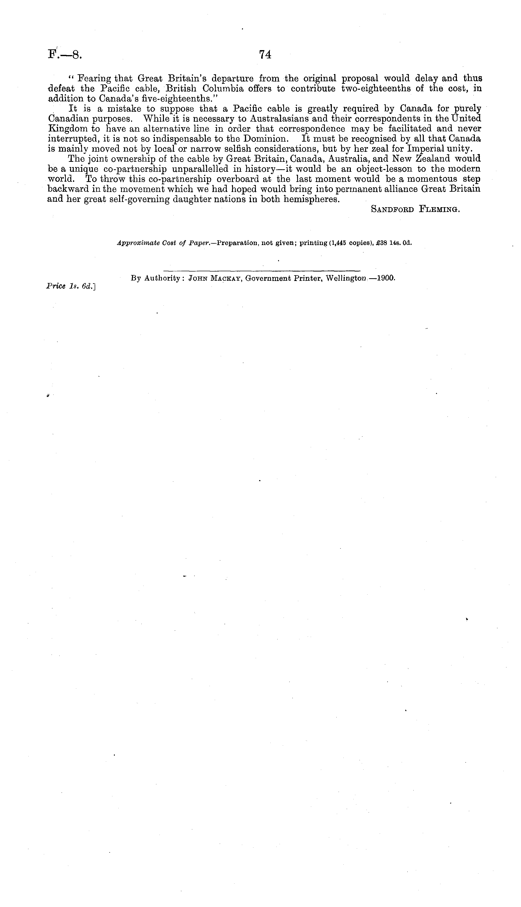 " Fearing that Great Britain's departure from the original proposal would delay and thus defeat the Pacific cable, British Columbia offers to contribute two-eighteenths of the cost, in addition to Canada's five-eighteenths." It is a mistake to suppose that a Pacific cable is greatly required by Canada for purely Canadian purposes. While it is necessary to Australasians and their correspondents in the United Kingdom to have an alternative line in order that correspondence may be facilitated and never interrupted, it is not so indispensable to the Dominion. It must be recognised by all that Canada is mainly moved not by local or narrow selfish considerations, but by her zeal for Imperial unity. The joint ownership of the cable by Great Britain, Canada, Australia, and New Zealand would be a unique co-partnership unparallelled in history—it would be an object-lesson to the modern world. To throw this co-partnership overboard at the last moment would be a momentous step backward in the movement which we had hoped would bring into permanent alliance Great Britain and her great self-governing daughter nations in both hemispheres. Sandford Fleming. Approximate Cost of Paper.—Preparation, not given; printing (1,445 copies), £38 14s. Od.