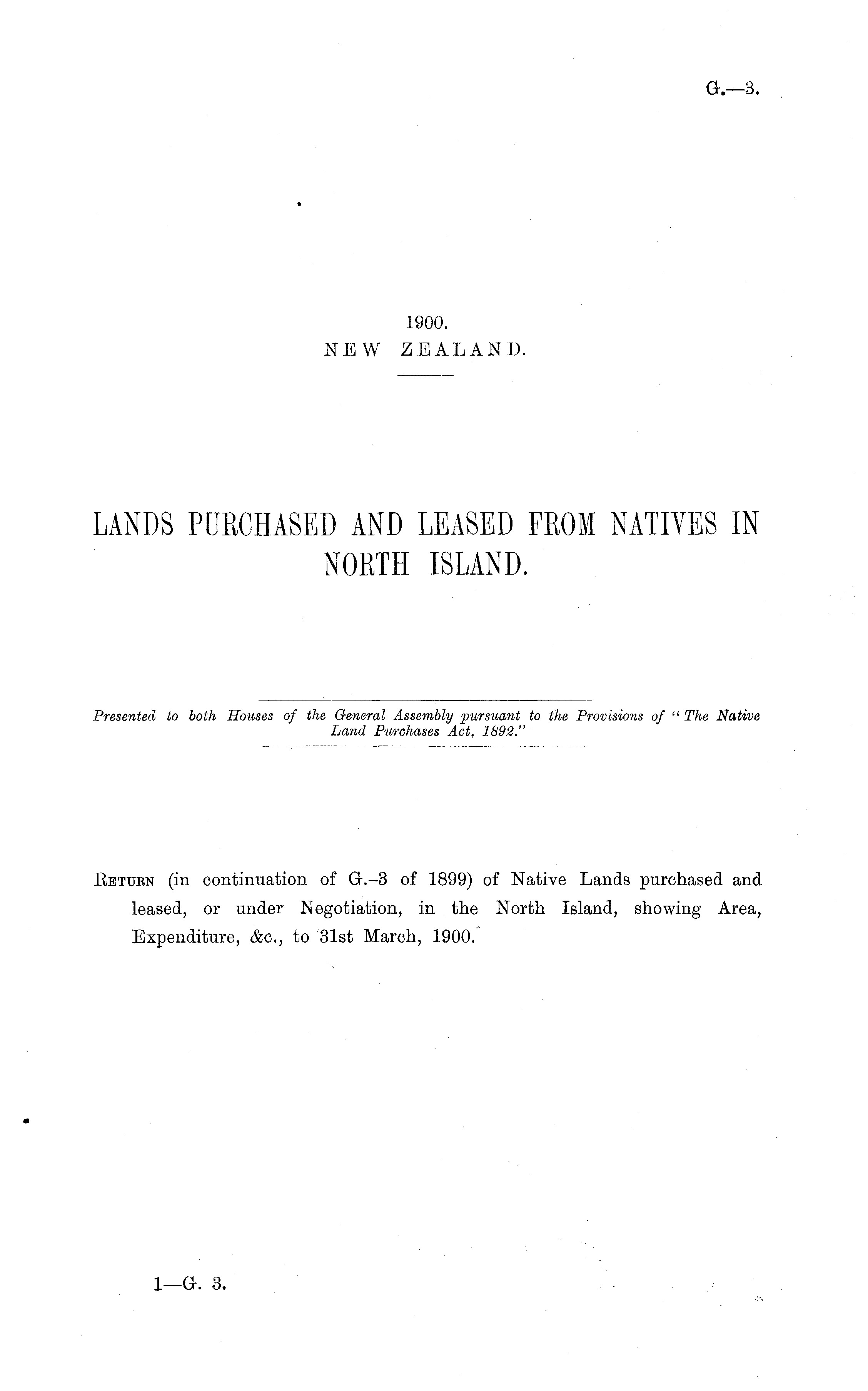 Eetuen (in continuation of G-.-3 of 1899) of Native Lands purchased and leased, or under Negotiation, in the North Island, showing Area, Expenditure, &c, to 31st March, 1900.