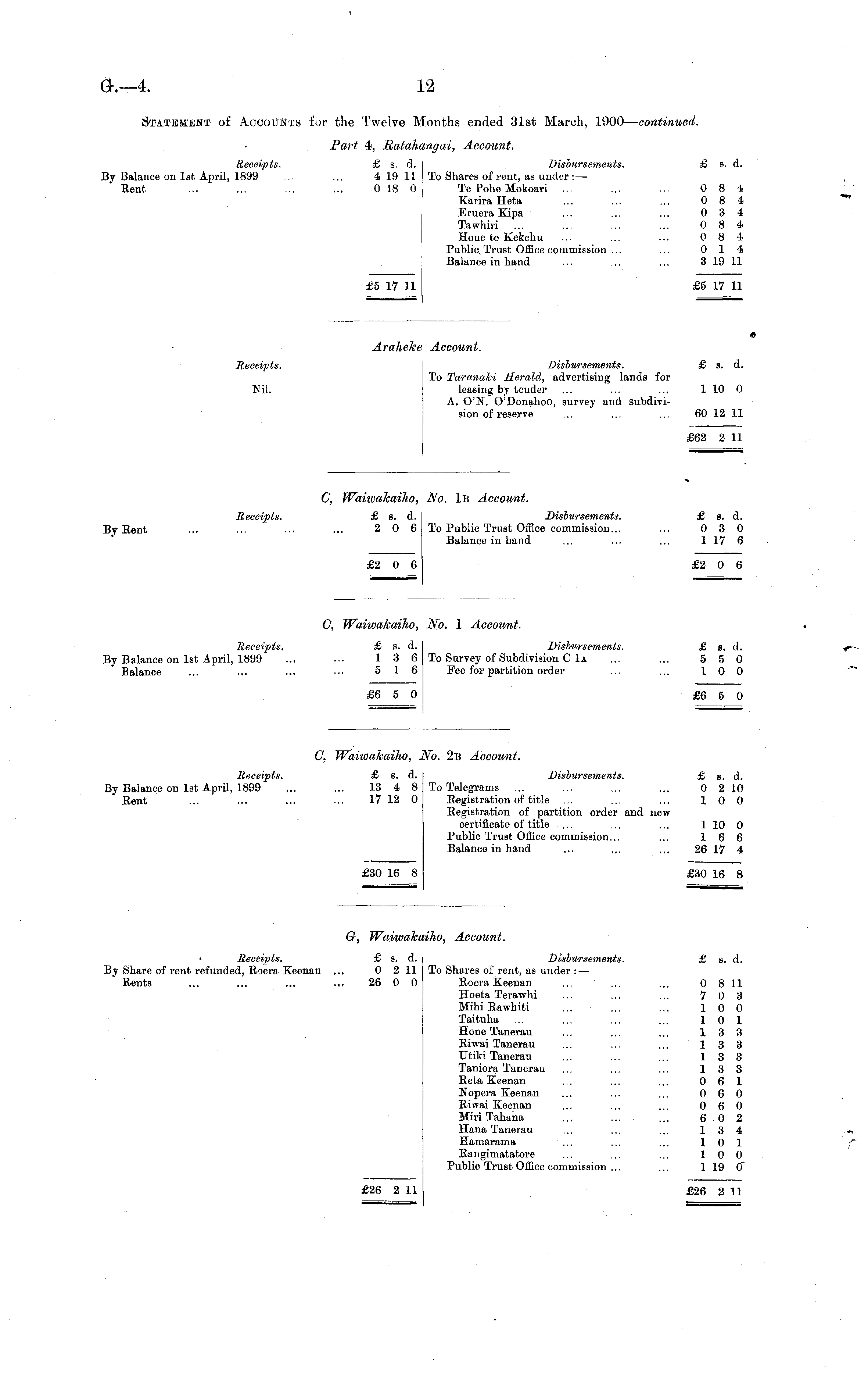 Statement of Accounts for the Twelve Months ended 31st March, 1900 — continued. Part 4, Batahangai, Account. Receipts. £ s. d. Disbursements. £ s. d. By Balance on Ist April, 1899 ... ... 4 19 11 To Shares of rent, as under : — Rent ... ... ... ... 0 18 0 Te Pohe Mokoari ... ... ... 0 8 4 Karira Heta ... ... ... 0 8 4 Eruera Kipa ... ... ... 034 Tawhiri ... ... ... ... 0 8 4 Hone te Kekehu ... ... ... 0 8 4 Public Trust Office commission ... ... 0 14 Balance in hand ... ... ... 3 19 11 £5 17 11 £5 17 11