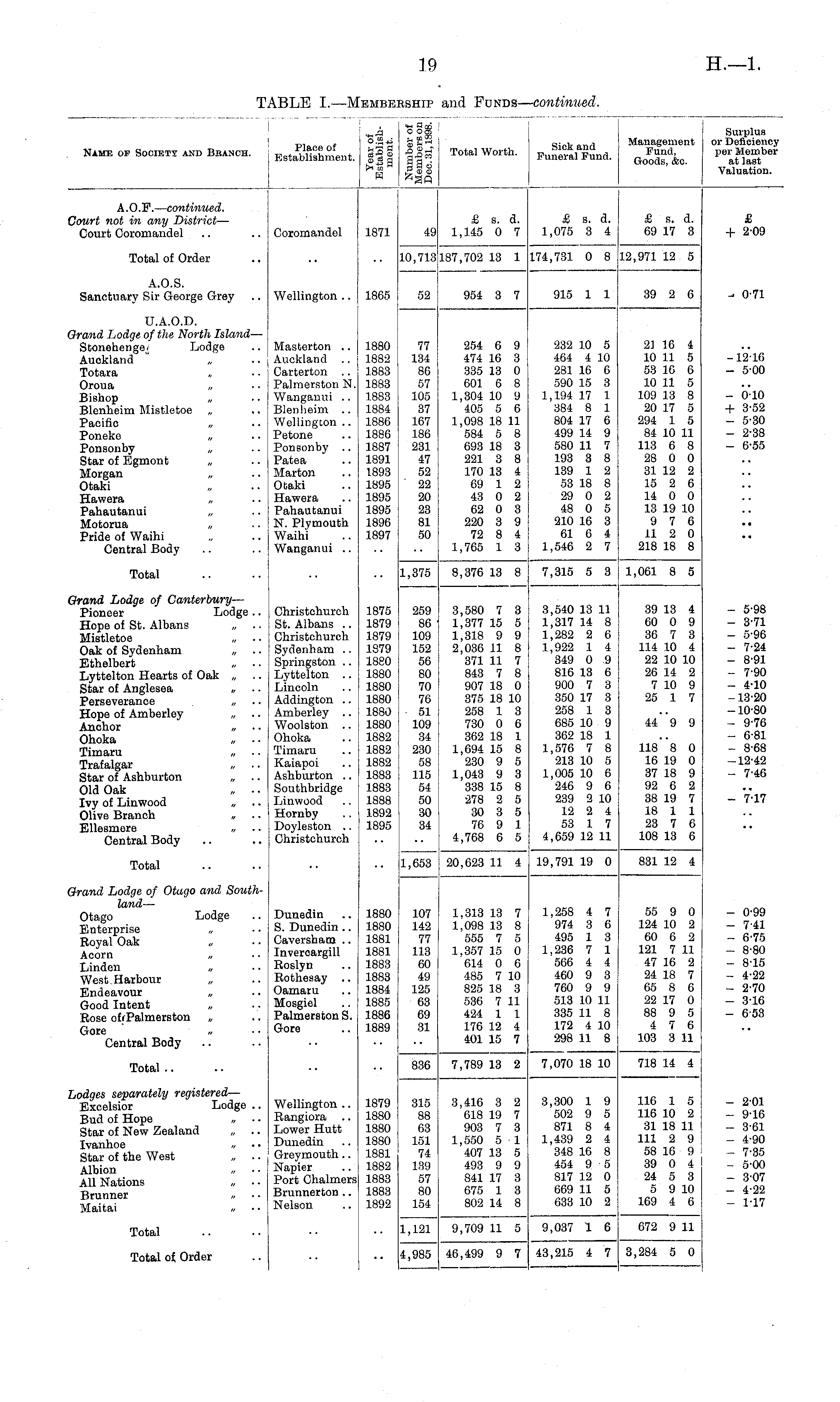 Name of Society and Branch. ». Boo ' -H OOO -ft. h Olg gl | ||«f I Total Worth. Fu^|und . Management Fund, Goods, &c. Surplus or Deficiency per Member at last Valuation. A.O.F. — continued, tourt not in any District — Court Coromandel Coromandel £ s. d. 1,145 0 7 £ s. d. 1,075 3 4 174,731 0 8 £ s. d. 69 17 3 £ + 2-09 1871 49 Total of Order 10,713 187,702 13 1 12,971 12 5 A.O.S. Sanctuary Sir George Grey Wellington .. 1865 52 954 3 7 915 1 1 39 2 6 - 0-71 U.A.O.D. hand Lodge of the North Island — Stonehenge,. Lodge Auckland „ Totara Oroua Bishop Blenheim Mistletoe Pacific Poneke Ponsonby Star of Egmont Morgan Otaki Hawera Pahautanui Motorua Pride of Waihi Central Body Masterton .. Auckland .. j Carterton .. Palmerston N. Wanganui .. Blenheim .. Wellington .. Petone Ponsonby .. Patea Marton Otaki Hawera Pahautanui N. Plymouth Waihi Wanganui .. 1880 1882 1883 1883 1883 1884 1886 1886 1887 1891 1893 1895 1895 1895 1896 1897 77 134 86 57 105 37 167 186 231 47 52 22 20 23 81 50 254 6 9 474 16 3 335 13 0 601 6 8 1,304 10 9 405 5 6 1,098 18 11 584 5 8 693 18 3 221 3 8 170 13 4 69 1 2 43 0 2 62 0 3 220 3 9 72 8 4 1,765 1 3 232 10 5 464 4 10 281 16 6 590 15 3 1,194 17 1 384 8 1 804 17 6 499 14 9 580 11 7 193 3 8 139 1 2 53 18 8 29 0 2 48 0 5 210 16 3 61 6 4 1,546 2 7 21 16 4 10 11 5 53 16 6 10 11 5 109 13 8 20 17 5 294 1 5 84 10 11 113 6 8 28 0 0 31 12 2 15 2 6 14 0 0 13 19 10 9 7 6 11 2 0 218 18 8 -1216 - 5-00 - 0-10 + 3-52 - 5-30 - 2-38 - 6-55 Total 1,375 8,376 13 8 7,315 5 3 1,061 8 5 - 5-98 - 3-71 - 5-96 - 7-24 - 8-91 - 7-90 - 4-10 -13-20 -10-80 - 9-76 - 6-81 - 8-68 -12-42 - 7-46 hand Lodge of Canterbury — Pioneer Lodge .. Hope of St. Albans Mistletoe Oak of Sydenham Ethelbert „ ■ • Lyttelton Hearts of Oak „ Star of Anglesea „ Perseverance „ Hope of Amberley Anchor „ Ohoka „ Timaru „ Trafalgar „ .. Star of Ashburton Old Oak „ .. Ivy of Linwood „ Olive Branch Ellesmere Central Body Christchurch St. Albans .. Christchurch Sydenham .. Springston .. Lyttelton .. Lincoln Addington .. Amberley .. Woolston .. Ohoka Timaru Kaiapoi Ashburton .. Southbridge Linwood Hornby Doyleston .. Christchurch 1875 1879 1879 1879 1880 1880 1880 1880 1880 1880 1882 1882 1882 1883 1883 1888 1892 1895 259 86 109 152 56 80 70 76 51 109 34 230 58 115 54 50 30 34 3,580 7 3 1,377 15 5 1,318 9 9 2,036 11 8 371 11 7 843 7 8 907 18 0 375 18 10 258 1 3 730 0 6 362 18 1 1,694 15 8 230 9 5 1,043 9 3 338 15 8 278 2 5 30 3 5 76 9 1 4,768 6 5 3,540 13 11 1,317 14 8 1,282 2 6 1,922 1 4 349 0 9 816 13 6 900 7 3 350 17 3 258 1 3 685 10 9 362 18 1 1,576 7 8 213 10 5 1,005 10 6 246 9 6 239 2 10 12 2 4 53 1 7 4,659 12 11 39 13 4 60 0 9 36 7 3 114 10 4 22 10 10 26 14 2 7 10 9 25 1 7 44"9 9 118 8 0 16 19 0 37 18 9 92 6 2 38 19 7 18 1 1 23 7 6 108 13 6 - 7-17 Total 1,653 20,623 11 4 19,791 19 0 831 12 4 hand Lodge of Otago and Southland — Otago Lodge Enterprise Eoyal Oak Acorn Linden West Harbour Endeavour Good Intent Eose ofiPalmerston Gore Central Body Dunedin S. Dunedin.. Caversham .. Invercargill Eoslyn Eothesay .. Oamaru Mosgiel Palmerston S. Gore 1880 1880 1881 1881 1883 1883 1884 1885 1886 1889 107 142 77 113 60 49 125 63 69 31 1,313 13 7 1,098 13 8 555 7 5 1,357 15 0 614 0 6 485 7 10 825 18 3 536 7 11 424 1 1 176 12 4 401 15 7 1,258 4 7 974 3 6 495 1 3 1,236 7 1 566 4 4 460 9 3 760 9 9 513 10 11 335 11 8 172 4 10 298 11 8 55 9 0 124 10 2 60 6 2 121 7 11 47 16 2 24 18 7 65 8 6 22 17 0 88 9 5 4 7 6 103 3 11 - 0-99 - 7-41 - 6-75 - 8-80 - 8-15 - 4-22 - 2-70 - 3-16 - 6-53 Total 836 7,789 13 2 7,070 18 10 718 14 4 - 2-01 - 9-16 - 3-61 - 4-90 - 7-35 - 5-00 - 3-07 - 4-22 - 1-17 lodges separately registered — Excelsior Lodge .. Bud of Hope „ . • Star of New Zealand „ .. Ivanhoe Star of the West „ .. Albion All Nations „ • • Brunner Maitai Wellington .. Eangiora .. Lower Hutt Dunedin Greymouth.. Napier Port Chalmers Brunnerton .. Nelson 1879 1880 1880 1880 1881 1882 1883 1883 1892 315 88 63 151 74 139 57 80 154 3,416 3 2 618 19 7 903 7 3 1,550 5 1 407 13 5 493 9 9 841 17 3 675 1 3 802 14 8 3,300 1 9 502 9 5 871 8 4 1,439 2 4 348 16 8 454 9 5 817 12 0 669 11 5 633 10 2 116 1 5 116 10 2 31 18 11 111 2 9 58 16 9 39 0 4 24 5 3 5 9 10 169 4 6 Total 1,121 9,709 11 5 9,037 1 6 672 9 11 Total of Order 4,985 46,499 9 7 43,215 4 7 3,284 5 0