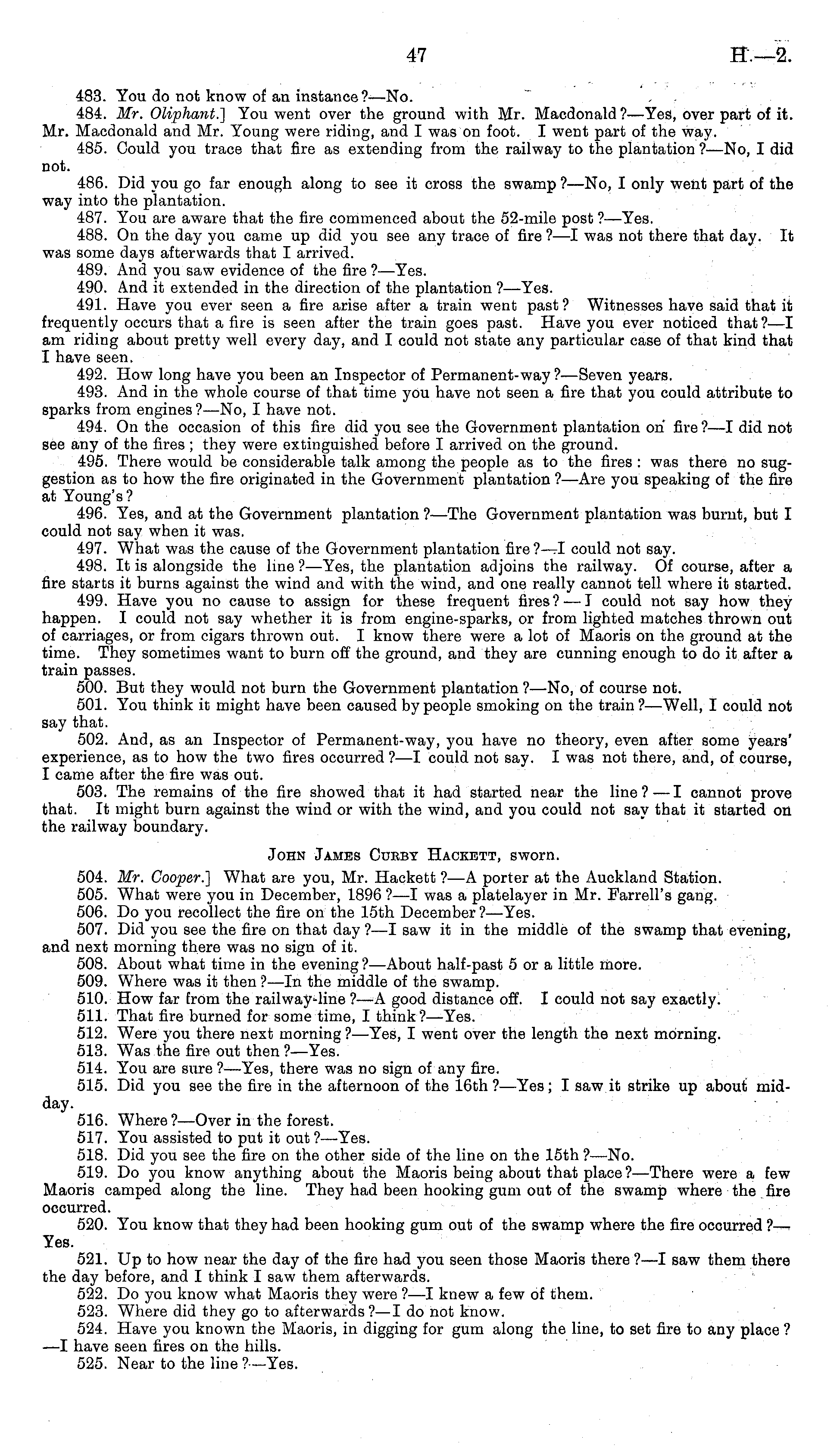 483. You do not know of an instance ?—No. 484. Mr. Oliphant.] You went over the ground with Mr. Macdonald?—Yes, over part of it. Mr. Macdonald and Mr. Young were riding, and I was on foot. I went part of the way. 485. Could you trace that fire as extending from the railway to the plantation?—No, I did not. 486. Did you go far enough along to see it cross the swamp ?—No, I only went part of the way into the plantation. 487. You are aware that the fire commenced about the 52-mile post ?—Yes. 488. On the day you came up did you see any trace of fire ?—I was not there that day. It was some days afterwards that I arrived. 489. And you saw evidence of the fire ? —Yes. 490. And it extended in the direction of the plantation ?—Yes. 491. Have you ever seen a fire arise after a train went past? Witnesses have said that it frequently occurs that a fire is seen after the train goes past. Have you ever noticed that?—l am riding about pretty well every day, and I could not state any particular case of that kind that I have seen. 492. How long have you been an Inspector of Permanent-way ?—Seven years. 493. And in the whole course of that time you have not seen a fire that you could attribute to sparks from engines?—No, I have not. 494. On the occasion of this fire did you see the Government plantation on fire ?—I did not see any of the fires ; they were extinguished before I arrived on the ground. 495. There would be considerable talk among the people as to the fires : was there no suggestion as to how the fire originated in the Government plantation ?—Are you speaking of the fire at Young's ? 496. Yes, and at the Government plantation ?—The Government plantation was burnt, but I could not say when it was. 497. What was the cause of the Government plantation fire?—l could not say. 498. It is alongside the line ?—Yes, the plantation adjoins the railway. Of course, after a fire starts it burns against the wind and with the wind, and one really cannot tell where it started. 499. Have you no cause to assign for these frequent fires? — I could not say how they happen. I could not say whether it is from engine-sparks, or from lighted matches thrown out of carriages, or from cigars thrown out. I know there were a lot of Maoris on the ground at the time. They sometimes want to burn off the ground, and they are cunning enough to do it after a train passes. 500. But they would not burn the Government plantation ?—No, of course not. 501. You think it might have been caused by people smoking on the train ?—Well, I could not say that. 502. And, as an Inspector of Permanent-way, you have no theory, even after some years' experience, as to how the two fires occurred ? —I could not say. I was not there, and, of course, I came after the fire was out. 503. The remains of the fire showed that it had started near the line?—l cannot prove that. It might burn against the wind or with the wind, and you could not say that it started on the railway boundary. John James Curby Hackett, sworn. 504. Mr. Cooper.] What are you, Mr. Hackett ? —A porter at the Auckland Station. 505. What were you in December, 1896 ?—I was a platelayer in Mr. Farrell's gang. 506. Do you recollect the fire on the 15th December ?—Yes. 507. Did you see the fire on that day ? —I saw it in the middle of the swamp that evening, and next morning there was no sign of it. 508. About what time in the evening?— About half-past 5 or a little more. 509. Where was it then ? —ln the middle of the swamp. 510. How far from the railway-line ?—A good distance off. I could not say exactly. 511. That fire burned for some time, I think?— Yes. 512. Were you there next morning?— Yes, I went over the length the next morning. 513. Was the fire out then ?—Yes. 514. You are sure ?—Yes, there was no sign of any fire. 515. Did you see the fire in the afternoon of the 16th ?—Yes; I saw it strike up about midday. 516. Where ?—Over in the forest. 517. You assisted to put it out?— Yes. 518. Did you see the fire on the other side of the line on the 15th ?—No. 519. Do you know anything about the Maoris being about that place ?—There were a few Maoris camped along the line. They had been hooking gum out of the swamp where the fire occurred. 520. You know that they had been hooking gum out of the swamp where the fire occurred ?— Yes. 521. Up to how near the day of the fire had you seen those Maoris there ?—I saw them there the day before, and I think I saw them afterwards. 522. Do you know what Maoris they were ?—I knew a few of them. 523. Where did they go to afterwards?—l do not know. 524. Have you known the Maoris, in digging for gum along the line, to set fire to any place ? —I have seen fires on the hills. 525. Near to the line ?—Yes.