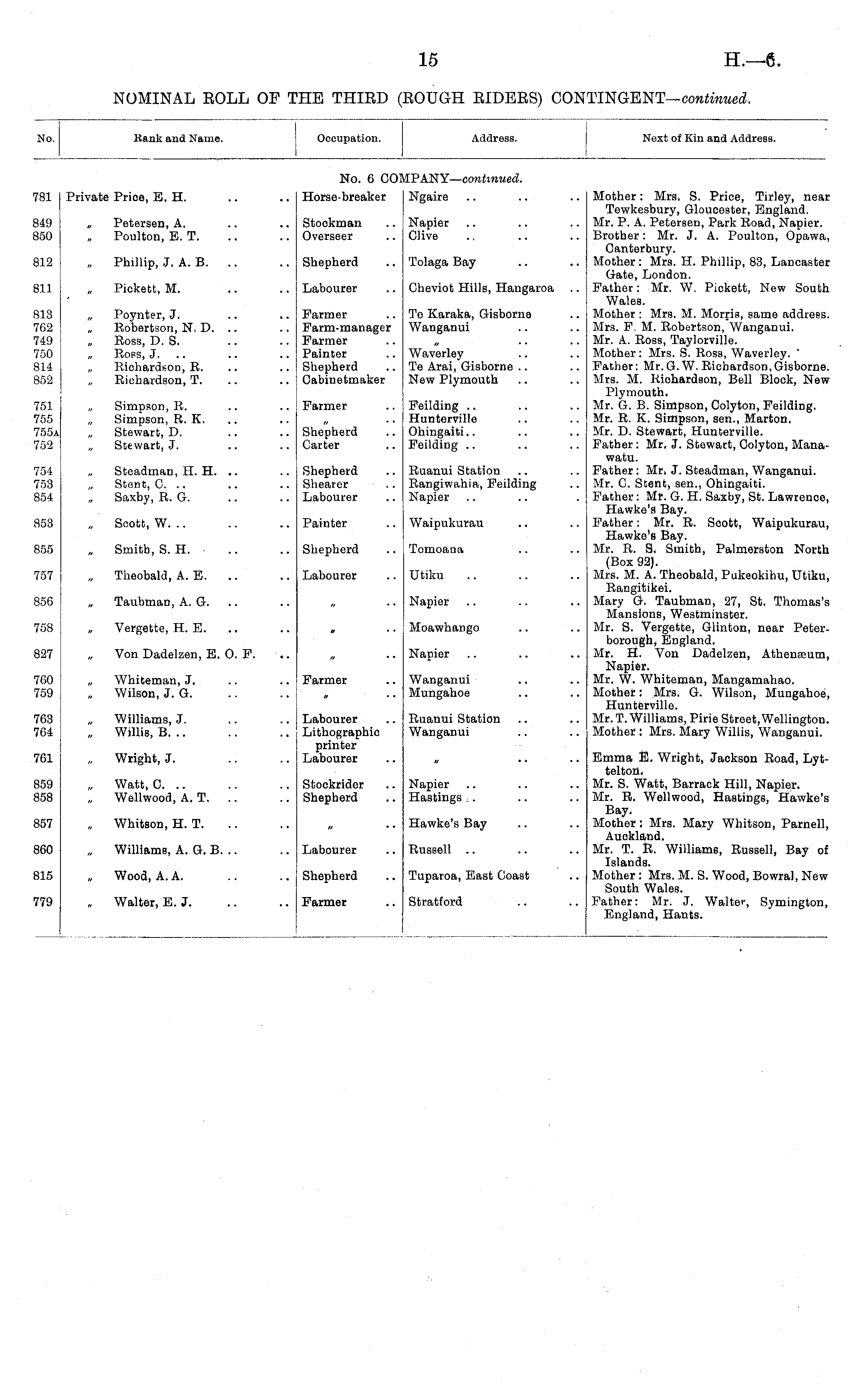 No. Bank and Name. Occupation. Address. Next of Kin and Address. No. 6 CO: IPANY— continued. 781 Private Prioe, E. H. Horse-breaker Ngaire Mother: Mrs. S. Prioe, Tirley, near Tewkesbury, Gloucester, England. Mr. P. A. Petersen, Park Road, Napier. Brother: Mr. J. A. Poulton, Opawa, Canterbury. Mother: Mrs. H. Phillip, 83, Lancaster Gate, London. Father: Mr. W. Pickett, New South Wales. Mother : Mrs. M. Morris, same address. Mrs. F. M. Bobertson, Wanganui. Mr. A. Boss, Taylorville. Mother: Mrs. S. Boss, Waverley. Father: Mr.G. W. Bichardson,Gisborne. Mrs. M. Bichardson, Bell Block, New Plymouth. Mr. G. B. Simpson, Colyton, Feilding, Mr. R. K. Simpson, sen., Marton. Mr. D. Stewart, Hunterville. Father: Mr. J. Stewart, Colyton, Manawatu. Father : Mr. J. Steadman, Wanganui. Mr. C. Stent, sen., Ohingaiti. Father: Mr. G. H. Saxby, St. Lawrence, Hawke's Bay. Father: Mr. E. Scott, Waipukurau, Hawke's Bay. Mr. B. S. Smith, Palmerston North (Box 92). Mrs. M. A. Theobald, Pukeokihu, Utiku, Bangitikei. Mary G. Taubman, 27, St. Thomas's Mansions, Westminster. Mr. S. Vergette, Glinton, near Peterborough, England. Mr. H. Von Dadelzen, Athenaeum, Napier. Mr. W. Whiteman, Mangamahao. Mother: Mrs. G. Wilson, Mungahoe, Hunterville. Mr. T. Williams, Pirie Street,Wellington. Mother : Mrs. Mary Willis, Wanganui. 849 850 „ Petersen, A. Poulton, E. T. Stockman Overseer Napier Olive 812 Phillip, J. A. B. Shepherd Tolaga Bay 811 Piokett, M. Labourer Cheviot Hills, Hangaroa 813 762 749 750 814 852 „ Poynter, J. Robertson, N, D. Boss, D. S. „ Boss, J. „ Richardson, E. „ Richardson, T. Farmer Farm-manager Farmer Painter Shepherd Cabinetmaker Te Karaka, Gisborna Waaganui Waverley Te Arai, Gisborne .. New Plymouth 751 755 755a 752 „ Simpson, R. Simpson, R. K. Stewart, D. „ Stewart, J. Farmer Shepherd Carter Feilding Hunterville Ohingaiti.. Feilding .. 754 753 854 Steadman, H. H. .. Stent, C. .. Saxby, R. G. Shepherd Shearer Labourer Buanui Station Bangiwahia, Feilding Napier 853 Scott, W. .. Painter Waipukurau 855 Smith, S. H. Shepherd Tomoana 757 Theobald, A. E. Labourer Utiku 856 Taubman, A. G. Napier 758 Vergette, H. E. Moawhango 827 Von Dadelzen, E. 0. F. Napier 760 759 Whiteman, J. „ Wilson, J. G. Farmer Wanganui Mungahoe 763 764 „ Williams, J. „ Willis, B. .. Labourer Lithographic printer Labourer Euanui Station Wanganui 761 „ Wright, J. Emma E. Wright, Jackson Boad, Lyttelton. Mr. S. Watt, Barrack Hill, Napier. Mr. R. Wellwood, Hastings, Hawke's Bay. Mother: Mrs. Mary Whitson, Parnell, Auckland. Mr. T. E. Williams, Bussell, Bay of Islands. Mother : Mrs. M. S. Wood, Bowral, New South Wales. Father: Mr. J. Walter, Symington, England, Hants. 859 858 „ Watt, C. .. Wellwood, A. T. .. Stockrider Shepherd Napier Hastings 857 „ Whitson, H. T. Hawke's Bay 860 Williams, A. G. B. .. Labourer Bussell 815 Wood, A. A. Shepherd Tuparoa, East Coast 779 „ Walter, E. J. Farmer Stratford