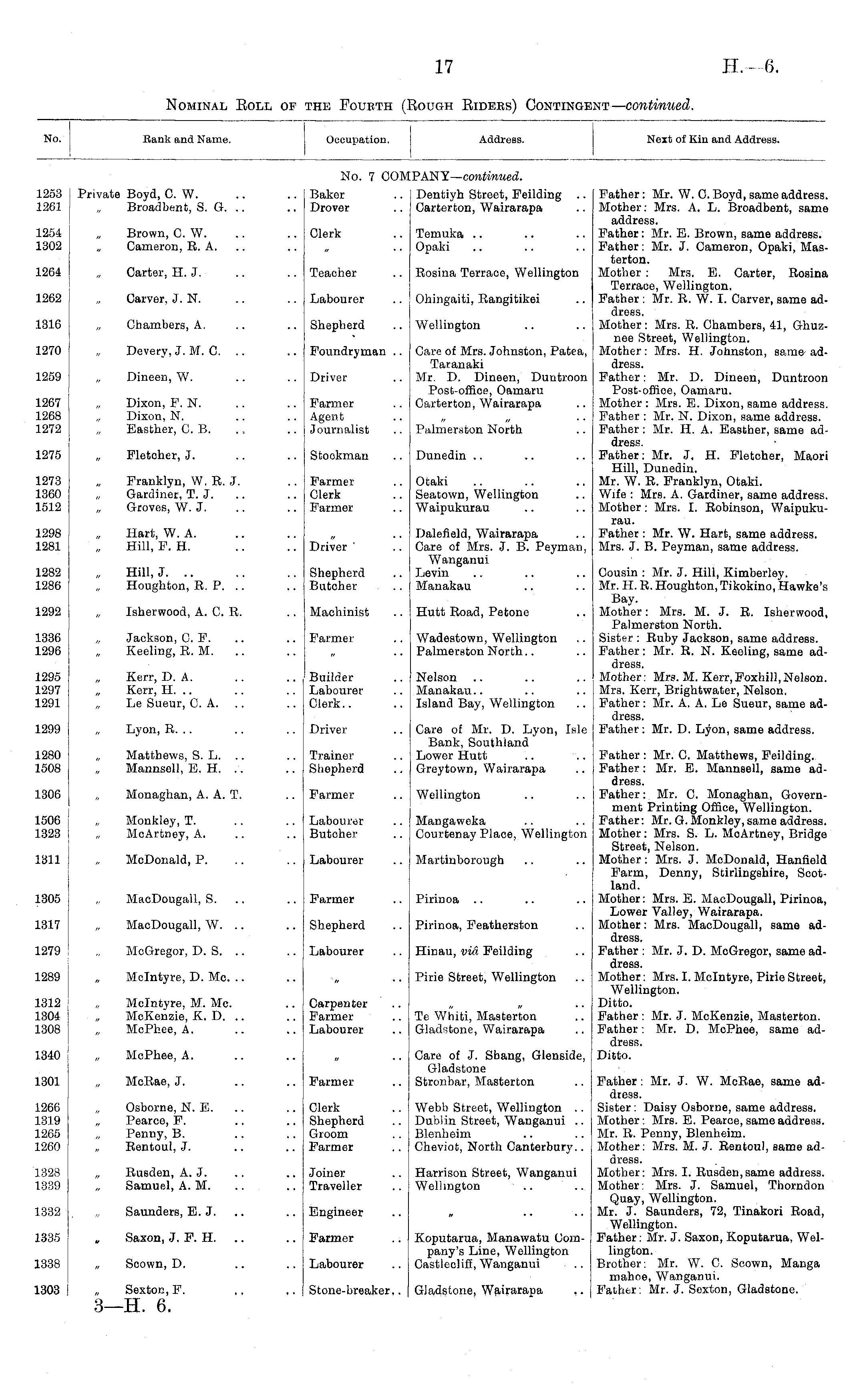 No. Bank and Name. Occupation. Address. Next of Kin and Address. No. 7 COT TANY— continued. 1253 1261 Private Boyd, C. W. Broadbent, S. G. Baker Drover Dentiyh Street, Feilding Carterton, Wairarapa Father: Mr. W. C. Boyd, same address. Mother: Mrs. A. L. Broadbent, same address. Father: Mr. E. Brown, same address. Father: Mr. J. Cameron, Opaki, Masterton. Mother : Mr3. E. Carter, Rosina Terrace, Wellington. Father : Mr. R. W. I. Carver, same address. Mother: Mrs. R. Chambers, 41, Ghuznee Street, Wellington. Mother: Mrs. H. Johnston, same address. Father: Mr. D. Dineen, Duntroon Post-office, Oamaru. Mother : Mrs. E. Dixon, same address. Father : Mr. N. Dixon, same address. Father: Mr. H. A. Easther, same address. Father: Mr. J. H. Fletcher, Maori Hill, Dunedin. Mr. W. B. Franklyn, Otaki. Wife : Mrs. A. Gardiner, same address. Mother: Mrs. I. Robinson, Waipukurau. Father : Mr. W. Hart, same address. Mrs. J. B. Peyman, same address. 1254 1302 Brown, C. W. „ Cameron, R. A. Clerk Temuka Opaki 1264 Carter, H. J. Teacher Bosina Terraoo, Wellington 1262 Carver, J. N. Labourer Ohingaiti, Rangitikei 1816 „ Chambers, A. Shepherd Wellington 1270 1259 Devery, J. M. C. Dineen, W. Foundryman .. Driver Care of Mrs. Johnston, Patea, Taranaki Mr. D. Dineen, Duntroon Post-office, Oamaru Carterton, Wairarapa 1267 1268 1272 Dixon, F. N. Dixon, N. Easther, C. B. Farmer Agent Journalist Palmerstou North 1275 Fleteher, J. Stockman Dunedin 1273 1360 1512 Franklyn, W. R. J. Gardiner, T. J. Groves, W. J. Farmer Clerk Farmer Otaki Seatown, Wellington Waipukurau 1298 1281 Hart, W. A. Hill, F. H. Driver Dalefield, Wairarapa Care of Mrs. J. B. Peyman, Wanganui Levin Manakau 1282 1286 Hill, J. .. Houghton, R. P. .. Shepherd Butcher Cousin : Mr. J. Hill, Kimberley. Mr. H. R. Houghton, Tikokino, Hawke's Bay. Mother: Mrs. M. J. B. Isherwood, Palmerston North. Sister : Ruby Jackson, same address. Father: Mr. R. N. Keeling, same address. Mother: Mrs. M. Kerr,Foxhill,Nelson. Mrs. Kerr, Brightwater, Nelson. Father: Mr. A. A. Le Sueur, same address. Father: Mr. D. Lyon, same address. 1292 „ Isherwood, A. C. B. Machinist Hutt Boad, Petone 1336 1296 Jackson, C. F. Keeling, R. M. Farme c Wadestown, Wellington Palmerston North 1295 1297 1291 Kerr, D. A. Kerr, H. .. „ Le Sueur, C. A. Builder Labourer Clerk.. Nelson Manakau.. Island Bay, Wellington 1299 „ Lyon, B. .. Driver Care of Mr. D. Lyon, Isle Bank, Southland Lower Hntt Greytown, Wairarapa 1280 1508 Matthews, S. L. Mannsell, B. H. Trainer Shepherd Father : Mr. C. Matthews, Feilding. Father: Mr. E. Mannsell, same address. Father: Mr. C. Monaghan, Government Printing Office, Wellington. Father: Mr. G. Monkley, same address. Mother: Mrs. S. L. MoArtney, Bridge Street, Nelson. Mother: Mrs. J. McDonald, Hanfield Farm, Denny, Stirlingshire, Scotland. Mother: Mrs. E. MacDougall, Pirinoa, Lower Valley, Wairarapa. Mother: Mrs. MacDougall, same address. Father : Mr. J. D. MoGregor, same address. Mother: Mrs. I. Mclntyre, Pirie Street, Wellington. Ditto. Father : Mr. J. McKenzie, Masterton. Father: Mr. D. McPhee, same address. Ditto. 1306 Monaghan, A. A. T. Farmer Wellington 1506 1323 ■ Monkley, T. „ McArtiiey, A. Labourer Butcher Mangaweka Courtenay Place, Wellington 1311 McDonald, P. Labourer Martinborough 1305 MacDougall, S. Farmer Pirinoa 1317 MacDougall, W. .. Shepherd Pirinoa, Featherston 1279 McGregor, D. S. Labourer Hinau, via Peilding 1289 Mclntyre, D. Mo. .. Pirie Street, Wellington 1312 1304 1308 Mclntyre, M. Me. McKenzie, K. D. McPhee, A. Carpenter Farmer Labourer Te Whiti, Maaterton Gladstone, Wairarapa 1340 1301 McPhee, A. Farmer Care of J. Shang, Glenside, Gladstone Stronbar, Masterton McRae, J. Father: Mr. J. W. McBae, same address. Sister: Daisy Osborne, same address. Mother: Mrs. E. Pearce, same address. Mr. B. Penny, Blenheim. Mother: Mrs. M. J. Rentoul, same address. Mother: Mrs. I. Rusden,same address. Mother: Mrs. J. Samuel, Thorndon Quay, Wellington. Mr. J. Saunders, 72, Tinakori Boad, Wellington. Father: Mr. J. Saxon, Koputarua, Wellington. Brother: Mr. W. C. Scown, Manga mahoe, Wanganui. Father: Mr. J. Sexton, Gladstone. 1266 1319 1265 1260 Osborne, N. E. Pearce, F. Penny, B. Rentoul, J. Clerk Shepherd Groom Farmer Webb Street, Wellington .. Dublin Street, Wanganui .. Blenheim Cheviot, North Canterbury.. 1328 1339 „ Rusden, A. J. Samuel, A. M. Joiner Traveller Harrison Street, Wanganui Wellington .. 1332 „ Saunders, E.J. Engineer 1335 1338 Saxon, J. F. H. .. Farmer Labourer Koputarua, Manawatu Company's Line, Wellington Castleoliff, Wanganui „ Scown, D. 1303 Sexton, F. Stone-breaker.. Gladstone, Wairarapa ,.