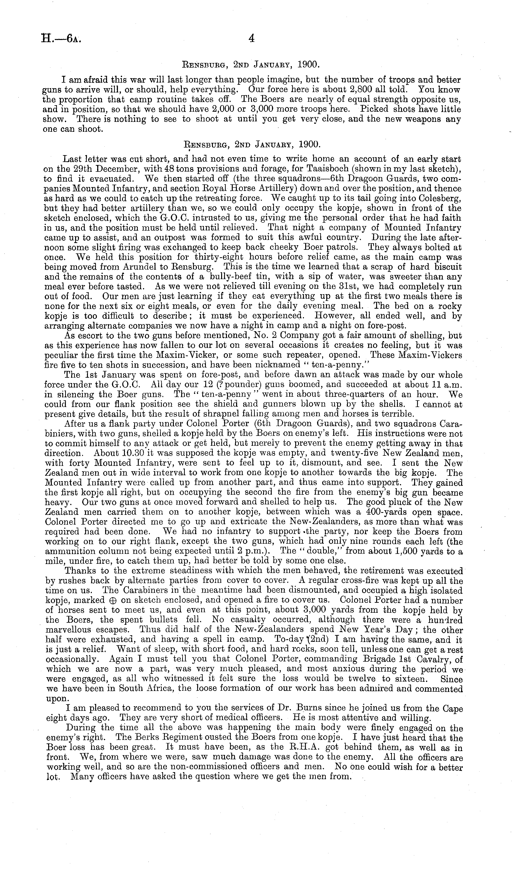 Ebnsbueo, 2nd Januaey, 1900. I am afraid this war will last longer than people imagine, but the number of troops and better guns to arrive will, or should, help everything. Our force here is about 2,800 all told. You know the proportion that camp routine takes off. The Boers are nearly of equal strength opposite us, and in position, so that we should have 2,000 or 3,000 more troops here. Picked shots have little show. There is nothing to see to shoot at until you get very close, and the new weapons any one can shoot. Eensbueg, 2nd Januaby, 1900. Last letter was cut short, and had not even time to write home an account of an early start on the 29th December, with 48 tons provisions and forage, for Taaisboch (shown in my last sketch), to find it evacuated. We then started off (the three squadrons—6th Dragoon Guards, two companies Mounted Infantry, and section Royal Horse Artillery) down and over the position, and thence as hard as we could to catch up the retreating force. We caught up to its tail going into Colesberg, but they had better artillery than we, so we could only occupy the kopje, shown in front of the sketch enclosed, which the G.O.C. intrusted to us, giving me the personal order that he had faith in us, and the position must be held until relieved. That night a company of Mounted Infantry came up to assist, and an outpost was formed to suit this awful country. During the late afternoon some slight firing was exchanged to keep back cheeky Boer patrols. They always bolted at once. We held this position for thirty-eight hours before relief came, as the main camp was being moved from Arundel to Rensburg. This is the time we learned that a scrap of hard biscuit and the remains of the contents of a bully-beef tin, with a sip of water, was sweeter than any meal ever before tasted. As we were not relieved till evening on the 31st, we had completely run out of food. Our men are just learning if they eat everything up at the first two meals there is none for the next six or eight meals, or even for the daily evening meal. The bed on a rocky kopje is too difficult to describe; it must be experienced. However, all ended well, and by arranging alternate companies we now have a night in camp and a night on fore-post. As escort to the two guns before mentioned, No. 2 Company got a fair amount of shelling, but as this experience has now fallen to our lot on several occasions it creates no feeling, but it was peculiar the first time the Maxim-Vicker, or some such repeater, opened. These Maxim-Vickers fire five to ten shots in succession, and have been nicknamed " ten-a-penny." The Ist January was spent on fore-post, and before dawn an attack was made by our whole force under the G.O.C. AH day our 12 (?pounder) guns boomed, and succeeded at about 11 a.m. in silencing the Boer guns. The "ten-a-penny" went in about three-quarters of an hour. We could from our flank position see the shield and gunners blown up by the shells. I cannot at present give details, but the result of shrapnel falling among men and horses is terrible. After us a flank party under Colonel Porter (6th Dragoon Guards), and two squadrons Carabiniers, with two guns, shelled a kopje held by the Boers on enemy's left. His instructions were not to commit himself to any attack or get held, but merely to prevent the enemy getting away in that direction. About 10.30 it was supposed the kopje was empty, and twenty-five New Zealand men, with forty Mounted Infantry, were sent to feel up to it, dismount, and see. I sent the New Zealand men out in wide interval to work from one kopje to another towards the big kopje. The Mounted Infantry were called up from another part, and thus came into support. They gained the first kopje all right, but on occupying the second the fire from the enemy's big gun became heavy. Our two guns at once moved forward and shelled to help us. The good pluck of the New Zealand men carried them on to another kopje, between which was a 400-yards open space. Colonel Porter directed me to go up and extricate the New-Zealanders, as more than what was required had been done. We had no infantry to support 4he party, nor keep the Boers from working on to our right flank, except the two guns, which had only nine rounds each left (the ammunition column not being expected until 2 p.m.). The " double," from about 1,500 yards to a mile, under fire, to catch them up, had better be told by some one else. Thanks to the extreme steadiness with which the men behaved, the retirement was executed by rushes back by alternate parties from cover to cover. A regular cross-fire was kept up all the time on us. The Carabiners in the meantime had been dismounted, and occupied a high isolated kopje, marked ©on sketch enclosed, and opened a fire to cover us. Colonel Porter had a number of horses sent to meet us, and even at this point, about 3,000 yards from the kopje held by the Boers, the spent bullets fell. No casualty occurred, although there were a hundred marvellous escapes. Thus did half of the New-Zealanders spend New Year's Day ; the other half were exhausted, and having a spell in camp. To-day i(2nd) lam having the same, and it is just a relief. Want of sleep, with short food, and hard rocks, soon tell, unless one can get a rest occasionally. Again I must tell you that Colonel Porter, commanding Brigade Ist Cavalry, of which we are now a part, was very much pleased, and most anxious during the period we were engaged, as all who witnessed it felt sure the loss would be twelve to sixteen. Since we have been in South Africa, the loose formation of our work has been admired and commented upon. I am pleased to recommend to you the services of Dr. Burns since he joined us from the Cape eight days ago. They are very short of medical officers. He is most attentive and willing. During the time all the above was happening the main body were finely engaged on the enemy's right. The Berks Regiment ousted the Boers from one kopje. I have just