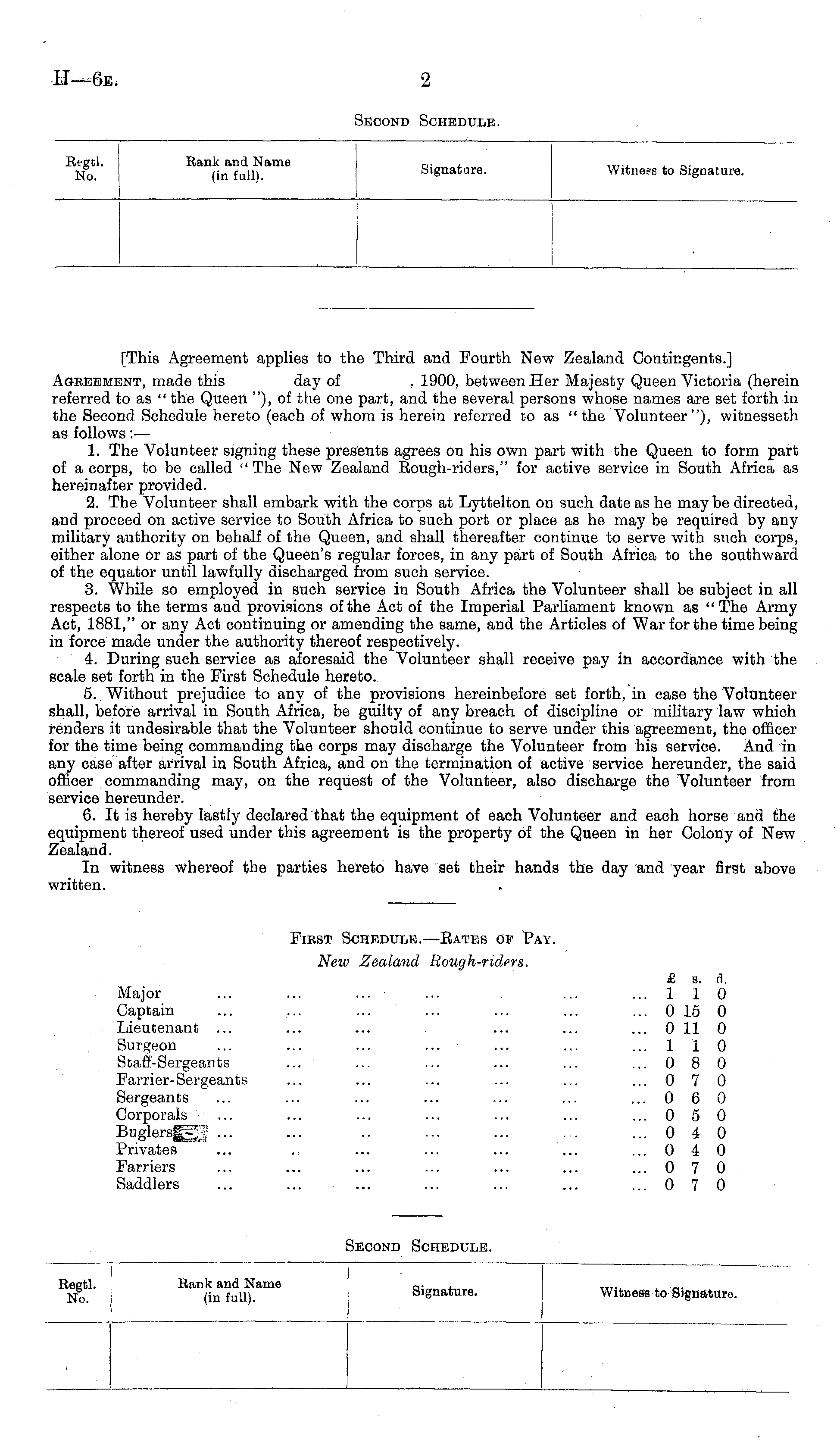 [This Agreement applies to the Third and Fourth New Zealand Contingents.] Agreement, made this day of , 1900, between Her Majesty Queen Victoria (herein referred to as " the Queen "), of the one part, and the several persons whose names are set forth in the Second Schedule hereto (each of whom is herein referred to as " the Volunteer"), witnesseth as follows: — 1. The Volunteer signing these presents agrees on his own part with the Queen to form part of a corps, to be called " The New Zealand Rough-riders," for active service in South Africa as hereinafter provided. 2. The Volunteer shall embark with the corps at Lyttelton on such date as he maybe directed, and proceed on active service to South Africa to such port or place as he may be required by any military authority on behalf of the Queen, and shall thereafter continue to serve with such corps, either alone or as part of the Queen's regular forces, in any part of South Africa to the southward of the equator until lawfully discharged from such service. 3. While so employed in such service in South Africa the Volunteer shall be subject in all respects to the terms and provisions of the Act of the Imperial Parliament known as "The Army Act, 1881," or any Act continuing or amending the same, and the Articles of War for the time being in force made under the authority thereof respectively. 4. During such service as aforesaid the Volunteer shall receive pay in accordance with the scale set forth in the First Schedule hereto. 5. Without prejudice to any of the provisions hereinbefore set forth, in case the Volunteer shall, before arrival in South Africa, be guilty of any breach of discipline or military law which renders it undesirable that the Volunteer should continue to serve under this agreement, the officer for the time being commanding the corps may discharge the Volunteer from his service. And in any case after arrival in South Africa, and on the termination of active service hereunder, the said officer commanding may, on the request of the Volunteer, also discharge the Volunteer from service hereunder. 6. It is hereby lastly declared that the equipment of each Volunteer and each horse and the equipment thereof used under this agreement is the property of the Queen in her Colony of New Zealand. In witness whereof the parties hereto have set their hands the day and year first above written.