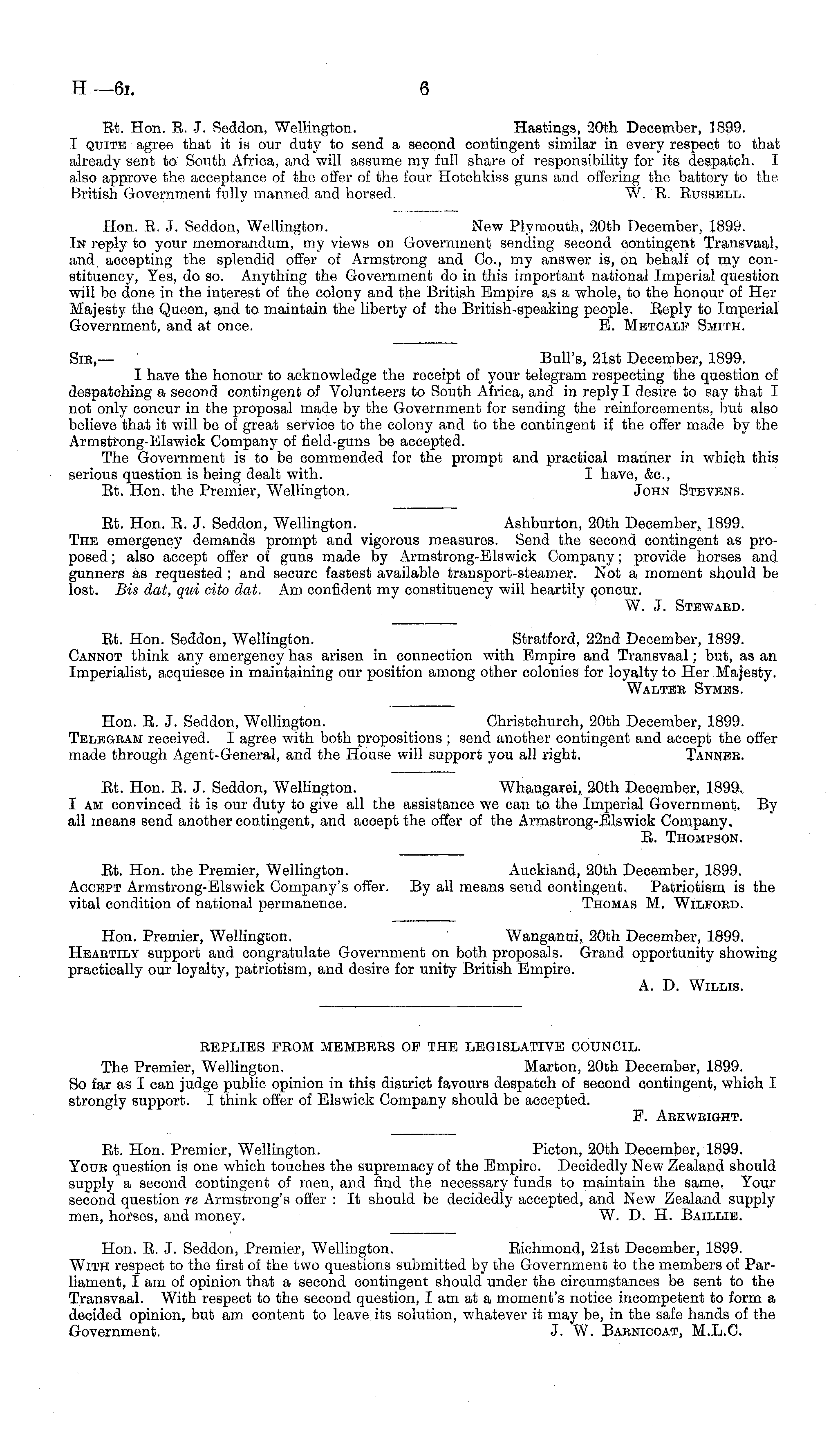 REPLIES FROM MEMBERS OP THE LEGISLATIVE COUNCIL. The Premier, Wellington. Marton, 20th December, 1899. So far as I can judge public opinion in this district favours despatch of second contingent, which I strongly support. I think offer of Elswick Company should be accepted. F. Aekweight.