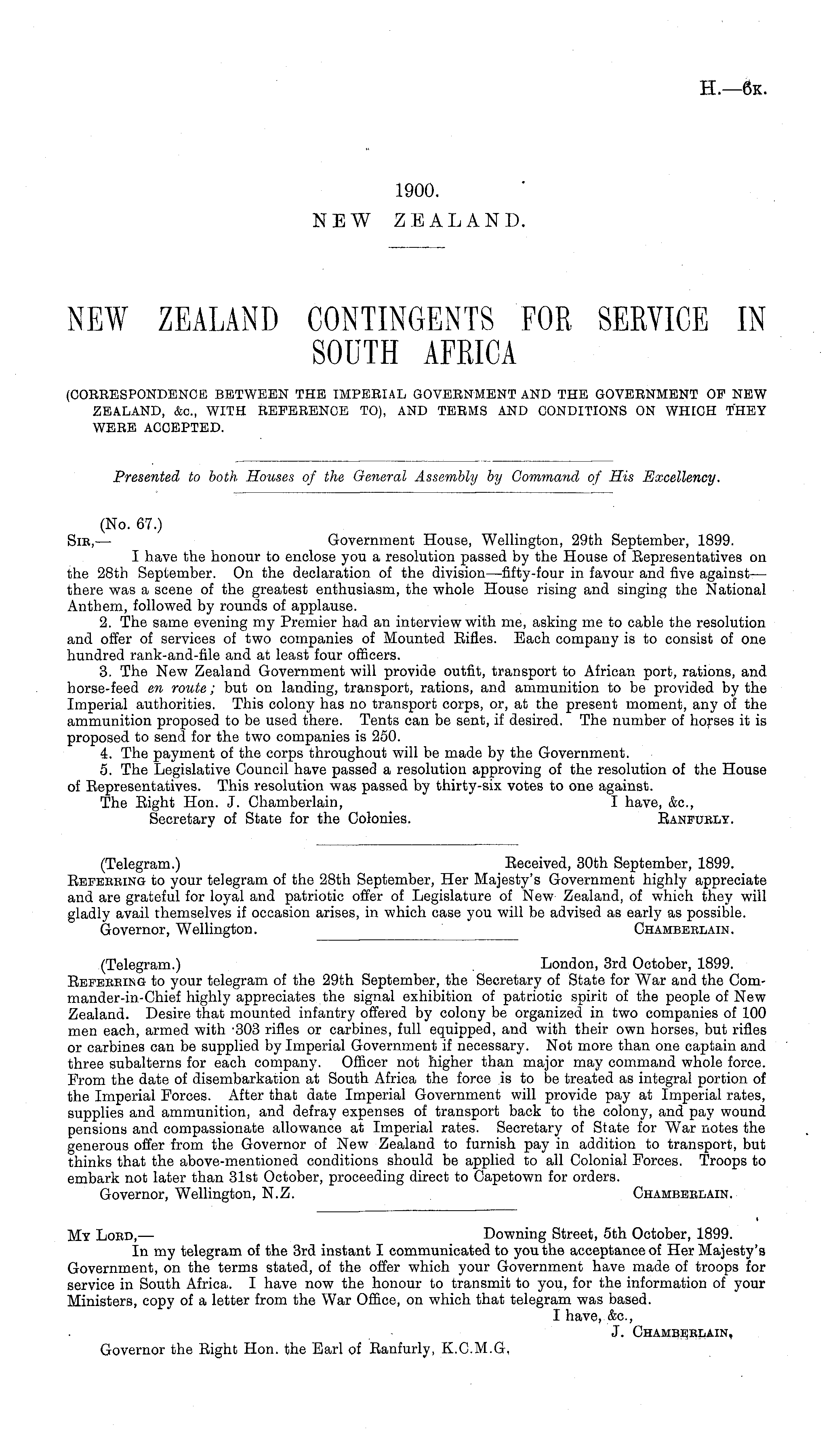 My Lord, — Downing Street, sth October, 1899. In my telegram of the 3rd instant I communicated to you the acceptance of Her Majesty's Government, on the terms stated, of the offer which your Government have made of troops for service in South Africa. I have now the honour to transmit to you, for the information of your Ministers, copy of a letter from the War Office, on which that telegram was based. I have, &c, J. Chamberlain, Governor the Right Hon. the Earl of Ranfurly, K.C.M.G,