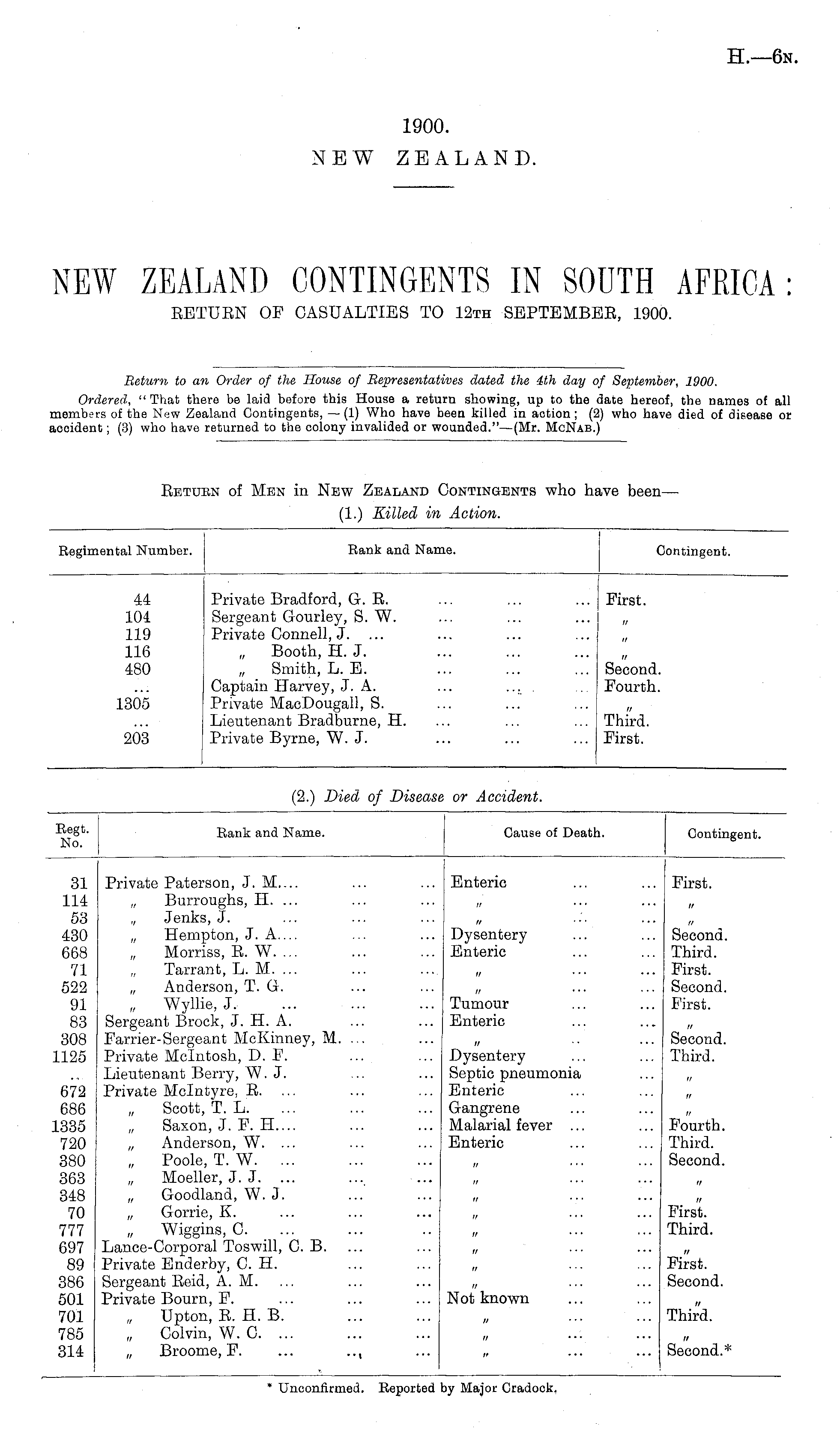 Return to an Order of the House of Representatives dated the 4th day of September, 1900. Ordered, " TViat there be laid before this House a return showing, up to the date hereof, the names of all members of the New Zealand Contingents, — (1) Who have been killed in action ; (2) who have died of disease or accident; (3) who have returned to the colony invalided or wounded."—(Mr. MoNab.)