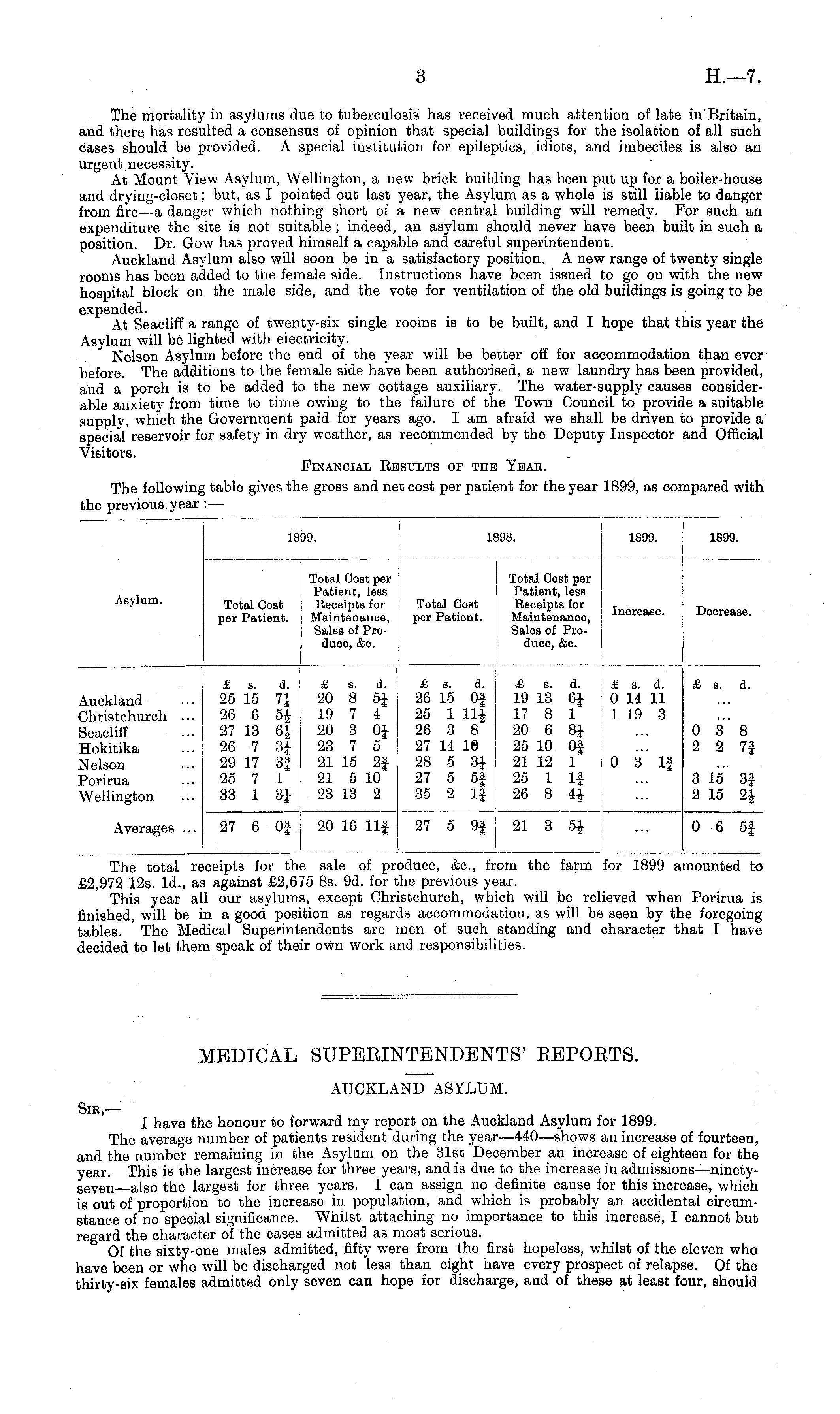 AUCKLAND ASYLUM. Sir — I have the honour to forward my report on the Auckland Asylum for 1899. The average number of patients resident during the year—440—shows an increase of fourteen, and the number remaining in the Asylum on the 31st December an increase of eighteen for the year. This is the largest increase for three years, and is due to the increase in admissions—ninetyseven also the largest for three years. I can assign no definite cause for this increase, which is out of proportion to the increase in population, and which is probably an accidental circumstance of no special significance. Whilst attaching no importance to this increase, I cannot but regard the character of the cases admitted as most serious. Of the sixty-one males admitted, fifty were from the first hopeless, whilst of the eleven who have been or who will be discharged not less than eight have every prospect of relapse. Of the thirty-six females admitted only seven can hope for discharge, and of these at least four, should