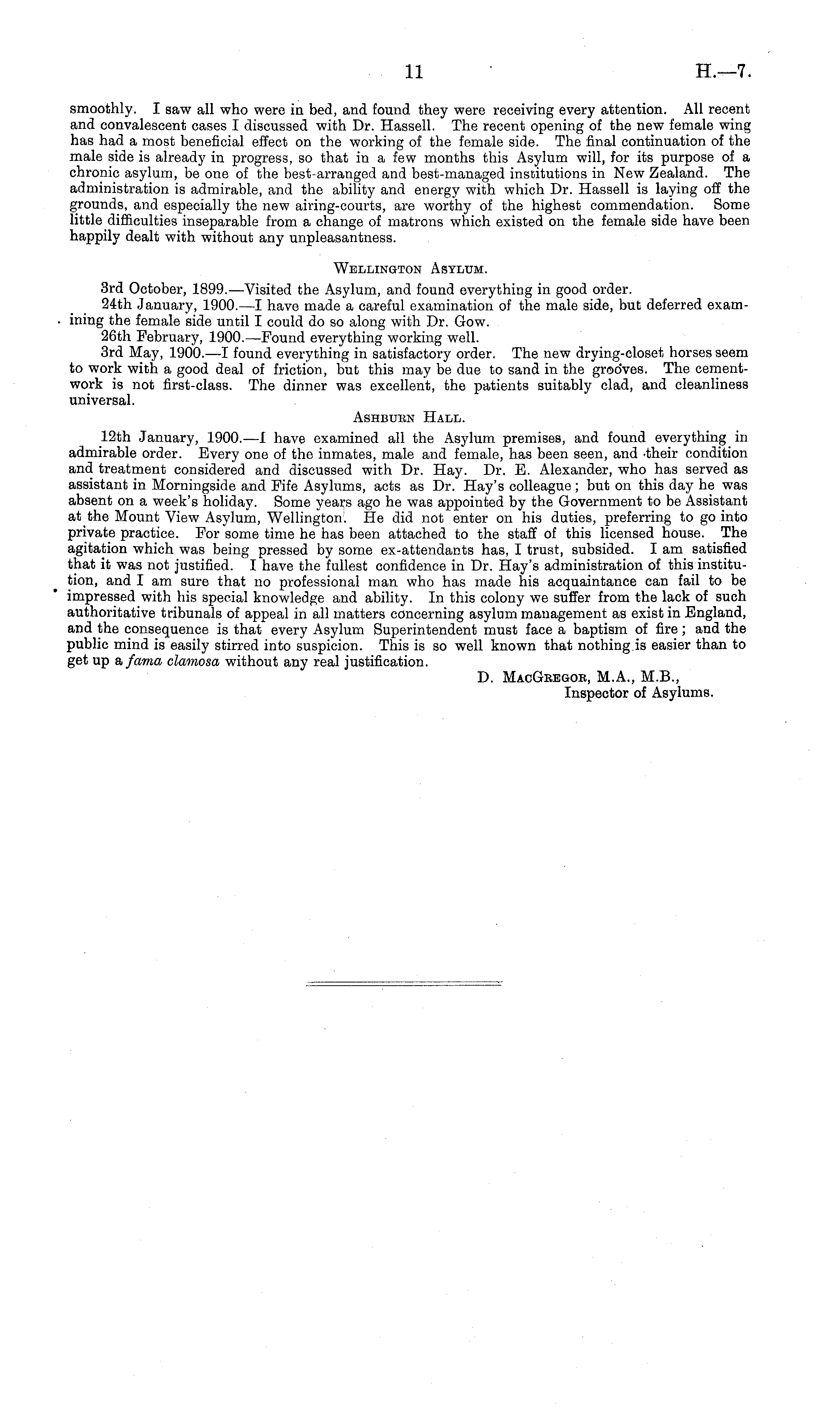 smoothly. I saw all who were in bed, and found they were receiving every attention. All recent and convalescent cases I discussed with Dr. Hassell. The recent opening of the new female wing has had a most beneficial effect on the working of the female side. The final continuation of the male side is already in progress, so that in a few months this Asylum will, for its purpose of a chronic asylum, be one of the best-arranged and best-managed institutions in New Zealand. The administration is admirable, and the ability and energy with which Dr. Hassell is laying off the grounds, and especially the new airing-courts, are worthy of the highest commendation. Some little difficulties inseparable from a change of matrons which existed on the female side have been happily dealt with without any unpleasantness. Wellington Asylum. 3rd October, 1899.—Visited the Asylum, and found everything in good order. 24th January, 1900.—1 have made a careful examination of the male side, but deferred examining the female side until I could do so along with Dr. Gow. 26th February, 1900.—Found everything working well. 3rd May, 1900.—1 found everything in satisfactory order. The new drying-closet horses seem to work with a good deal of friction, but this may be due to sand in the grooves. The cementwork is not first-class. The dinner was excellent, the patients suitably clad, and cleanliness universal. Ashburn Hall. 12th January, 1900.—1 have examined all the Asylum premises, and found everything in admirable order. Every one of the inmates, male and female, has been seen, and -their condition and treatment considered and discussed with Dr. Hay. Dr. E. Alexander, who has served as assistant in Morningside and Fife Asylums, acts as Dr. Hay's colleague; but on this day he was absent on a week's holiday. Some years ago he was appointed by the Government to be Assistant at the Mount View Asylum, Wellington. He did not enter on his duties, preferring to go into private practice. For some time he has been attached to the staff of this licensed house. The agitation which was being pressed by some ex-attendants has, I trust, subsided. lam satisfied that it was not justified. I have the fullest confidence in Dr. Hay's administration of this institution, and I am sure that no professional man who has made his acquaintance can fail to be impressed with his special knowledge and ability. In this colony we suffer from the lack of such authoritative tribunals of appeal in all matters concerning asylum management as exist in England, and the consequence is that every Asylum Superintendent must face a baptism of fire ; and the public mind is easily stirred into suspicion. This is so well known that nothing.is easier than to get up siifama clamosa without any real justification. D. MacGregor, M.A., M.8., Inspector of Asylums.