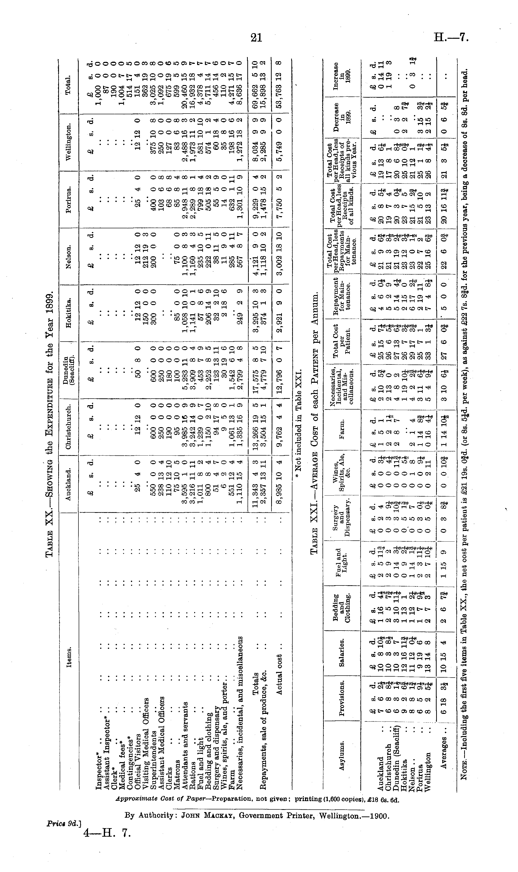 Items. Auckland. Christchurch. Dunedin (Seacliff). Hokitika. Nelson. Porirua. Wellington. Total. £ s. d. £ s. d. £ s. d. £ s. d. £ s. d. £ a. d. £ s. d. £ a. d. 1,000 0 0 87 0 0 190 0 0 1,004 7 0 514 17 5 151 4 0 362 19 3 3,025 10 8 1,092 0 0 675 19 6 599 5 5 20,460 15 9 16,932 18 7 4,378 4 7 5,711 14 7 456 14 6 110 2 0 4,271 15 7 8,636 17 0 Inspector* Assistant Inspeotor* Clerk* Medical fees* Contingencies* Official Visitors Visiting Medical Officers Superintendents Assistant Medical Officers Clerks Matrons Attendants and servants Rations Fuel and light Bedding and clothing Surgery and dispensary Wines, spirits, ale, and porter.. Farm Necessaries, incidental, and miscellaneous 25 4 0 550 0 0 238 13 4 110 12 10 75 10 5 3,595 1 0 3,216 11 11 1,011 8 2 800 8 4 51 4 7 6 2 0 551 12 4 1,110 15 4 1212 0 600 0 0 250 0 0 190 0 0 95 0 0 3,985 16 9 3,242 14 9 1,239 0 7 1,150 2 10 94 17 8 9 5 0 1,061 13 1 1,335 16 9 50 8 0 600 0 0 250 0 0 180 0 0 100 0 0 5,283 11 0 3,909 8 4 453 7 9 2,252 8 5 123 13 11 30 19 6 1,542 6 10 2,799 4 8 12 12 0 150 0 0 300 0 0 85 0 0 1,058 10 10 1,141 0 1 57 8 6 206 14 9 32 2 10 2 18 6 12 12 0 212 19 3 200 0 0 75 0 0 1,100 8 3 1,160 4 3 235 10 5 222 0 11 38 11 5 11 9 0 285 4 11 567 8 7 25' 4 0 400 0 0 103 6 8 68 6 8 85 8 4 2,948 11 8 2,289 8 1 799 18 4 505 18 2 55 5 9 14 0 0 632 1 11 1,301 10 9 1212 0 375 10 8 250 0 0 127 0 0 83 6 8 2,488 16 3 1,973 11 2 581 10 10 574 1 2 60 18 4 35 8 0 198 16 6 1,272 18 2 249 2 9 Totals Repayments, sale of produce, &c. 11,343 4 3 2,357 13 11 13,266 19 5 3,504 15 1 17,575 8 5 4,779 7 10 3,295 10 3 374 1 3 4,121 9 0 1,118 10 2 9,229 0 4 1,478 15 2 8,034 9 9 2,285 9 9 69,662 5 10 15,898 13 2 Actual cost .. 8,985 10 4 12,796 0 7 2,921 9 0 3,002 18 10 53,763 12 8 9,762 4 4 7,750 5 2 5,749 0 0 * Not included in Table XXI.