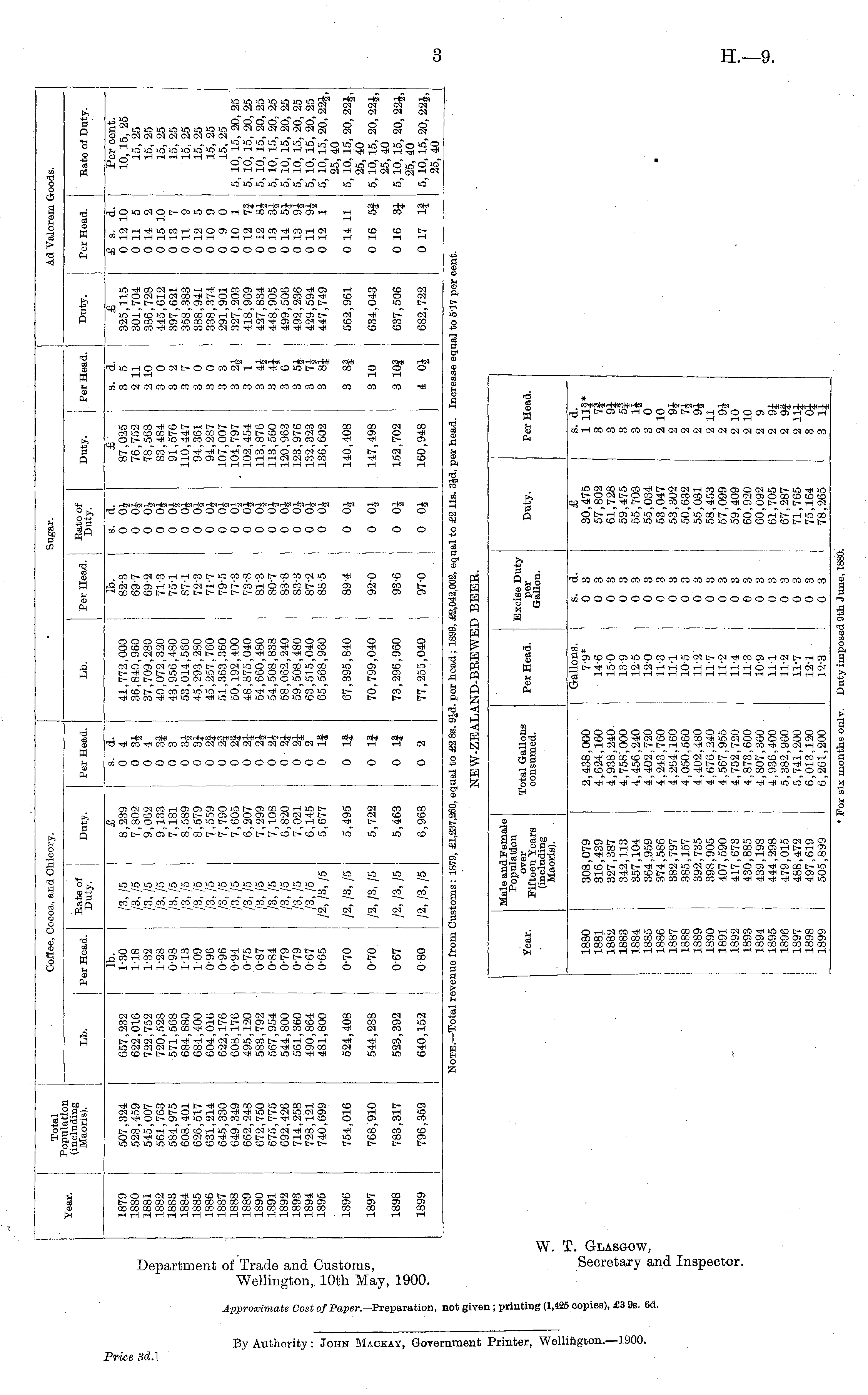 W. T. Glasgow, Department of Trade and Customs, Secretary and Inspector. Wellington, 10th May, 1900.